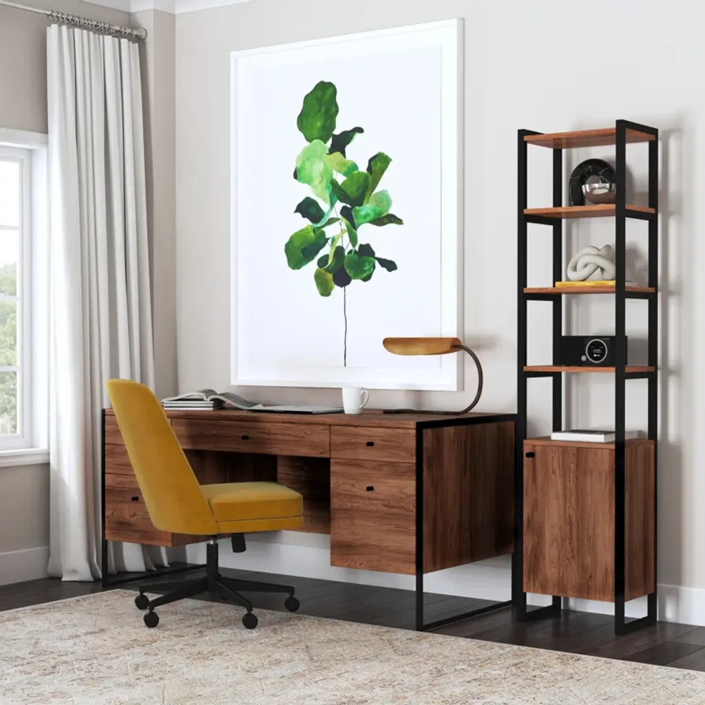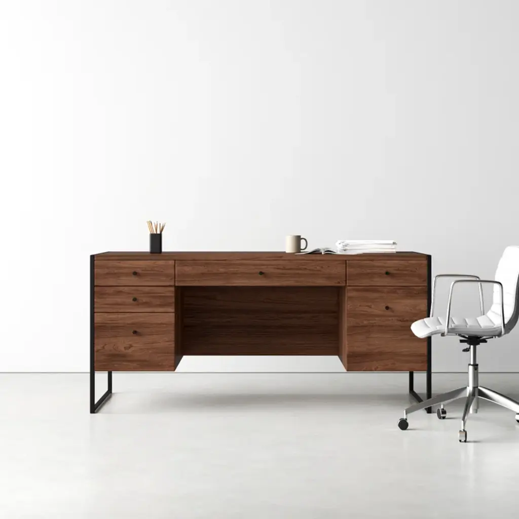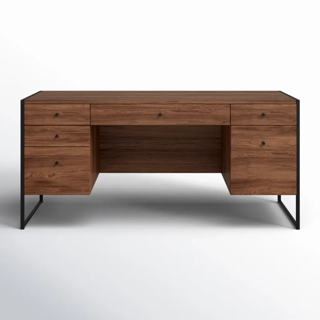 Blending rustic wood grains with sleek black steel, this executive desk infuses your office with industrial edge. Drawers set on ball-bearing glides provide plenty of space for supplies + files, while a finished back offers placement options. It arrives fully assembled – so you can get to work.