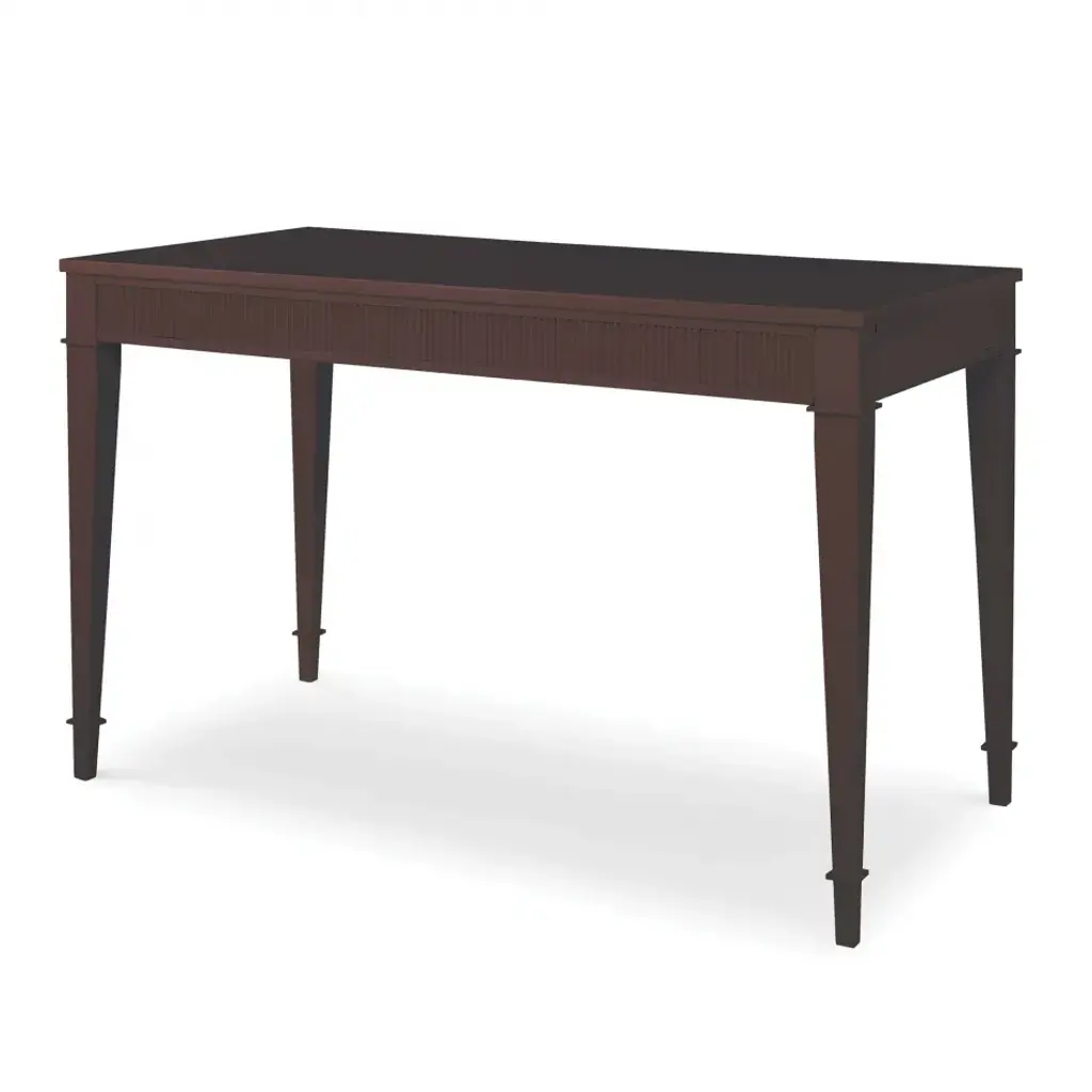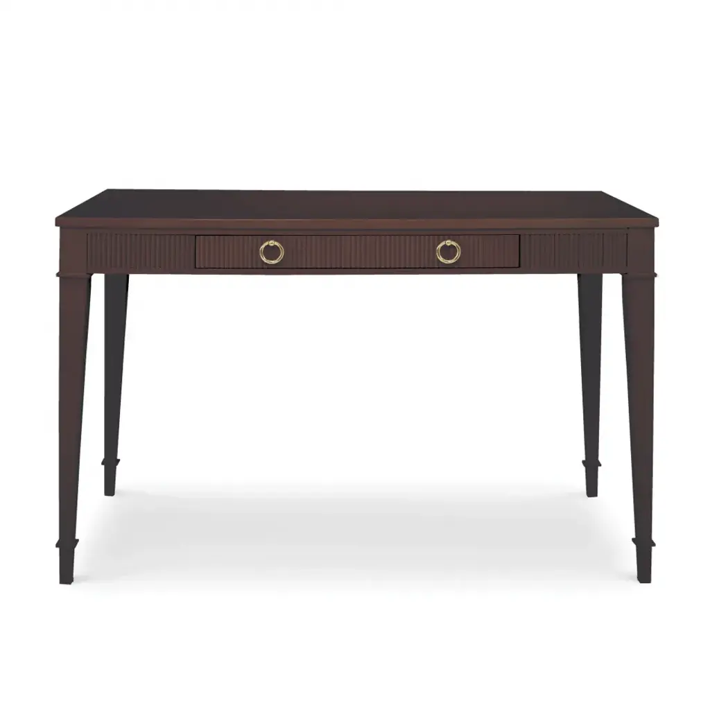 This elegant writing desk features one reeded drawer with brass ring pulls. The reeding continues around the entire apron of the desk. Tall tapered legs complete the look.