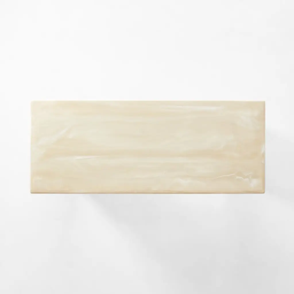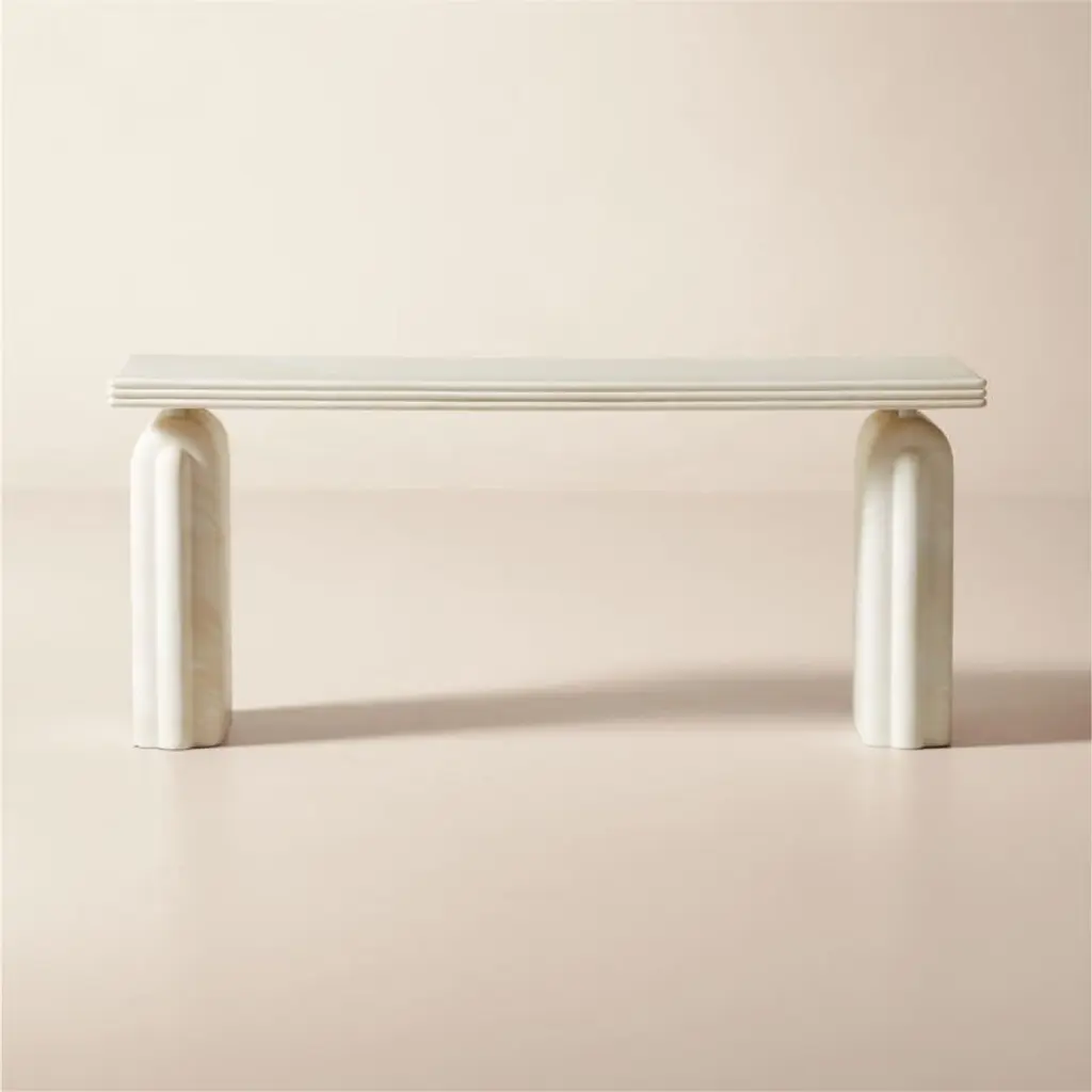 Fluid swirls of cream and warm white adorn this sleek desk by Brett Beldock. Inspired by a vintage lamp of French origin, its architectural silhouette and rounded edges evoke an Art Deco moment. At first glance, this multifunctional piece looks as though it's carved from marble, yet its resin construction requires significantly less caremaking it a fine choice for the home office and high-traffic entryways. CB2 exclusive.