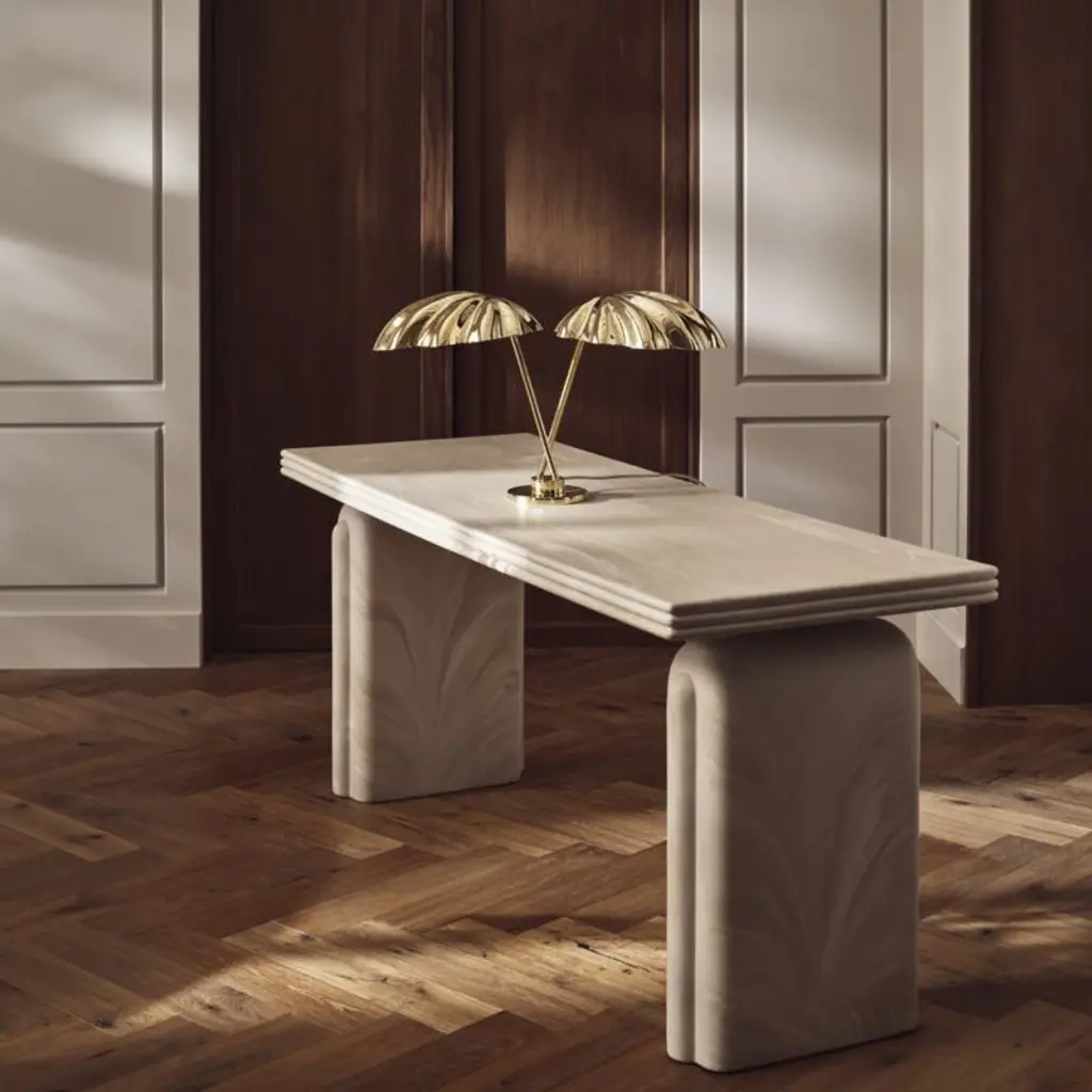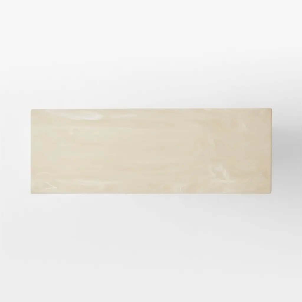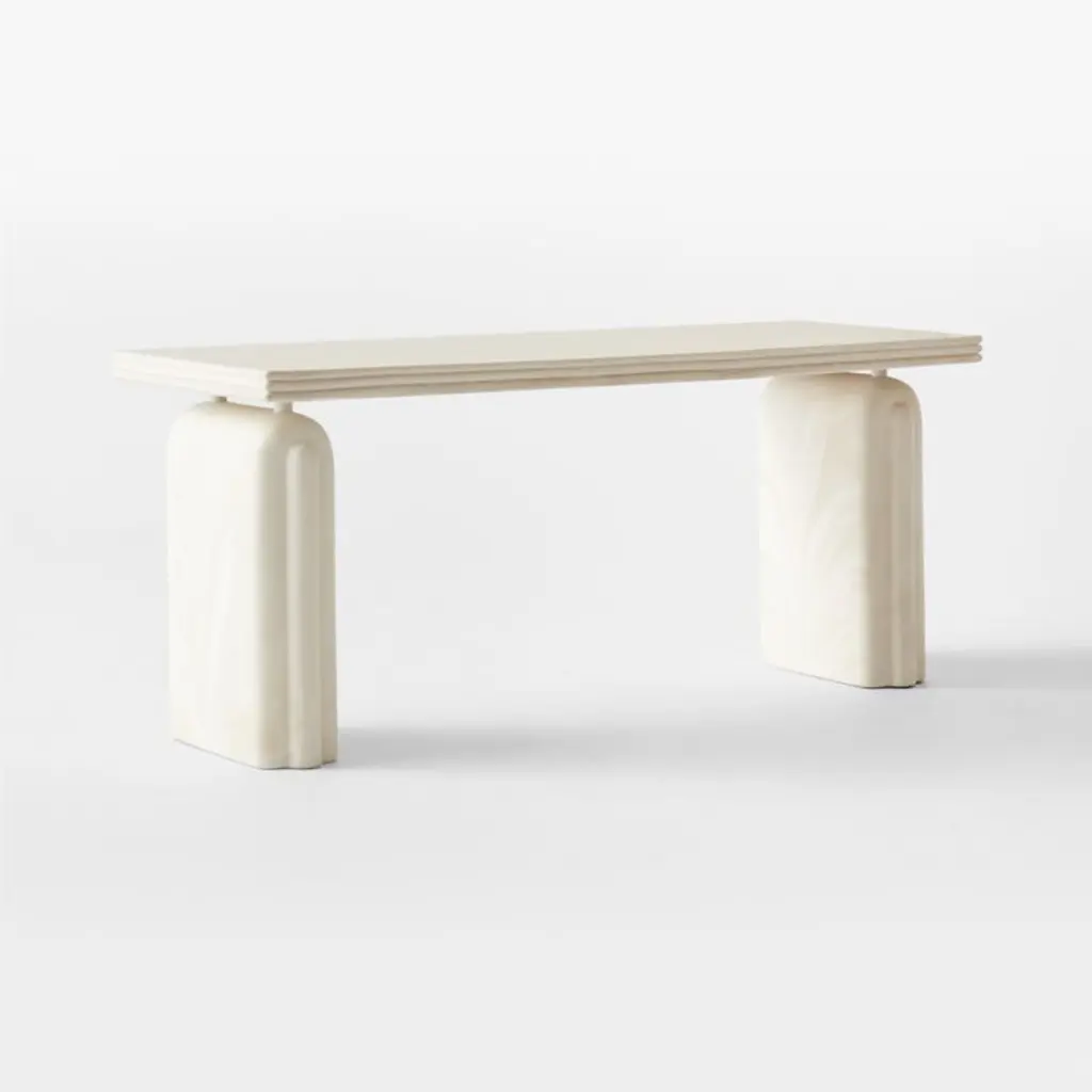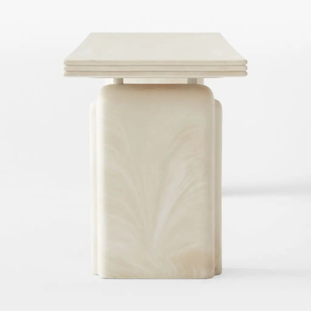 Fluid swirls of cream and warm white adorn this sleek desk by Brett Beldock. Inspired by a vintage lamp of French origin, its architectural silhouette and rounded edges evoke an Art Deco moment. At first glance, this multifunctional piece looks as though it's carved from marble, yet its resin construction requires significantly less caremaking it a fine choice for the home office and high-traffic entryways. CB2 exclusive.