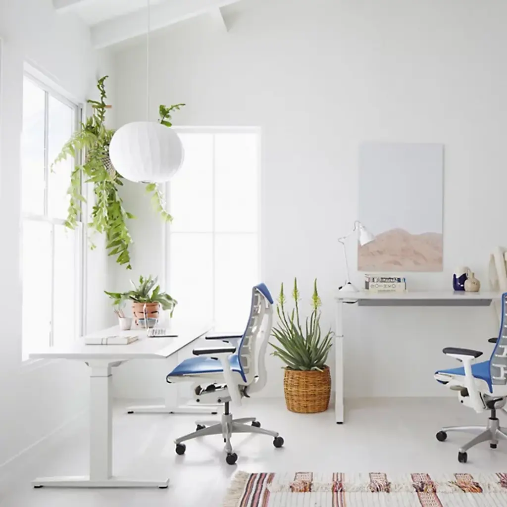 Compliment the shifting nature of the day and your body with the intuitively designed Renew Sit To Stand Desk, C Foot - Formcoat Top from Herman Miller. It’s created by Brian Alexander, a research-based artist and designer who prides himself on knowing the behaviors of everything, especially people. Alexander realizes that one’s posture is tuned to the work and what feels right. He invites the natural movement of the body with a crank that lowers and lifts the table surface. Ease of use is a key element of Alexander’s crank, making your thoughts focused on the work at hand. The durable form coat finish of the top is applied with scratch-resistance and stain-resistance in mind. The C-foot metal frame gives the piece a sturdy base while creating a handsome asymmetric silhouette.