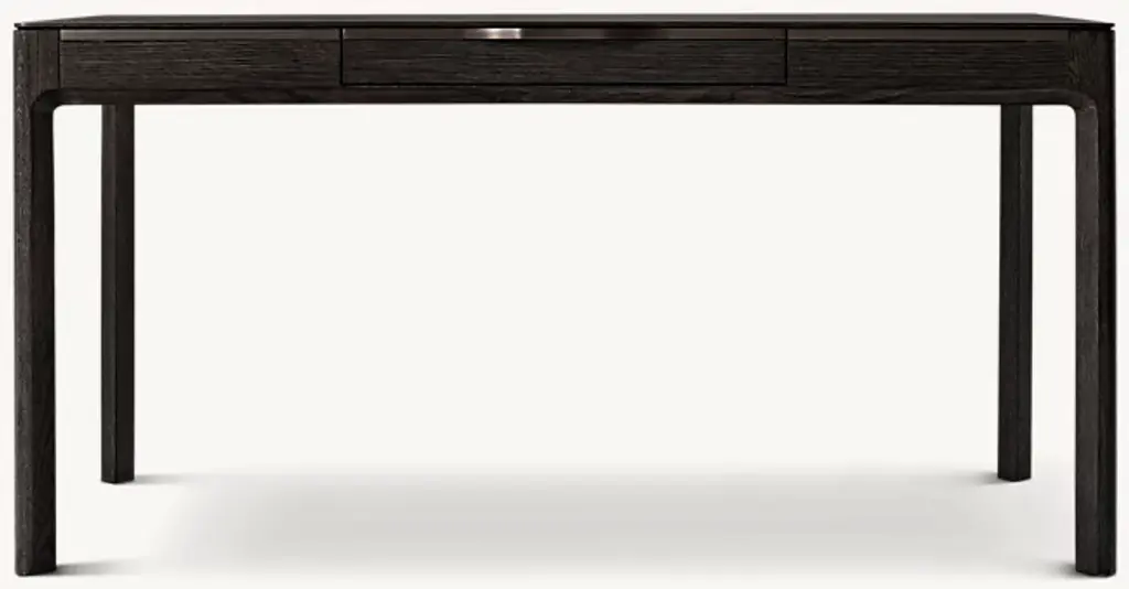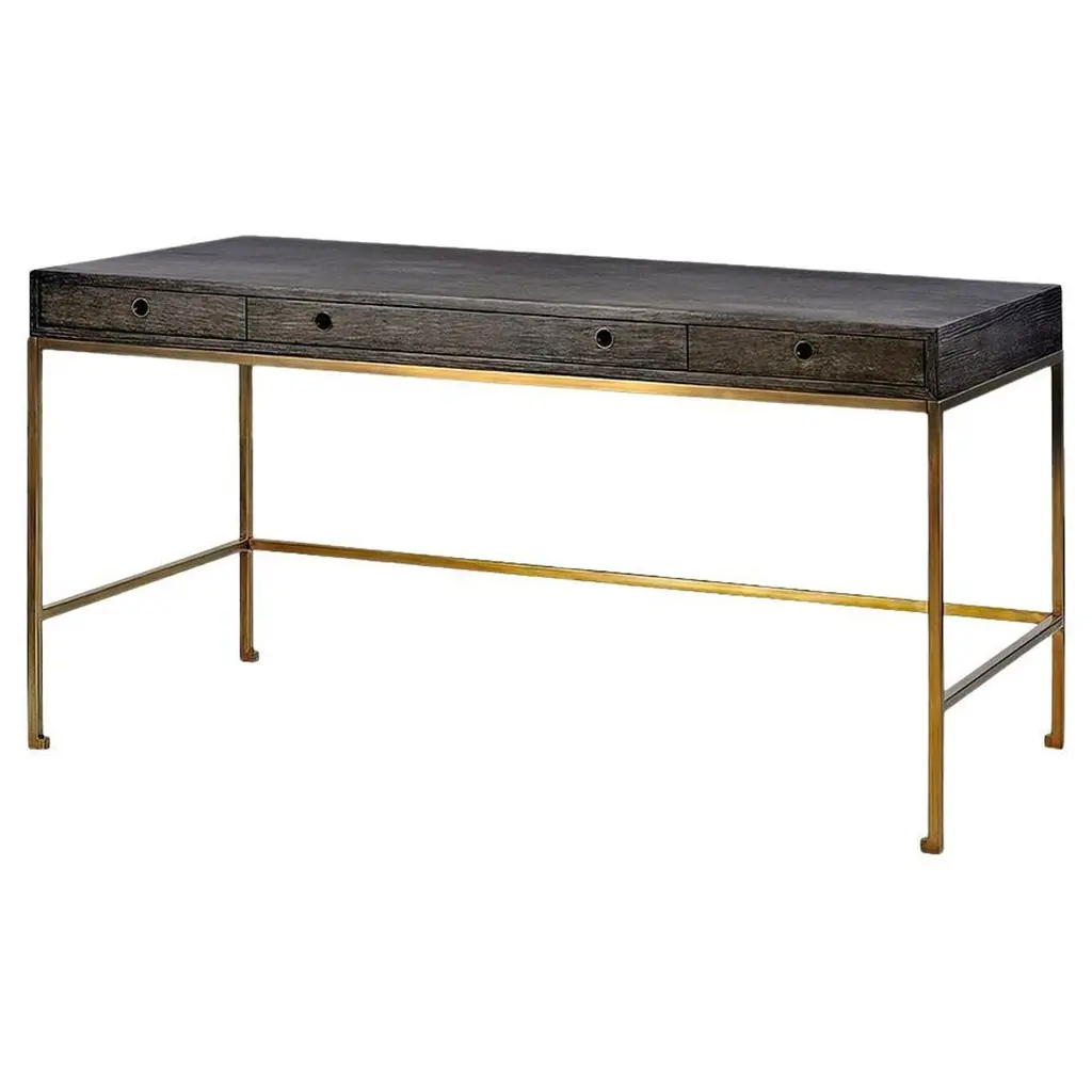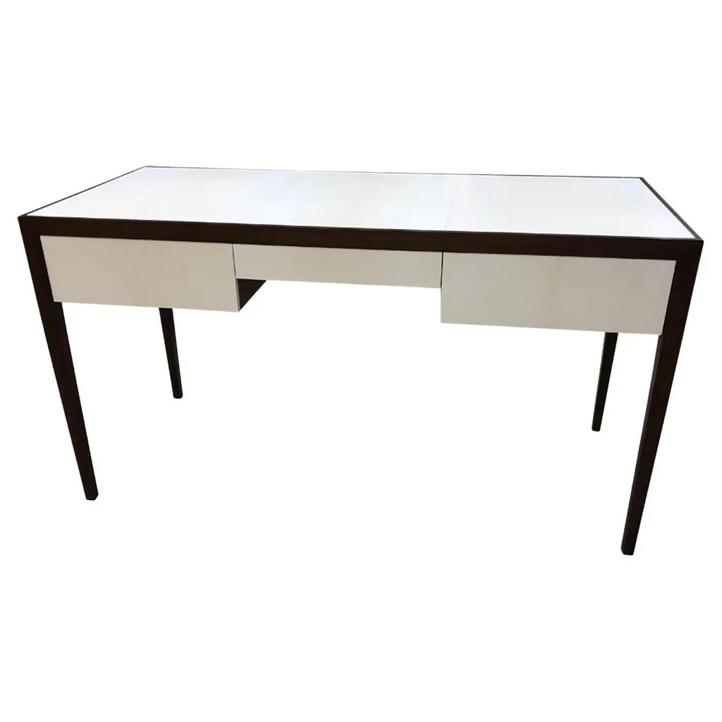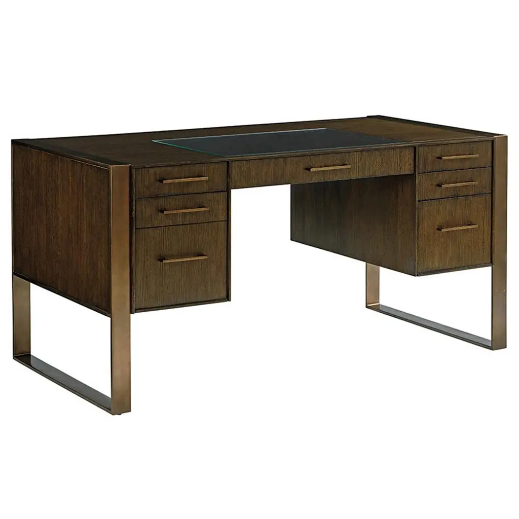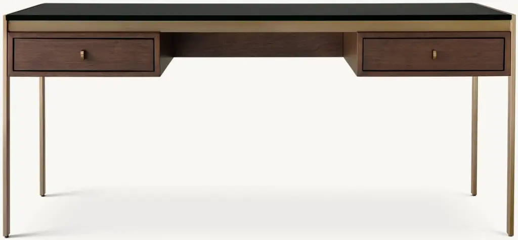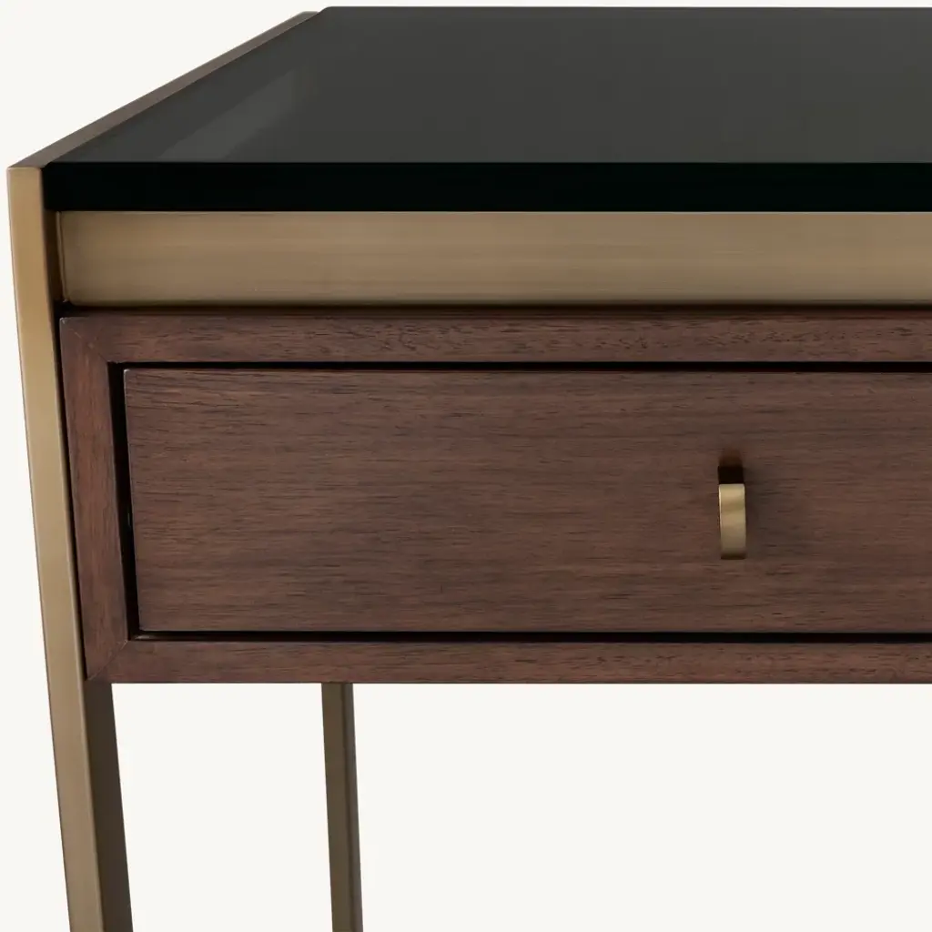 Informed by the aesthetic of 1970s Italian design, our desk marries cool metal with the warmth of richly grained wood. Constructed with drawer modules on either side, it's topped with beveled glass.
