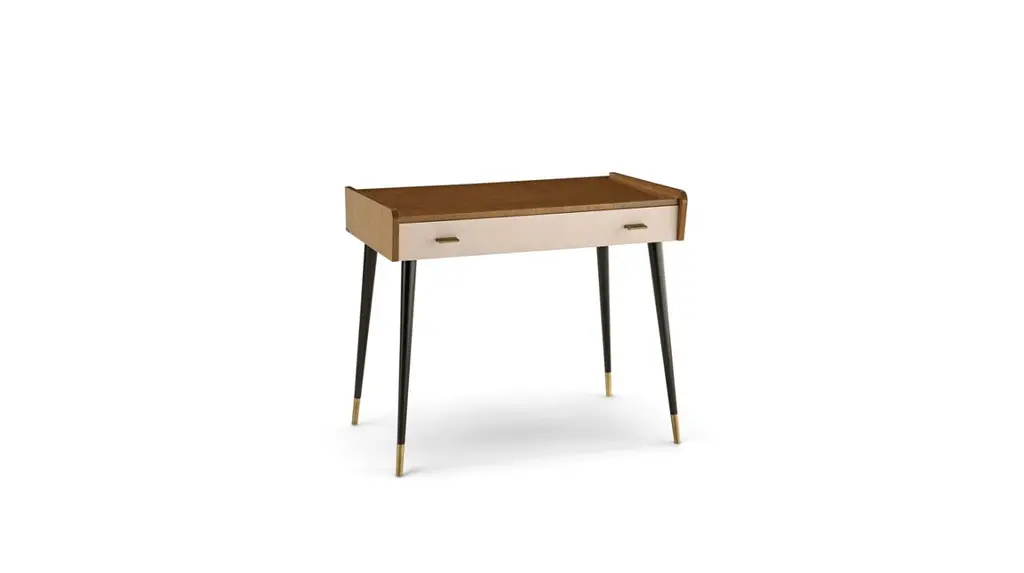 1 drawer with wooden slides. Top and sides in ash wood veneer on plywood, front of drawer in ash wood veneer on MDF. 4 legs in solid ash wood, with brass details. Hardware in brushed brass with patina finish. Manufactured in Europe.