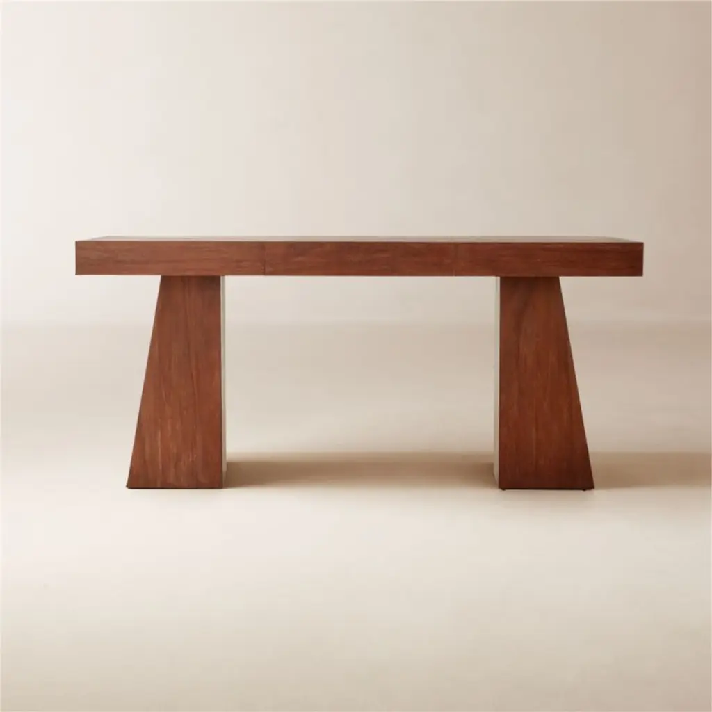 Acacia wood desk designed by Brett Beldock gets the work done in serious style. With a light cerused finish for visual interest, block leg desk flares to the floor dramatically. Single drawer gives desk supplies and private papers a home. CB2 exclusive.