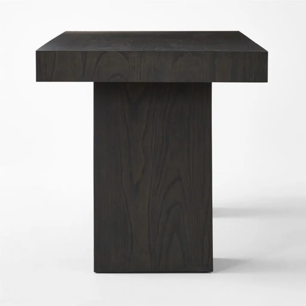 Ebonized wood desk designed by NYC-based Brett Beldock gets the work done in serious style. With a matte black finish for visual interest, block-leg desk flares to the floor dramatically. Single drawer gives desk supplies and private papers a home. CB2 exclusive.