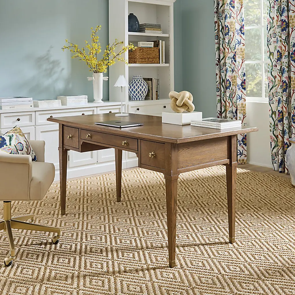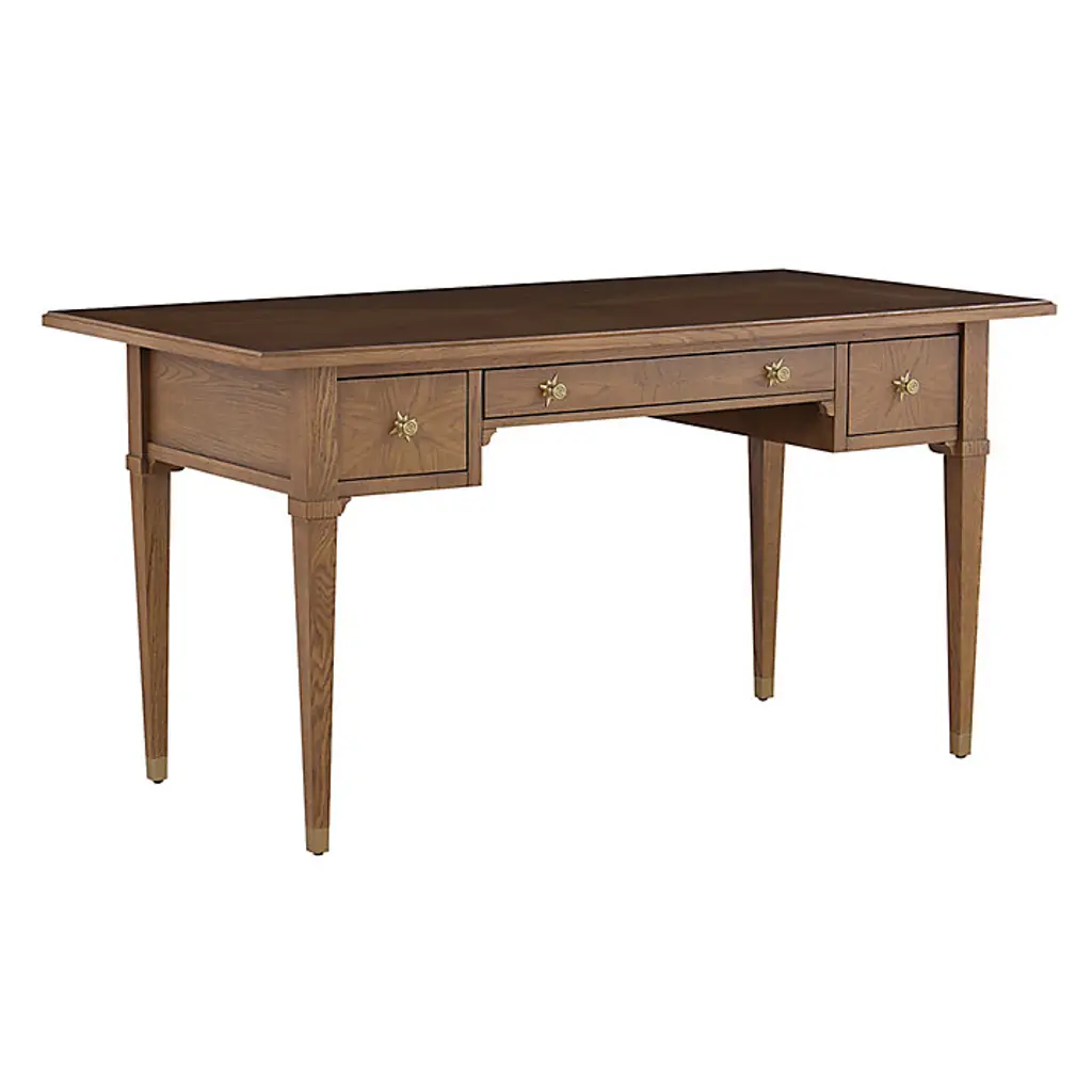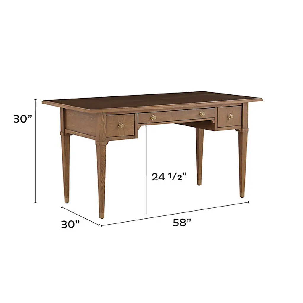 Inspired by a favorite antique, our Riley Desk brings elegance back to work. The sophisticated silhouette is beautifully hand crafted of solid oak and oak veneers with warm chestnut finish. Veneers are cut in a diamond design on the top and drawer fronts to showcase the oak's rich grain. The ogee edge top is intentionally deeper at the back like a vintage partners desk, giving you more room to spread out and work with others. Front is shallower for easy access to three storage drawers. Drawers have dovetailed joints and open on full-extension glides with striking brass star knob pulls. Tapered legs are capped in matching brass ferrules for a finely finished touch. Riley Desk features: