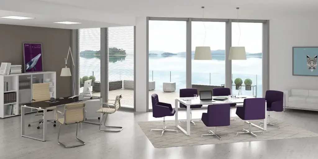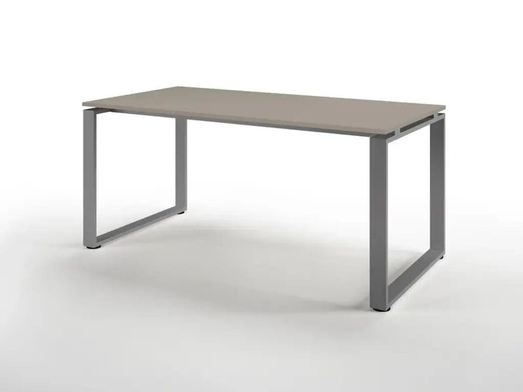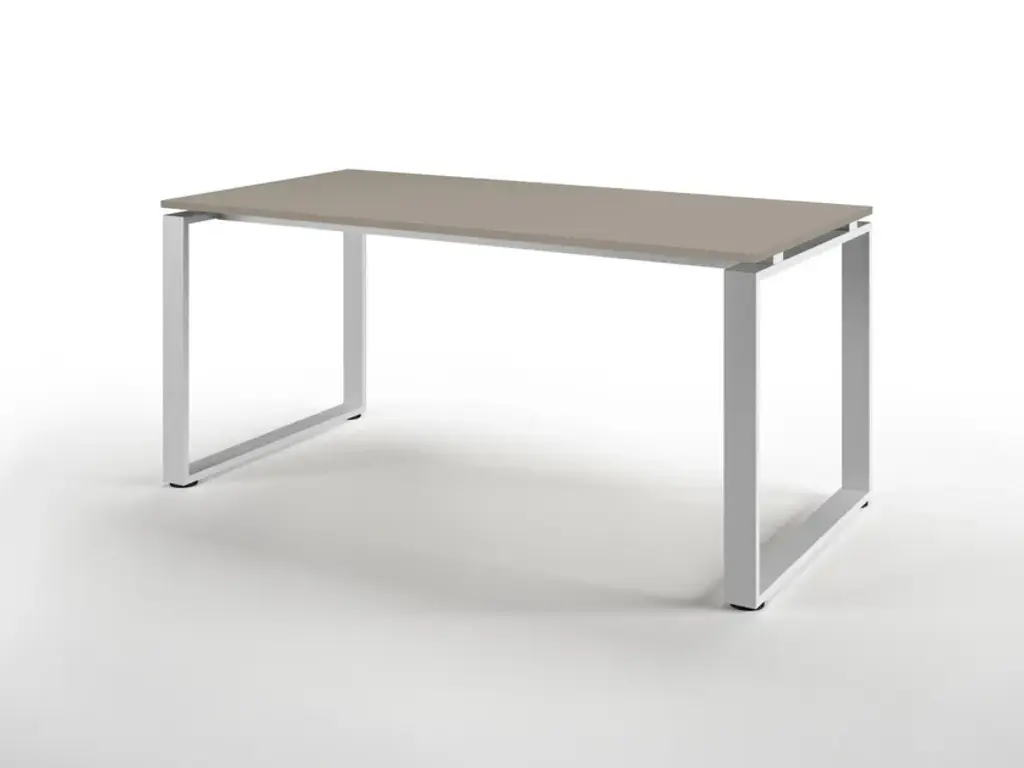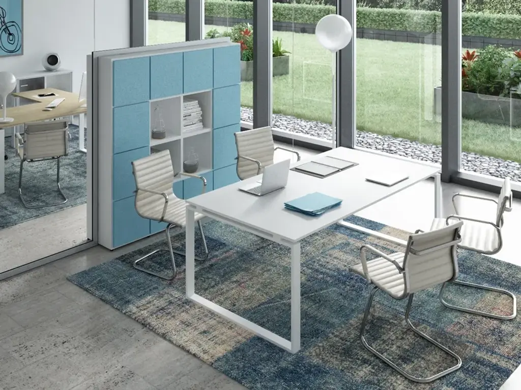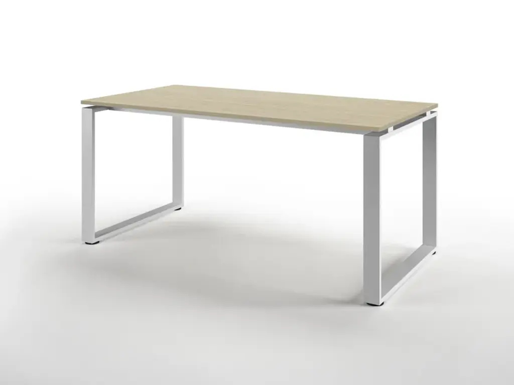 Ring is a demi-executive line, because of its high performance for stability and safety, thanks to a "O" leg. The worktops are made of melamine enamelled wooden conglomerate 18 mm thick, and are available in white, lightly veined, oak or dove-coloured solid finishes, with coloured ABS edge. The three standard finishes are available in rapid delivery.The RING leg is made of pickled tubular metal with rectangular section 70x20mm. and a thickness of 2 mm, laser cut and perforated. All metal parts are available in white Ral 9003 finish, matt smooth effect, or bonderized grey with a glossy effect.On request, both desks and other furnishing elements (filing cabinets, bookcase doors, etc.) can be produced in a further 20 finishes, according to the “Multicolor” colour chart, among which 9 finishes are made with coloured edges, while the remaining ones are made with aluminium coloured ABS edge.The tops are also available in back lacquered glass, made to order, and are manufactured with extra-clear tempered glass of 10 mm thickness back-lacquered in the colours white Ral 9003, ecru’ Ral 9001, moka Ral 8019, dark red Ral 3003 and black Ral 9017.