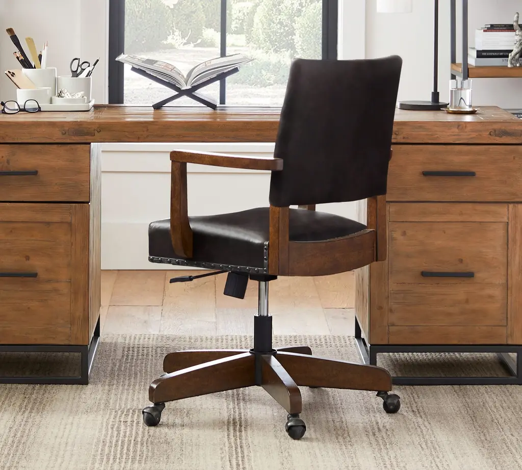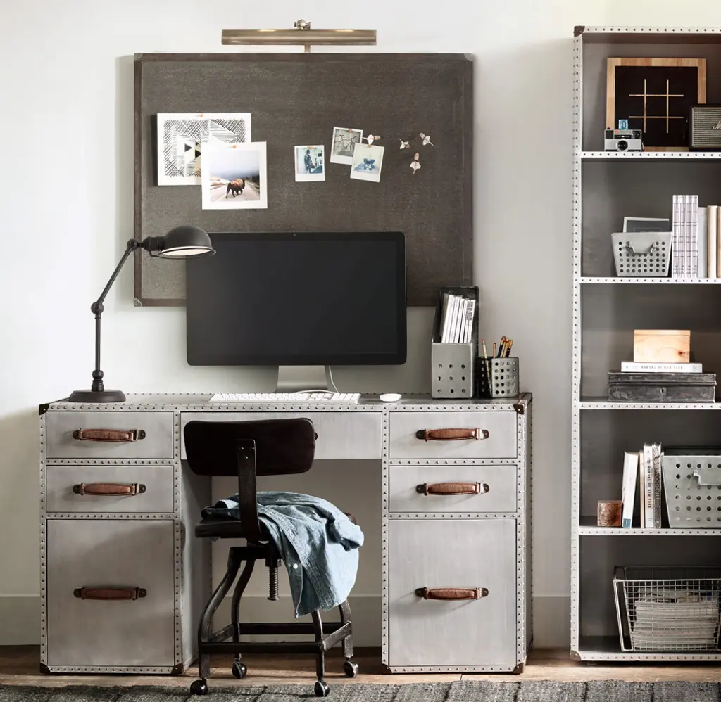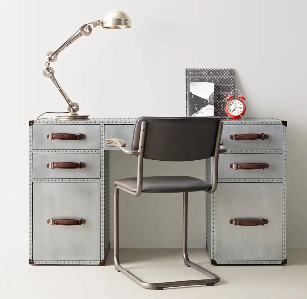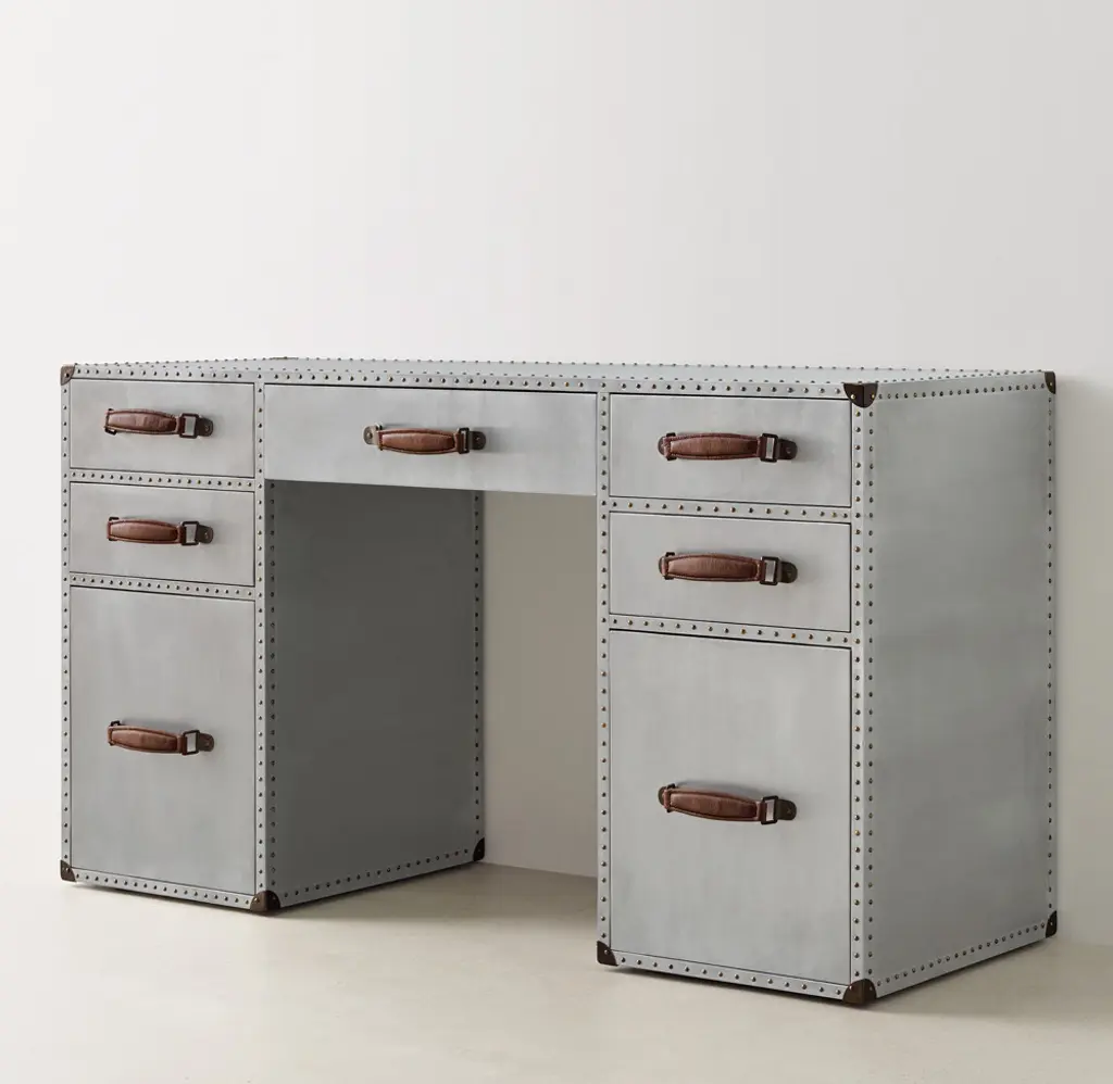 Inspired by a vintage travel trunk, our industrial collection is clad in Brushed Aluminum secured with rows of raised rivets. Bronze corner brackets and warm leather pulls add the finishing touch to each piece.