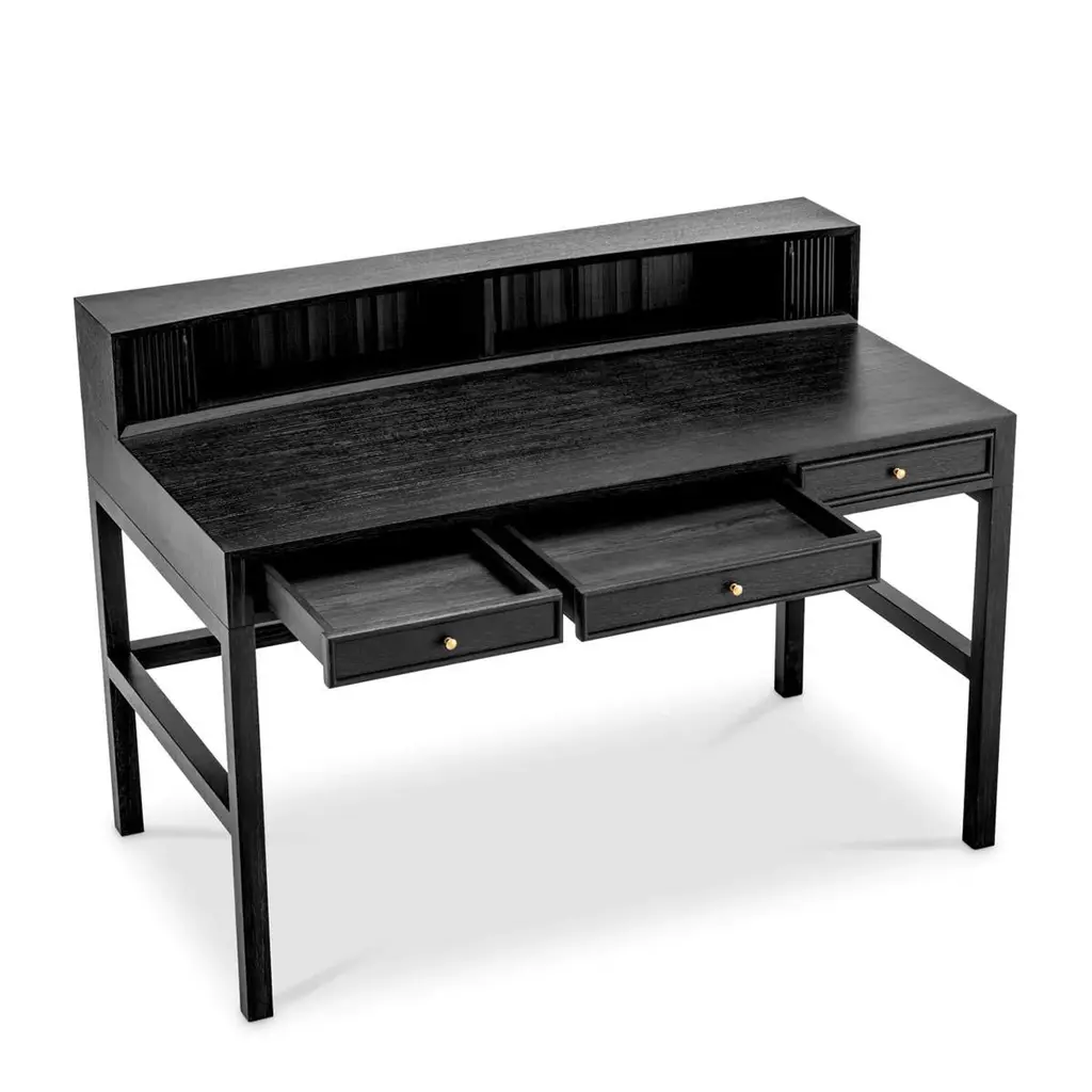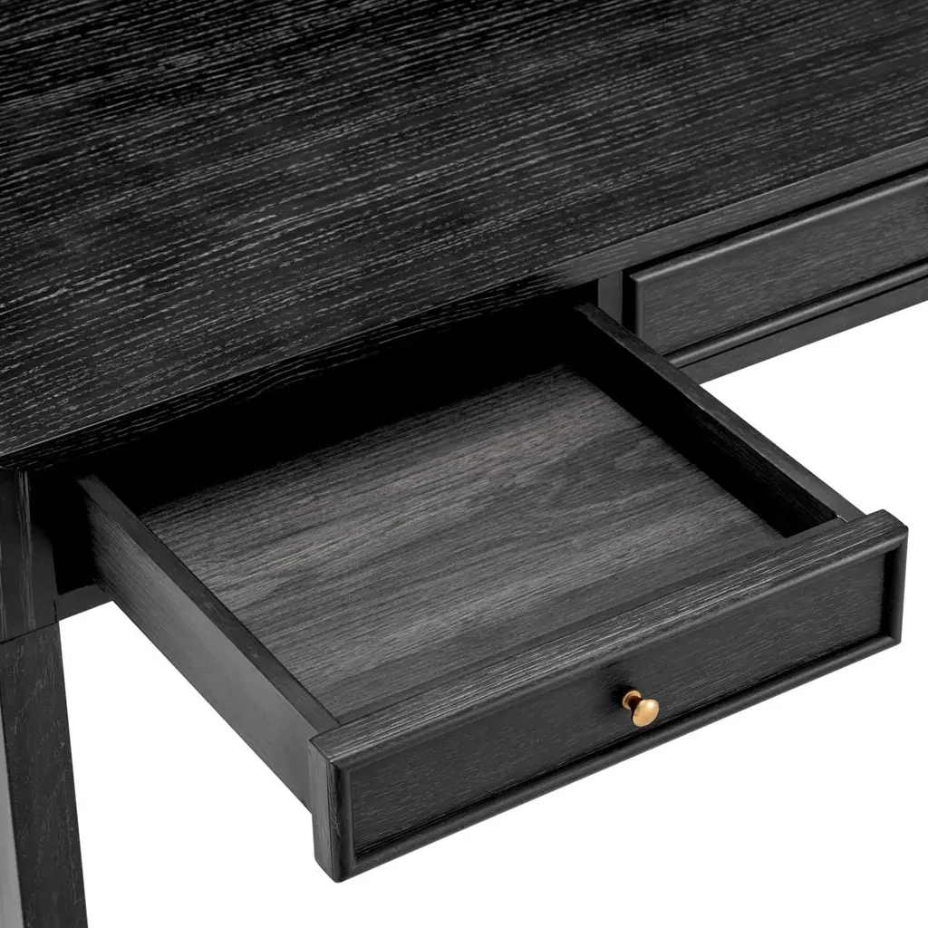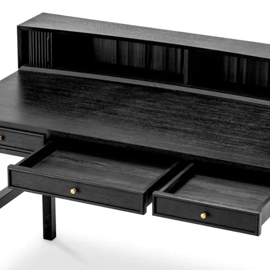 Desk Roanne with structure in solid oak in darkgrey veneer, with mindi wood. Desk with 3 drawersand with storage part on the top with 2 sliding doors.With knobs in solid brass in brushed finish.