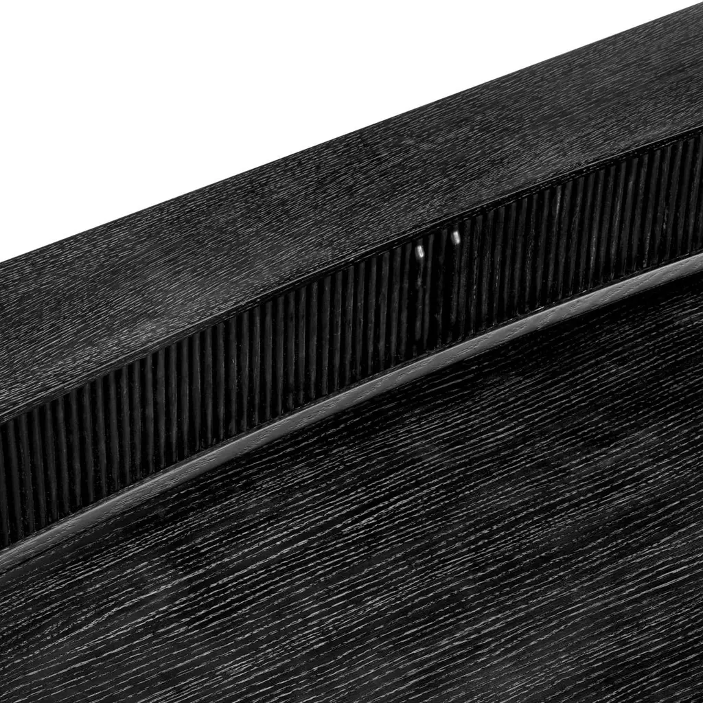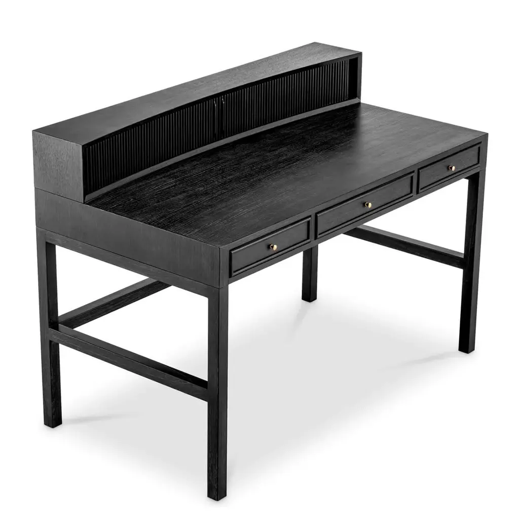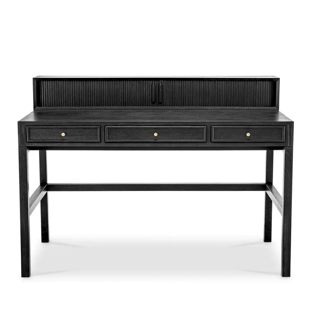 Desk Roanne with structure in solid oak in darkgrey veneer, with mindi wood. Desk with 3 drawersand with storage part on the top with 2 sliding doors.With knobs in solid brass in brushed finish.