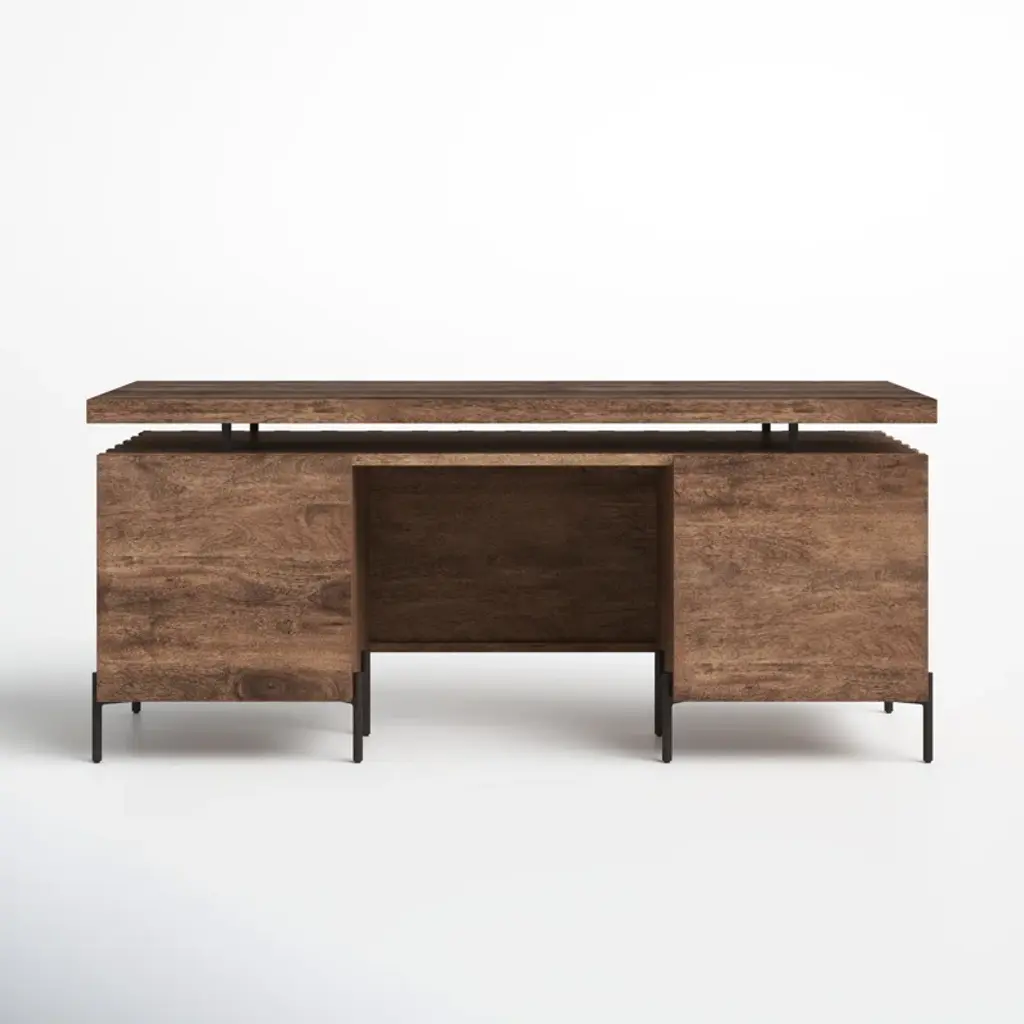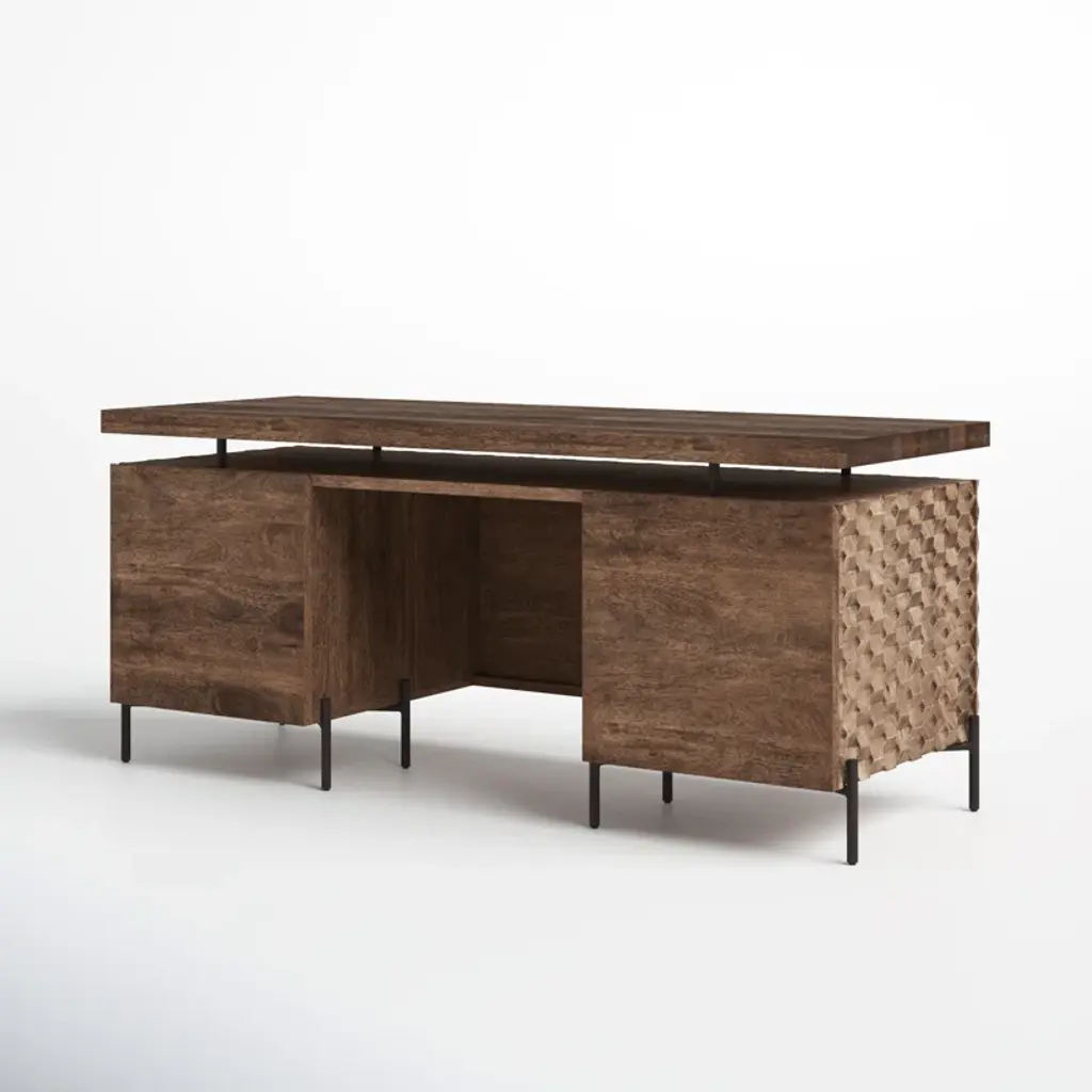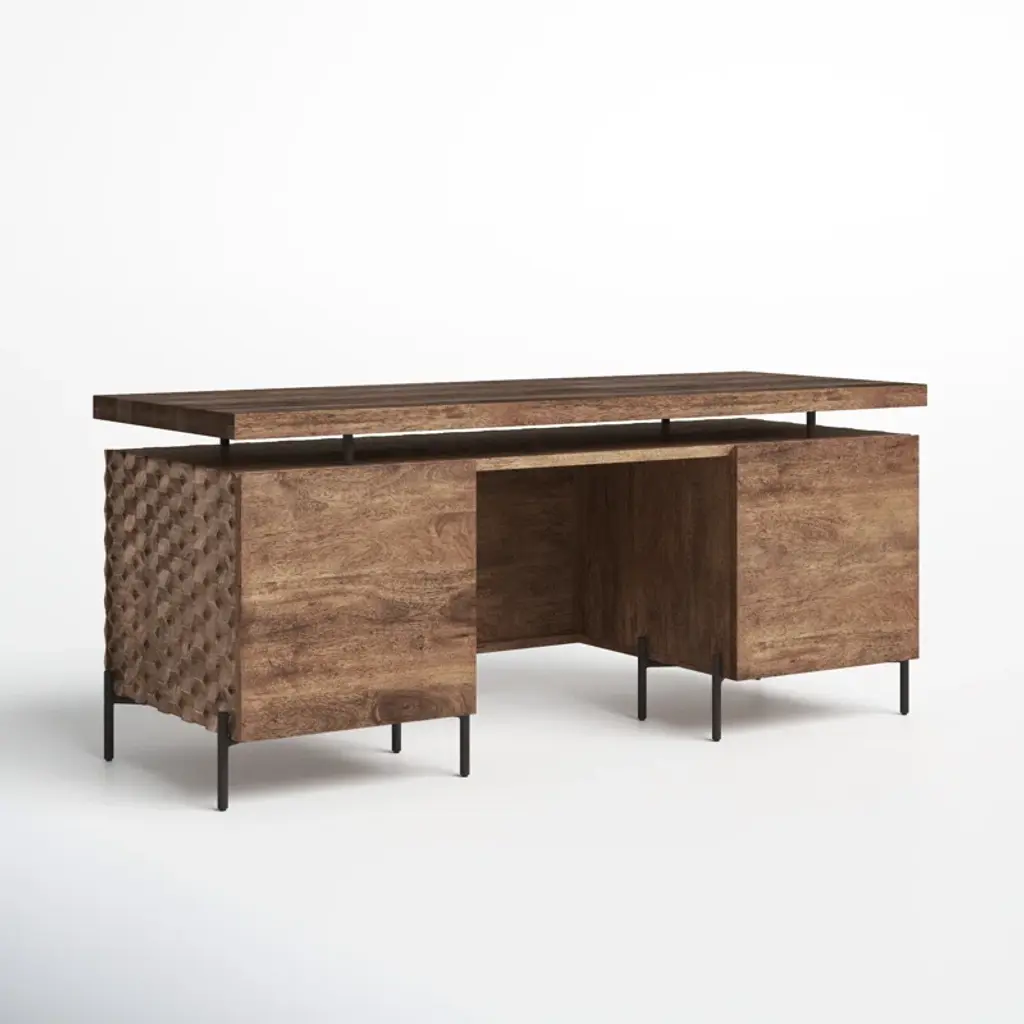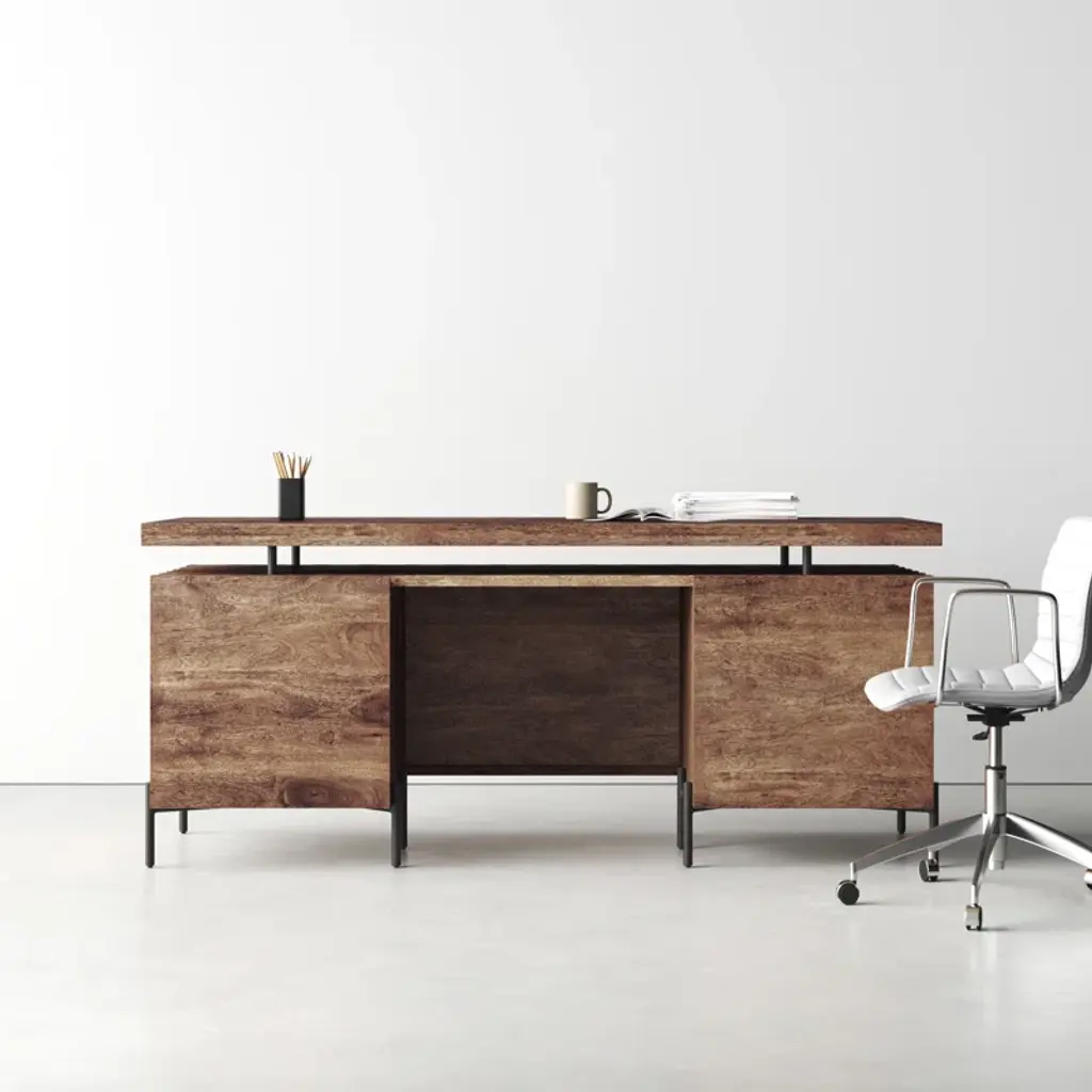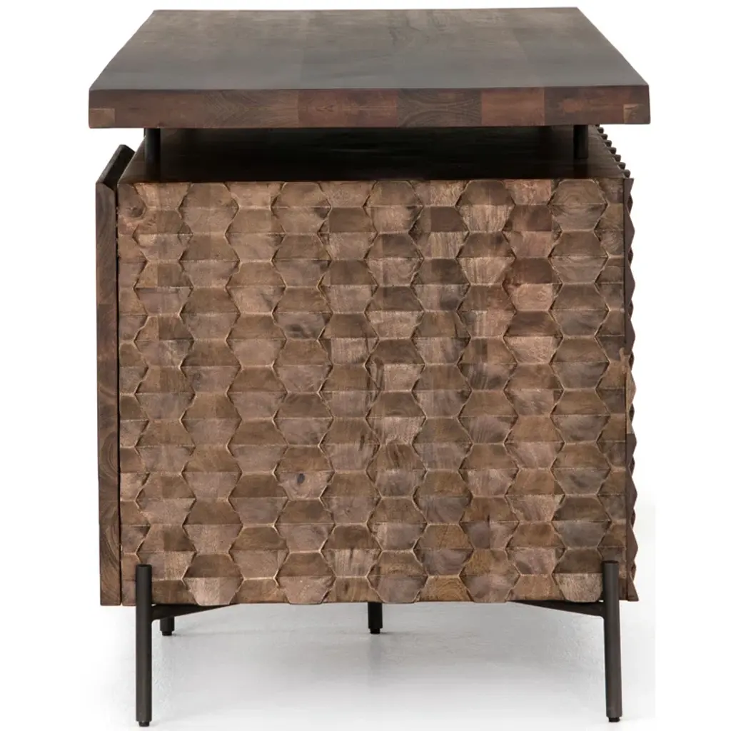 Want to let your at-home office speak for itself? This executive desk instantly commands the room with its solid mango wood frame and sleek iron legs. It boasts a textured honeycomb pattern and an antique brown finish that showcases the wood’s natural grain. A floating desktop gives you ample room to spread out your work, while two shelved cabinets offer out-of-sight storage for books, stationery, and more. Plus, this statement piece arrives fully assembled – so you can conquer your to-do list right away.
