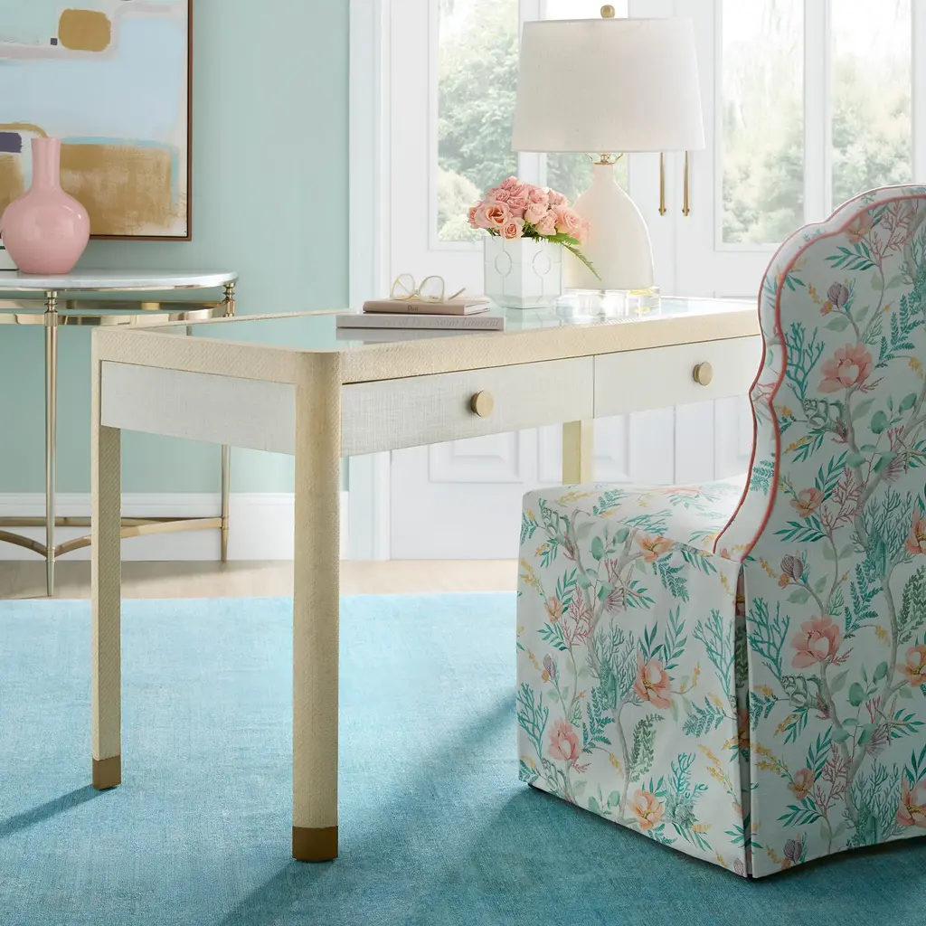 Our Rose Desk is a statement piece for any space. With its unique mix of raffia frame and linen drawers accented with burnished brass hardware, it creates a fresh casual elegance that can mix in a variety of interiors. Ships In 4-5 Weeks Brass hardware and accents Raffia and linen accents Two drawers This image is for illustrative purposes only. The colors shown are accurate within the constraints of lighting, photography, and the color accuracy of your screen.