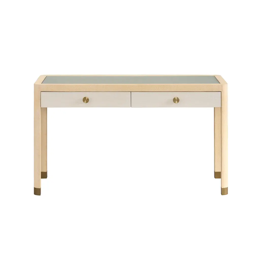 Our Rose Desk is a statement piece for any space. With its unique mix of raffia frame and linen drawers accented with burnished brass hardware, it creates a fresh casual elegance that can mix in a variety of interiors. Ships In 4-5 Weeks Brass hardware and accents Raffia and linen accents Two drawers This image is for illustrative purposes only. The colors shown are accurate within the constraints of lighting, photography, and the color accuracy of your screen.