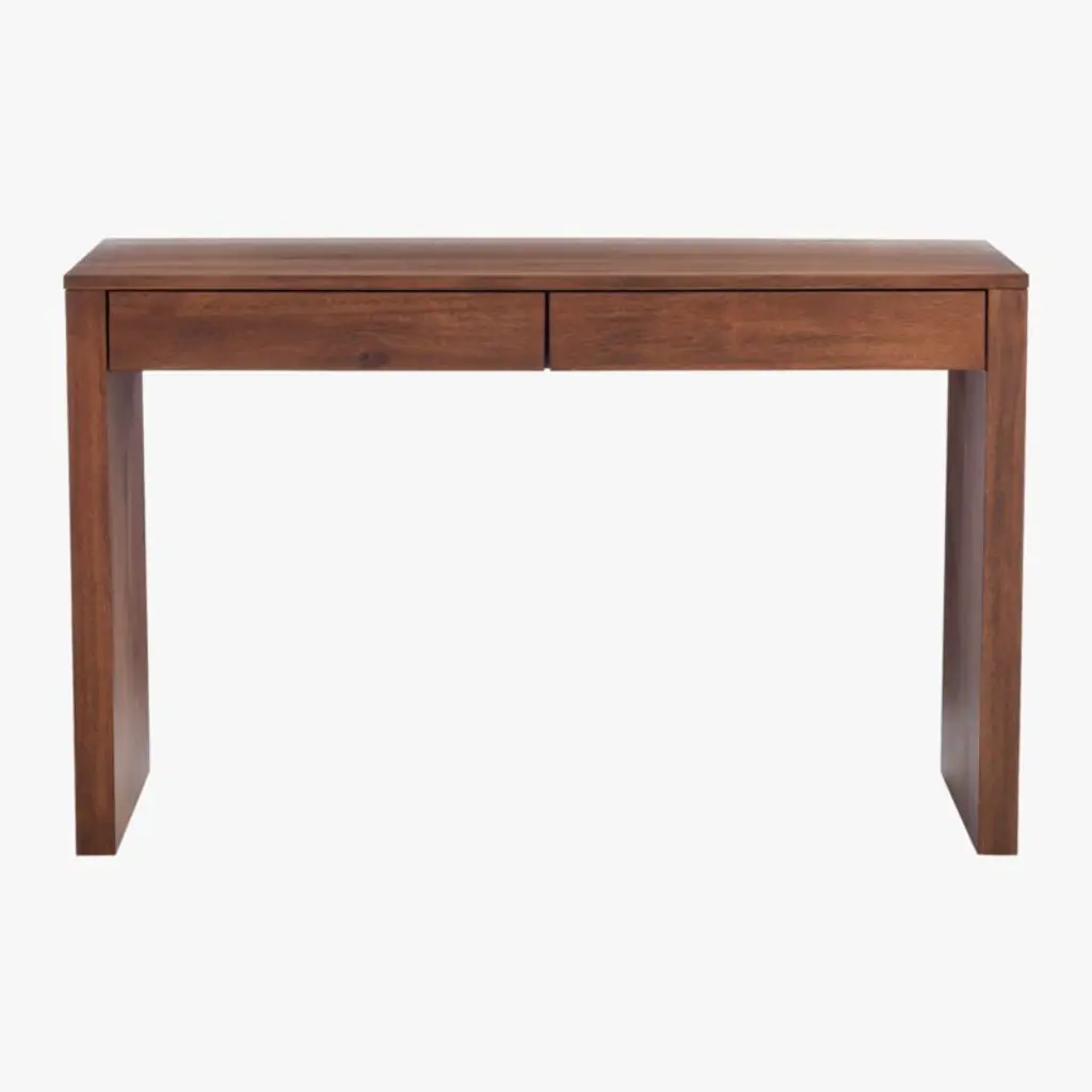 Rich acacia wood desk stylishly downsizes for space in the office, entryway or bedroom. Discreet sleek dual drawers organize desk supplies and papers, keys and mail (perfect entry console), even cosmetics (makes a great vanity, too). CB2 exclusive.
