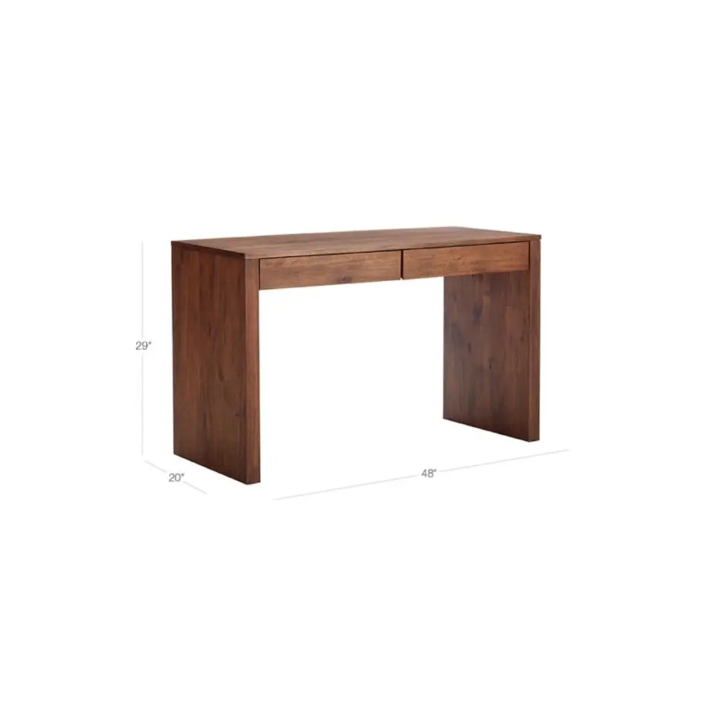 Rich acacia wood desk stylishly downsizes for space in the office, entryway or bedroom. Discreet sleek dual drawers organize desk supplies and papers, keys and mail (perfect entry console), even cosmetics (makes a great vanity, too). CB2 exclusive.