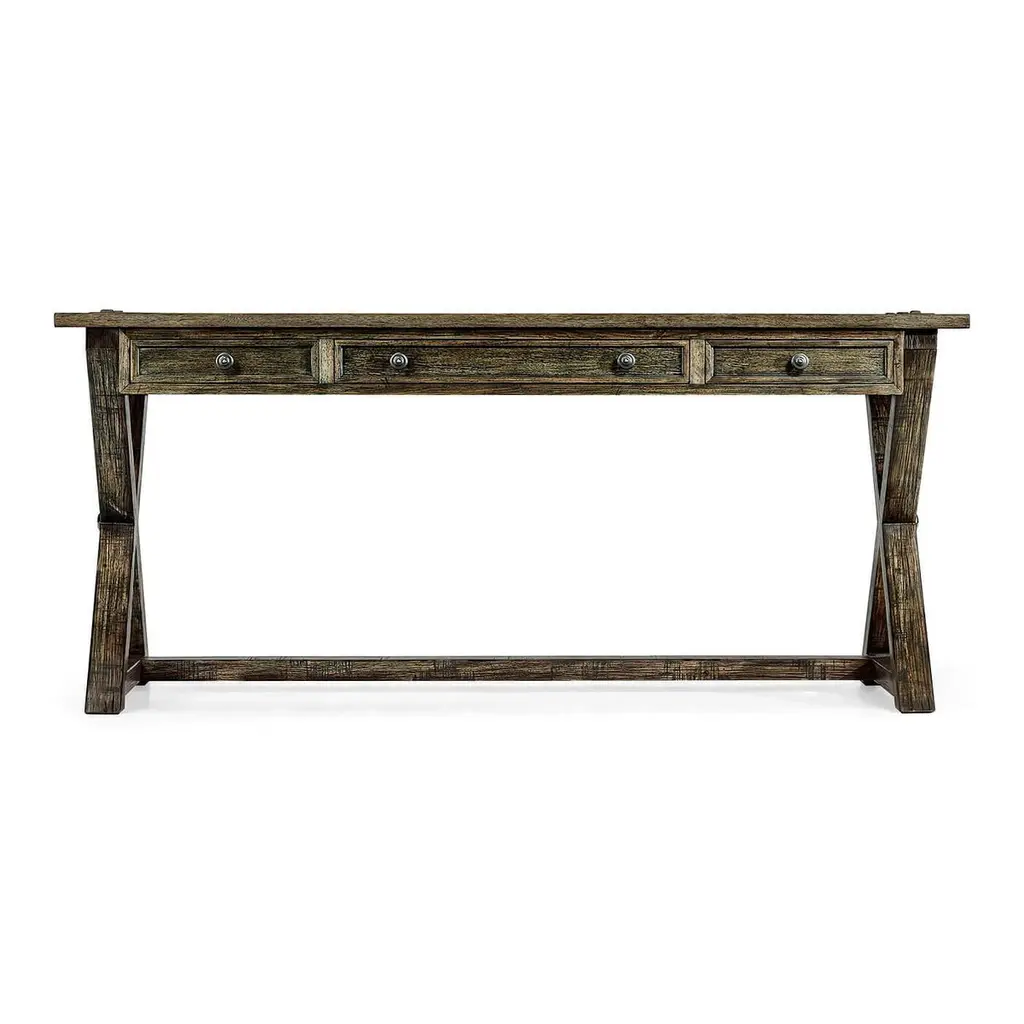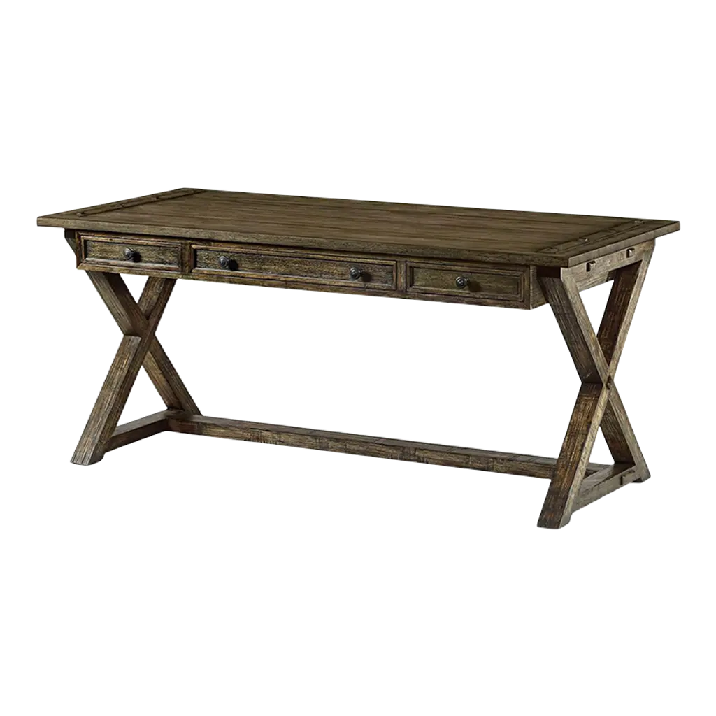 A rustic country-style solid driftwood finished rectangular desk with a rustic finish revealing exposed saw marks. Three small oak-lined drawers to front with mortice and tenon joints to X-frame support and top surface.Dimensions: 68" W x 32" D x 30.25" H.