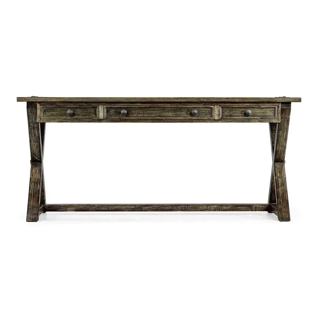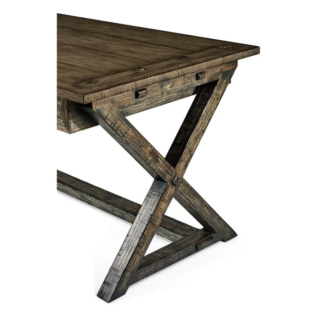 A rustic country-style solid driftwood finished rectangular desk with a rustic finish revealing exposed saw marks. Three small oak-lined drawers to front with mortice and tenon joints to X-frame support and top surface. Dimensions: 68" W x 32" D x 30.25" H