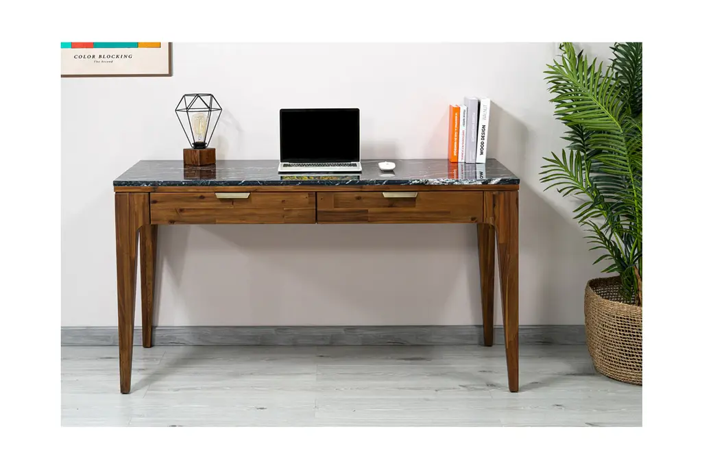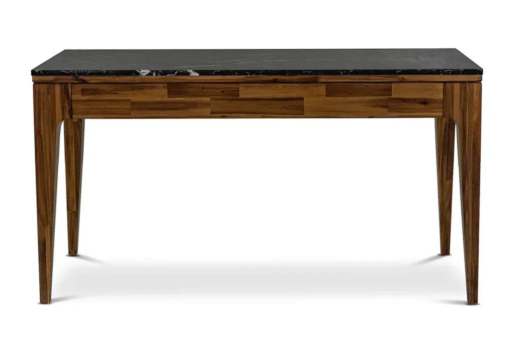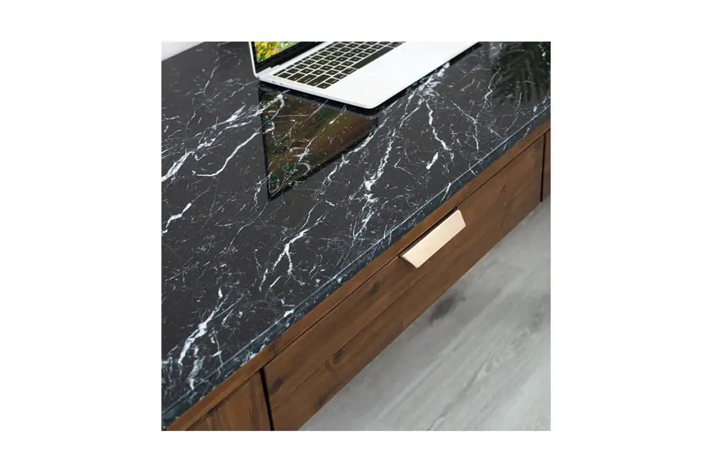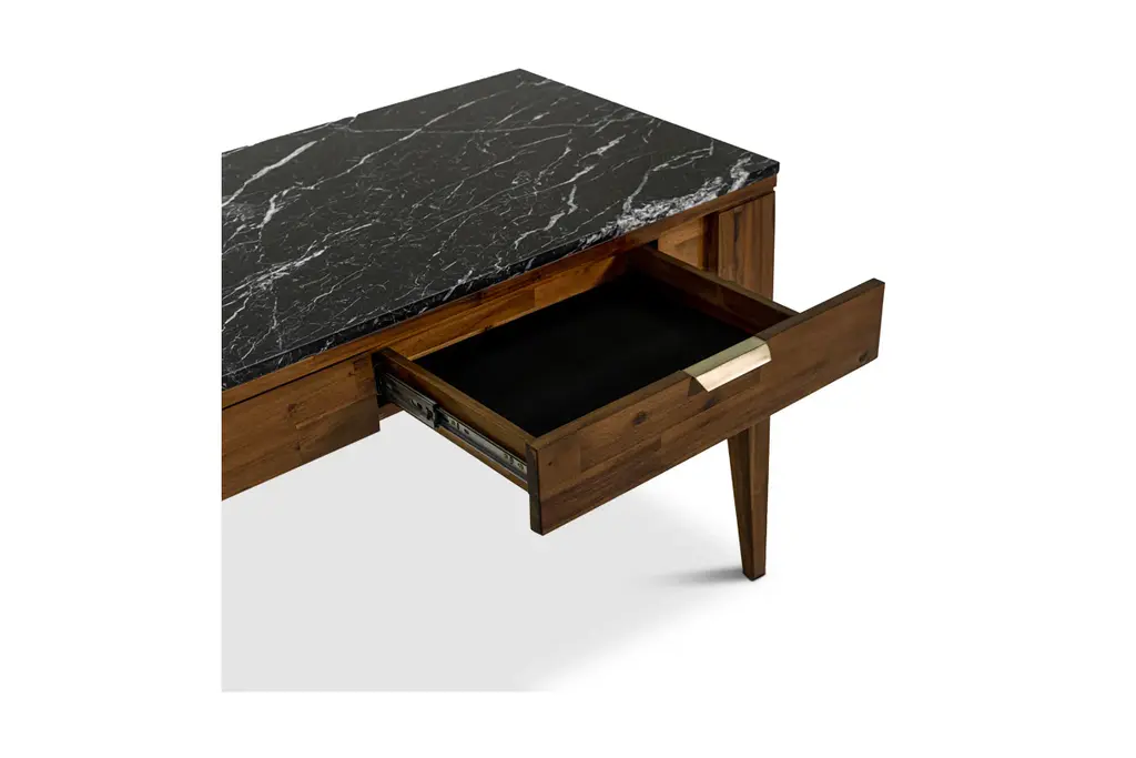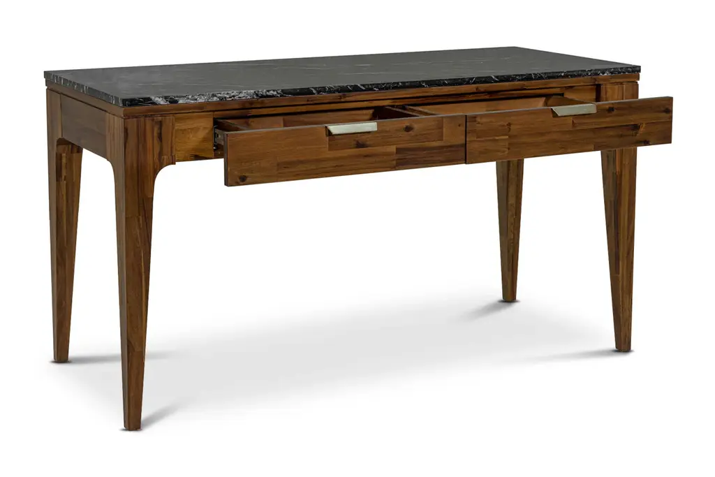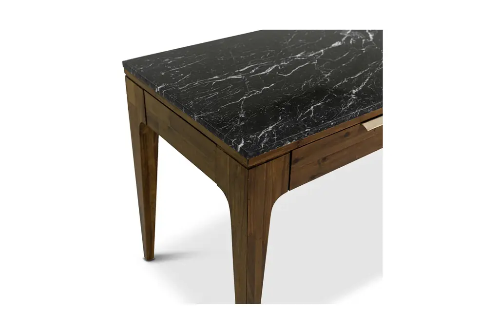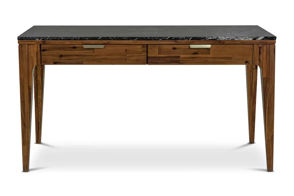 Rutherford Desk – Black Spanish Marble & Walnut Acacia – The Rutherford Desk (55"w x 23.5"d x 32"h) blends modern design with durable craftsmanship, featuring a black Spanish marble top that’s scratch-resistant, easy to clean, and just 0.5" thick for a sleek profile. Its solid acacia wood base in a warm walnut finish is accented by brass handles and tapered legs for a timeless silhouette. Two soft-close drawers provide convenient storage, while a 53" leg clearance ensures comfortable seating. With a 300 lb weight capacity and sturdy build, the Rutherford is designed for both style and everyday function. Assembly required.