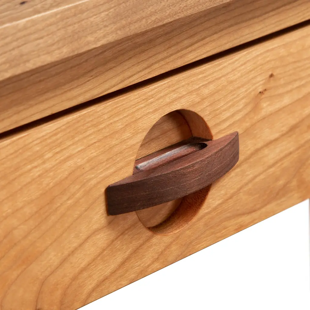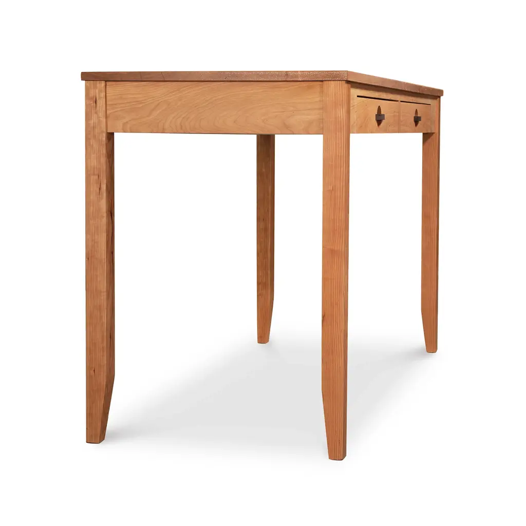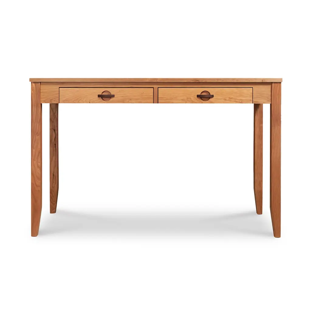 Modern design taken to a whole new level. Our Ryegate Desk retains the main characteristics desired in contemporary furniture with a few designer elements. Clean straight legs end in a dramatic taper creating a nicely framed form. Unique walnut half moon shaped pulls add a slight craftsman style design to this custom 2 drawer desk. The best detail of all? Everything is completed in a fine solid wood construction ensuring durability and endurance. Look forward to sitting down to your next job or task accompanied with the ease and convenience this desk will provide.Construction details feature precision dovetail drawer construction with full extension metal undermount soft close slides which ensure quiet and smooth operation. Choose from natural cherry, maple and walnut hardwood. Handcrafted in Vermont using eco-friendly, sustainably harvested materials. Base price represents desk in natural cherry with natural walnut pullsShown in natural cherry with natural walnut pullsMatching furniture available in our Cherry Moon Furniture Collection