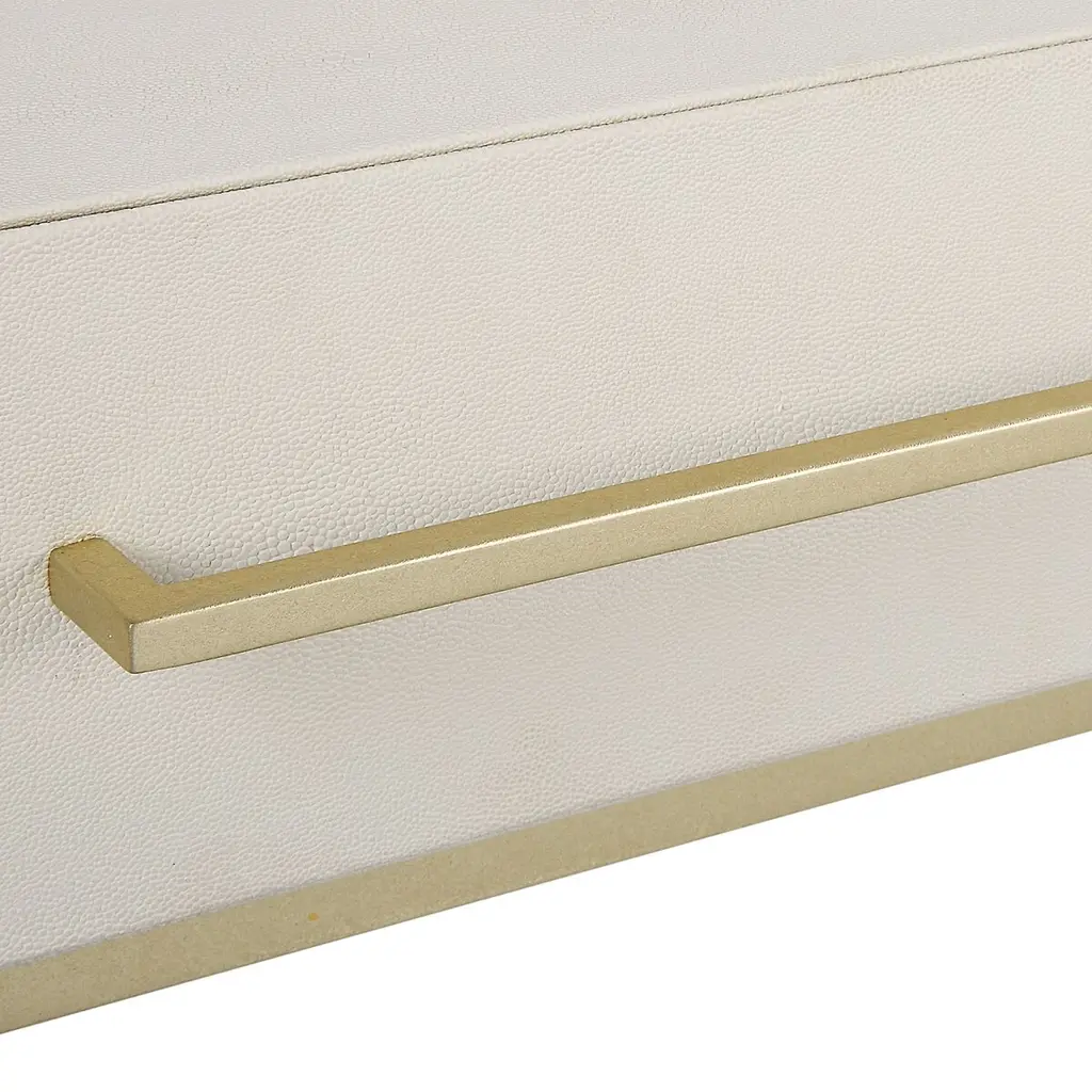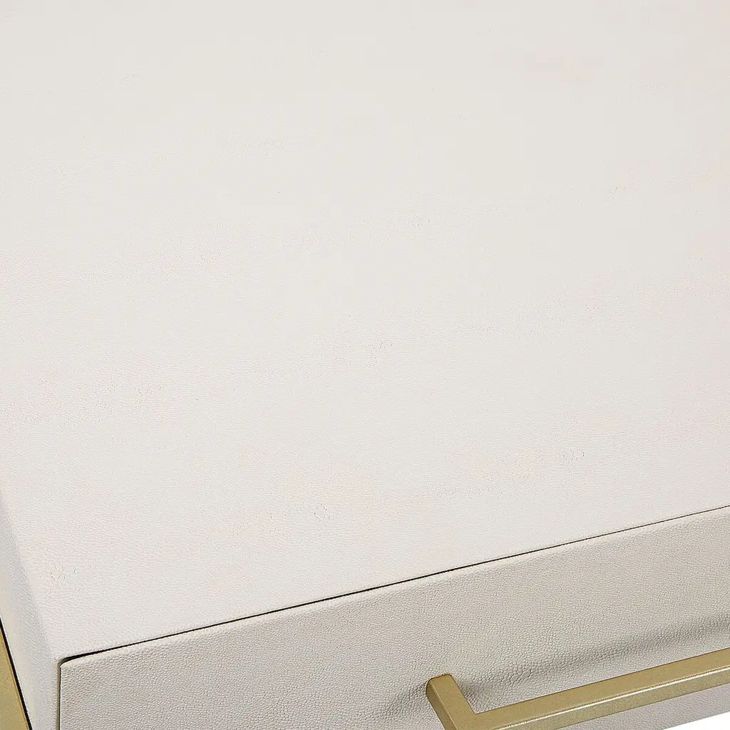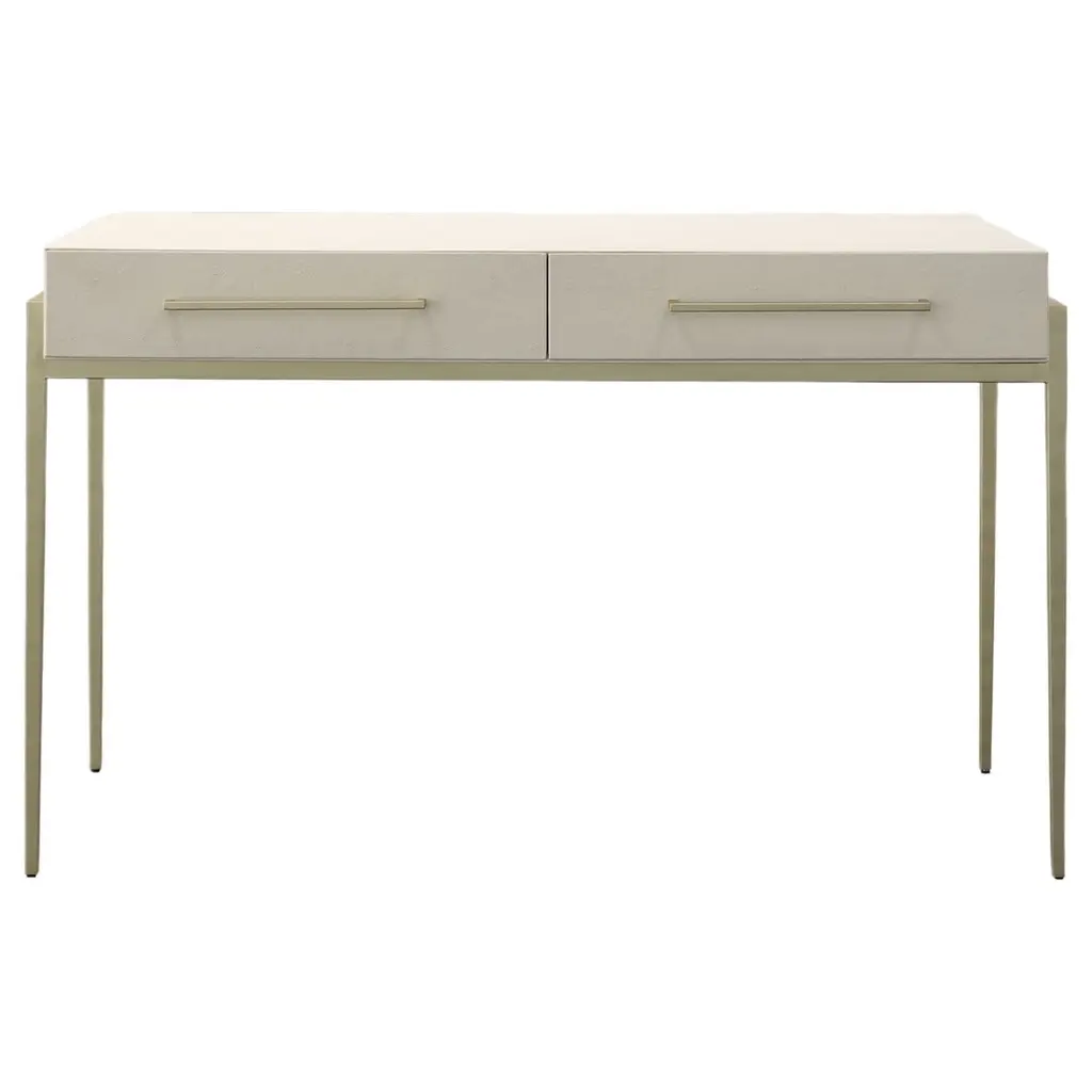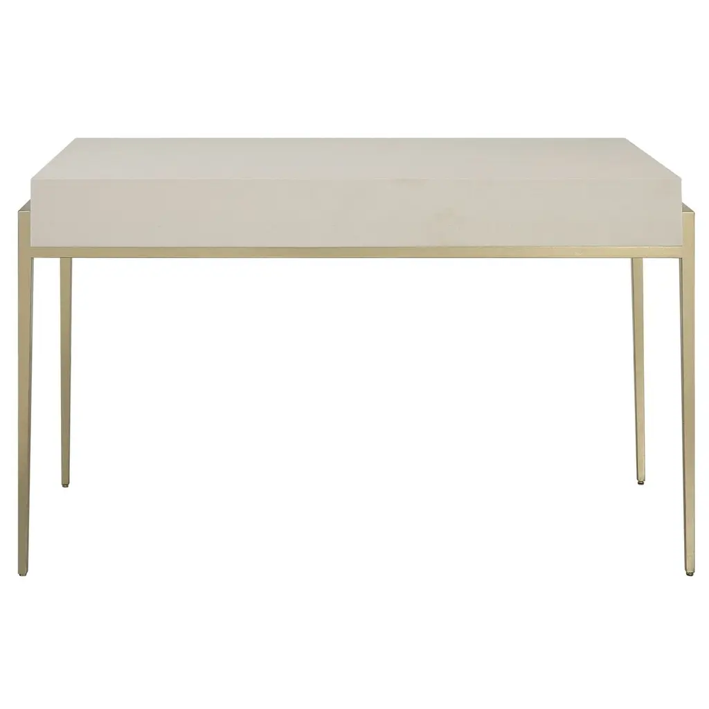 Discover the allure of the Sabrina Desk, a modern masterpiece that transforms any workspace into a sanctuary of style and sophistication. This desk is a testament to contemporary elegance, with its sleek faux shagreen top gracefully embraced by a shimmering iron frame. The mitered edge drawer fronts and exquisite drawer pulls add a touch of opulence, making it not just a desk, but a statement piece. Whether you're penning letters or catching up on emails, the Sabrina Desk invites you to indulge in the art of work with its harmonious blend of form and function.