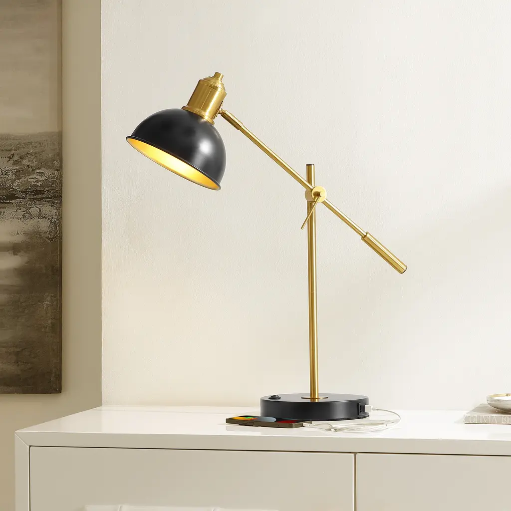 Upgrade your home with the sophisticated style and elevated functionality of our Amur table lamp. A classic appeal and high functionality make our table lamp a stunning addition. Its clean-lined silhouette is enriched with a dome shade and sophisticated details. Adorned in a metallic finish, our table lamp achieves two-tone elegance that elevates any corner. It includes an articulating arm that directs light just where needed. Featuring a USB port to keep your devices charged, our table lamp serves as a stylish and functional addition to your workspace, reading nook, or study.