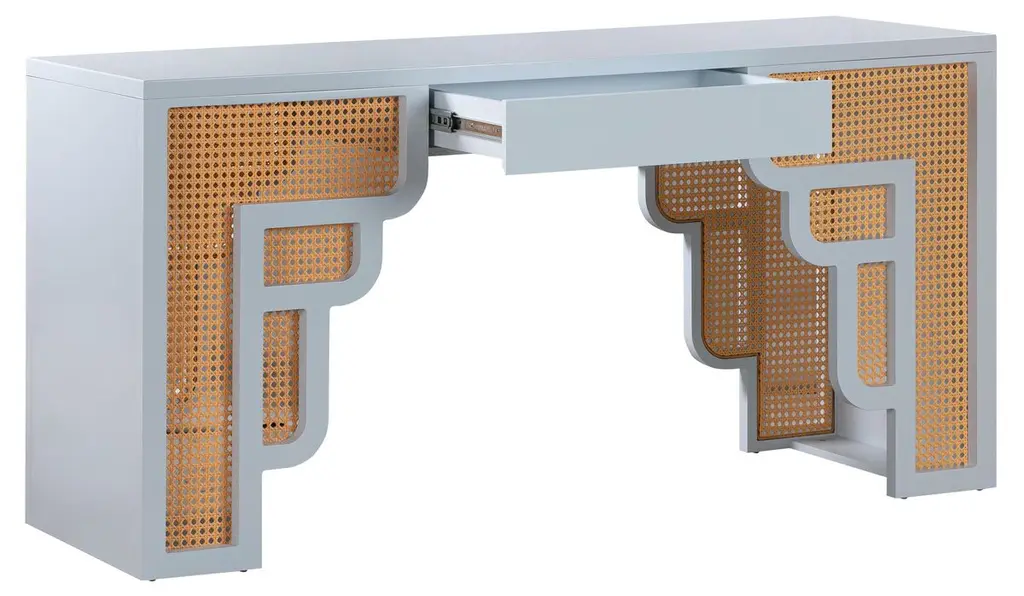 A fresh interpretation of Palm Beach chic, this handcrafted desk pairs curves and straight lines, woven rattan and wood to eye-catching effect. A soft-close drawer provides always-welcome storage.