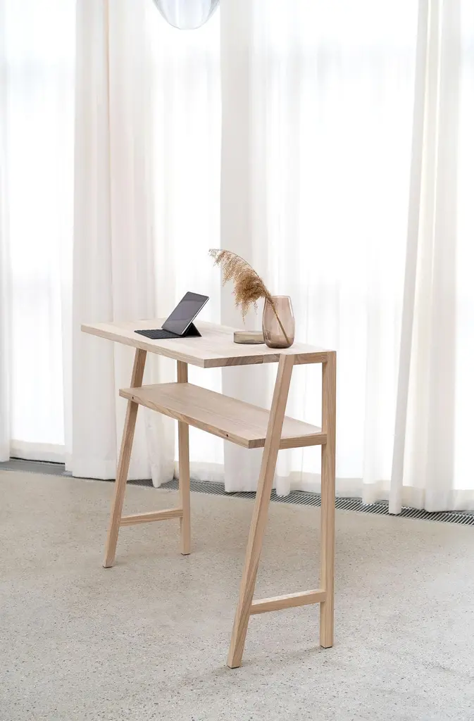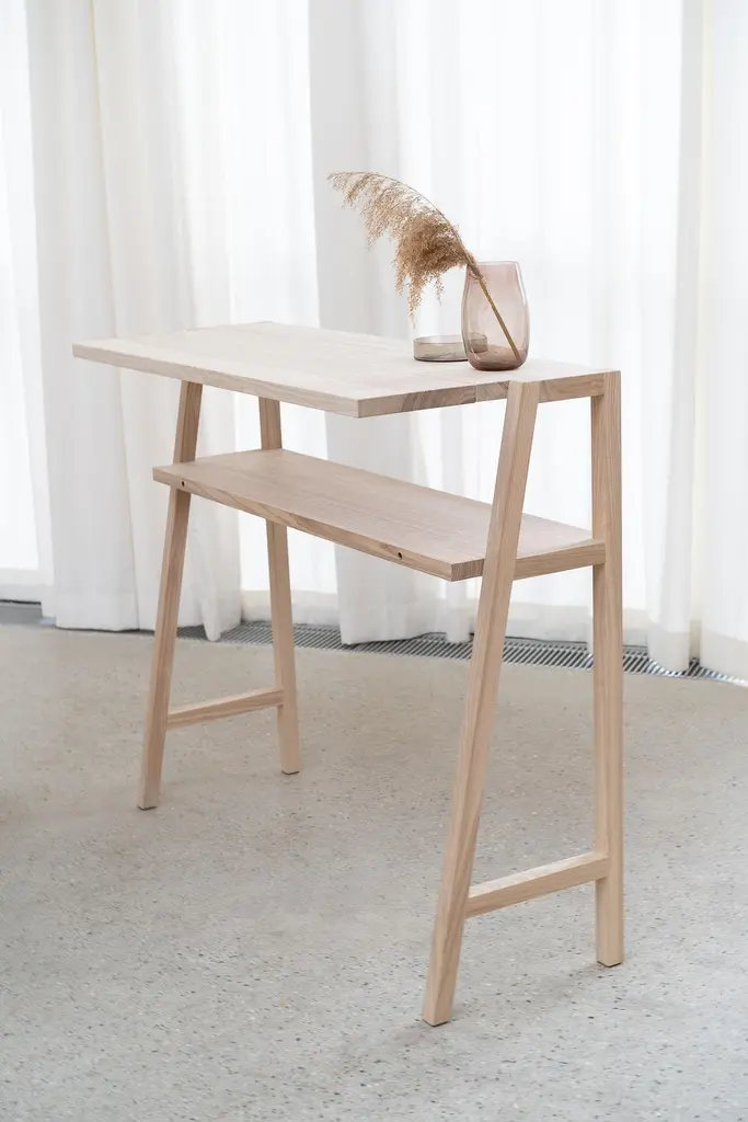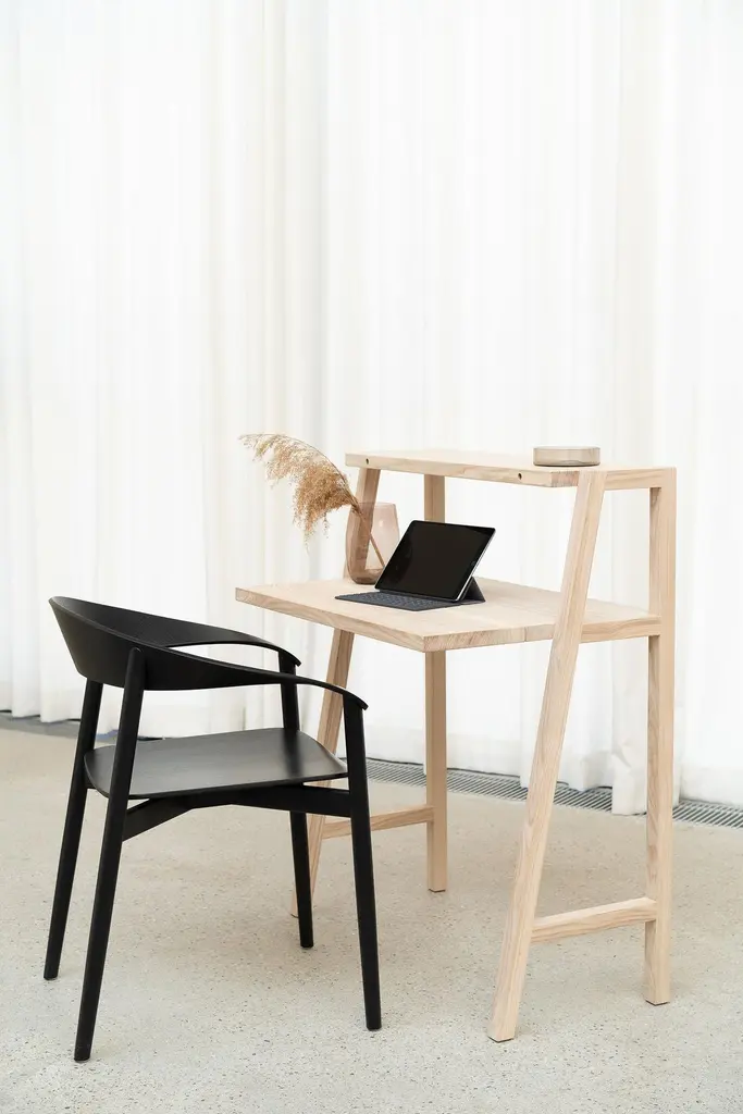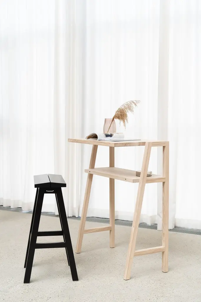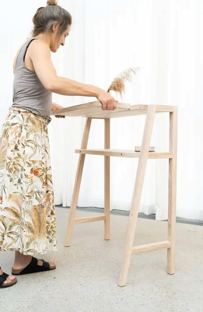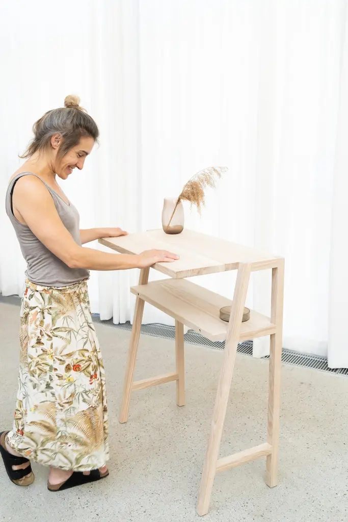 Scala Flex Desk 85 by Frau CazeDimensions: D 52 x W 85 x H 105 cm.Materials: Soaped ash.Available in 85 or 120cm width. Please contact us.Flex Desk Scala allows you to switch between sitting and standing orientations. Simply insert the additional table board at the desired height to be used.Although Berlin has been her home for many years, Carolin – the designer behind Frau Caze, with “Caze” being a fusion of her first and last name – has never been one to stand still. She has traveled the world relentlessly in search of inspiration for her work. These travels have greatly influenced her unique sense of atmosphere and texture, as well as her concern for our planet – Frau Caze places a great emphasis on sustainability, quality, and functionality.Currently, Carolin splits her time between Berlin and Lake Constance, and has devoted herself to furniture and interior design ever since studying design at the FH Potsdam and the Escola Superior de Desenho Industrial in Rio de Janeiro until 2012. Founding Frau Caze in 2016, her work pays tribute to her love of natural, high-quality materials as well as sustainable, responsible craftsmanship – including ethical treatment of all people involved in production.