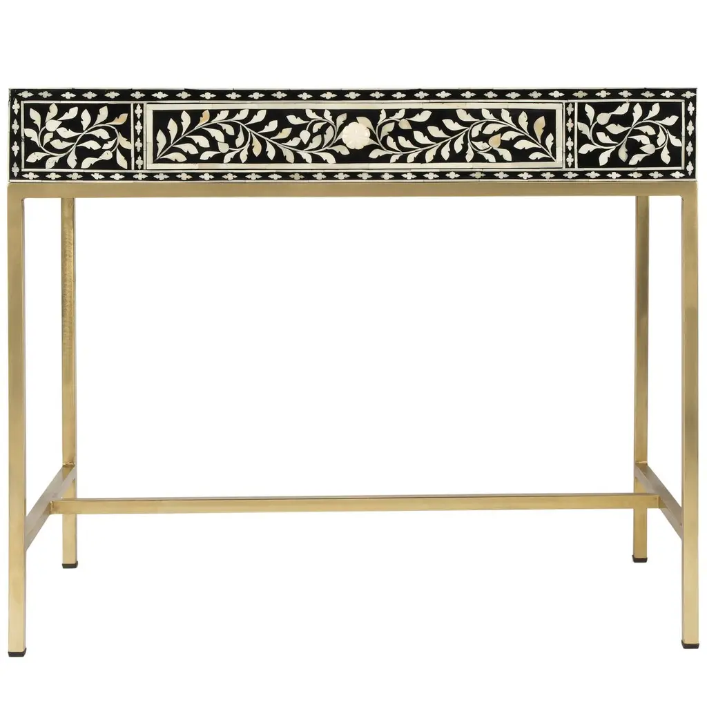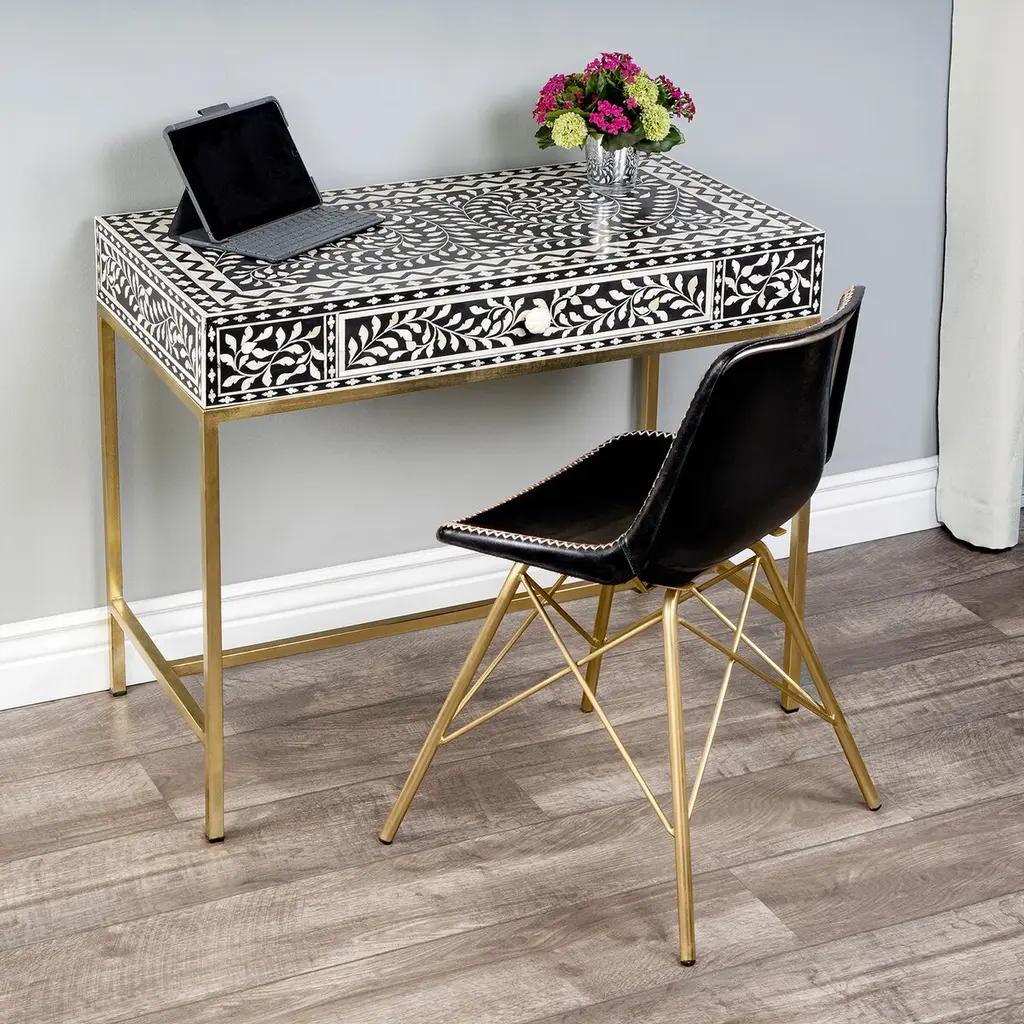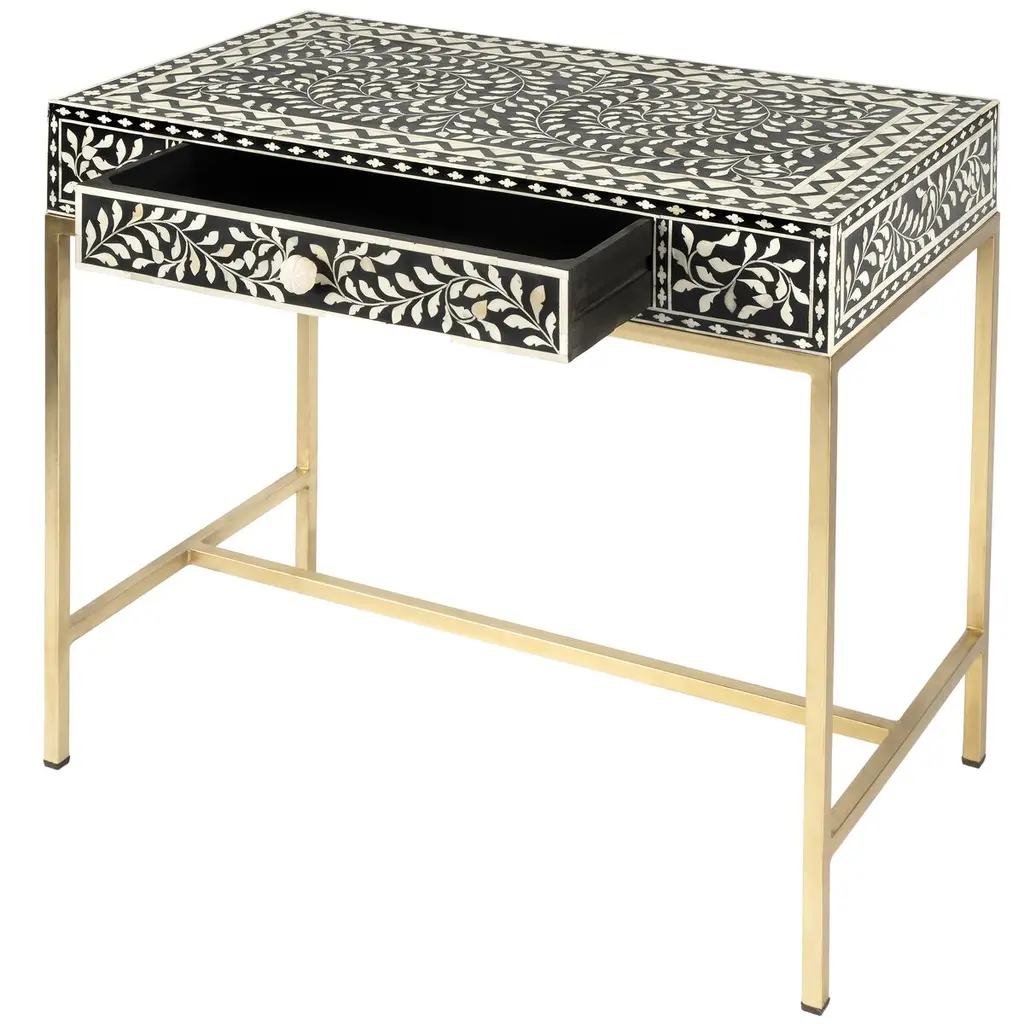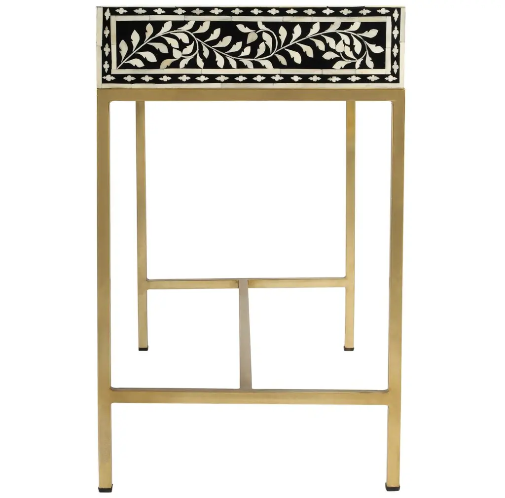 This beautiful writing desk is a harmonious blend of vintage and modern design. With an open, airy base and convenient storage drawer, this desk will be the centerpiece of an office, living space, or bedroom. Expertly crafted on a hand forged iron base, it features an alluring botanical motif dramatically framed within a black background.