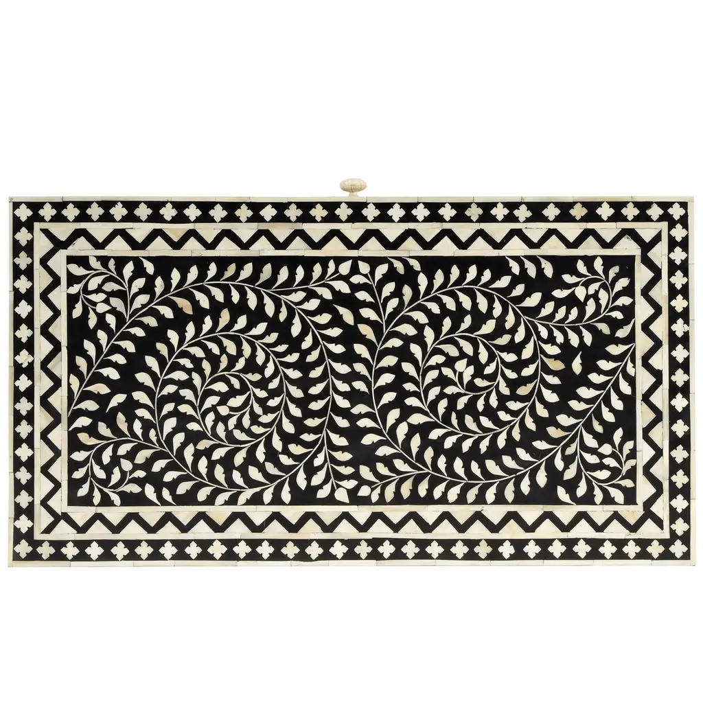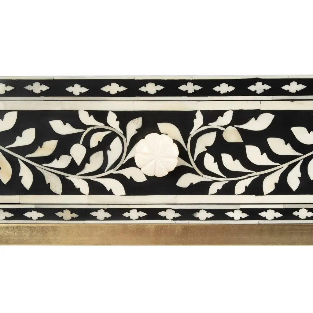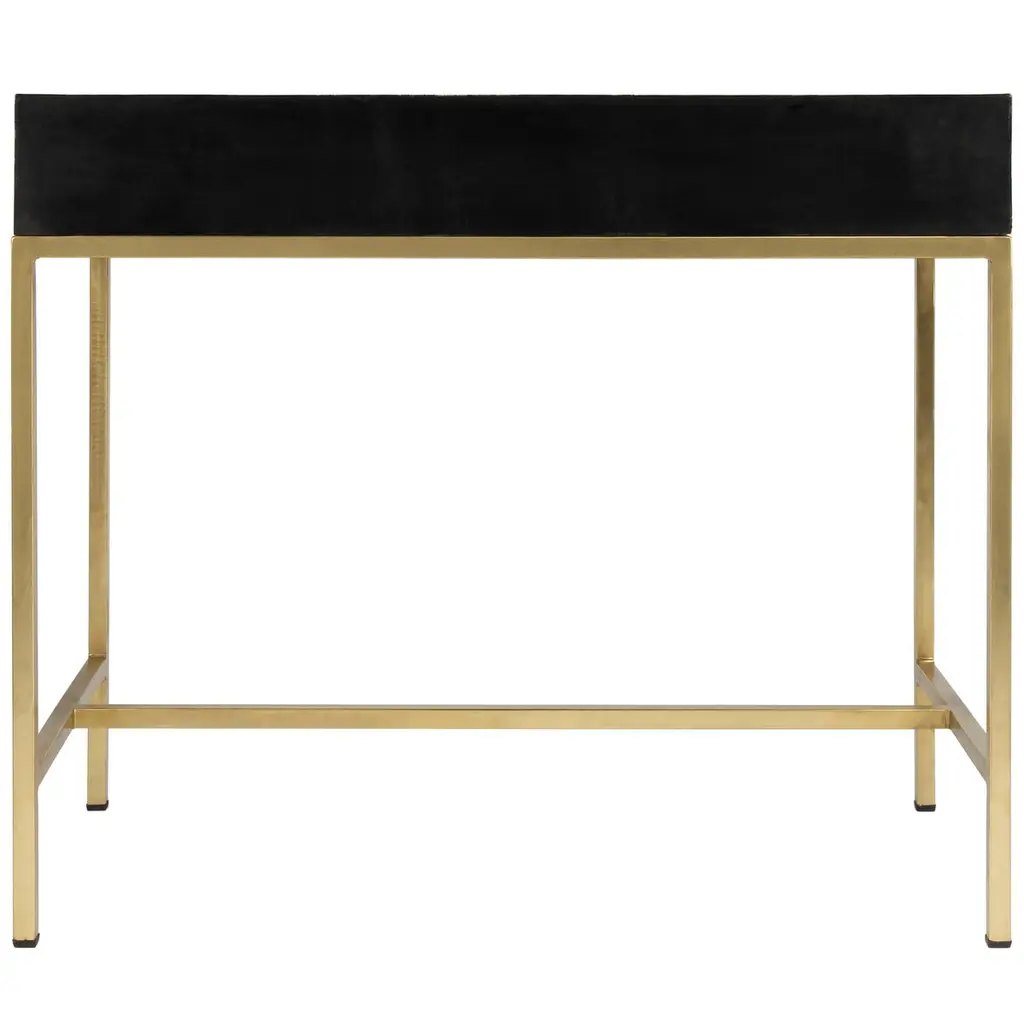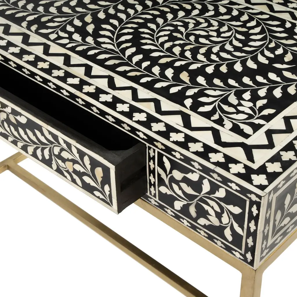 This beautiful writing desk is a harmonious blend of vintage and modern design. With an open, airy base and convenient storage drawer, this desk will be the centerpiece of an office, living space, or bedroom. Expertly crafted on a hand forged iron base, it features an alluring botanical motif dramatically framed within a black background.