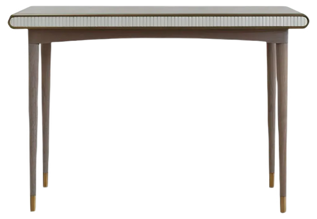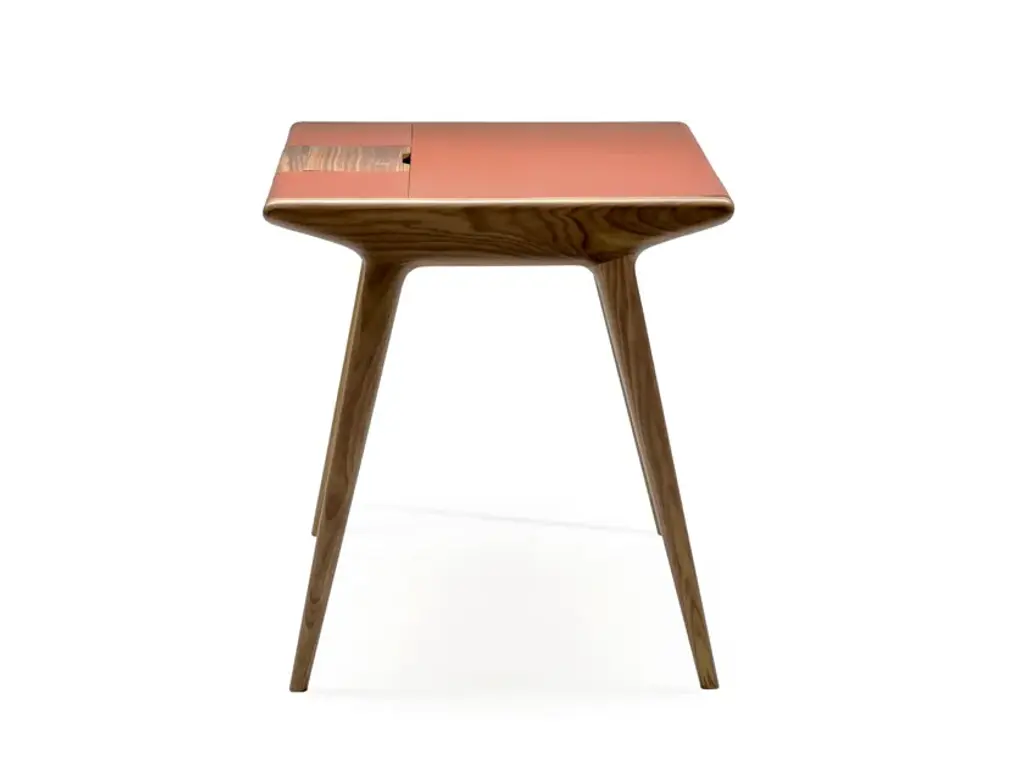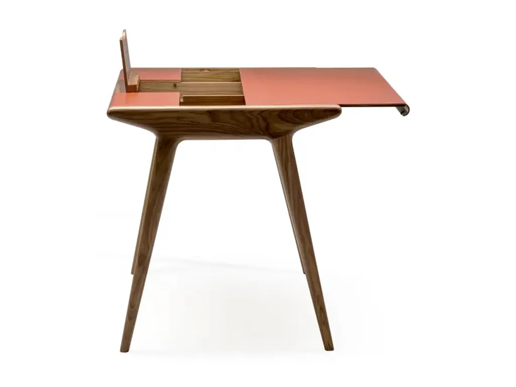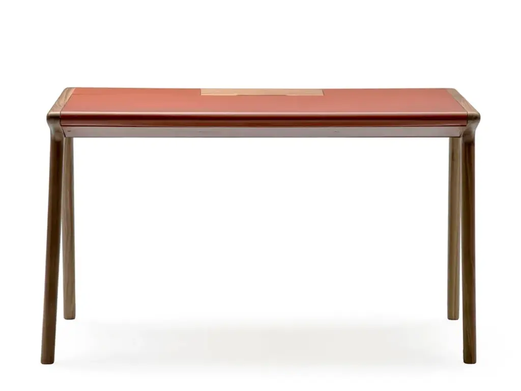 SCRIBA is a desk of modern and fluid shapes that combines refined and elegant materials such as wood and cuoio. When closed, it has an essential, clean and traditional shape that can be elegantly placed in any contemporary home setting, it is only when you slide forward the top that Scriba reveals its most current and technological character with hidden storage compartments and USB sockets for electronic devices charging.The cuoio desk top is refined and the beauty of the Canaletto walnut sinuous legs, obtained with variable sections, it makes it suitable to a modern lifestyle. The price refers to the configuration shown in the photos.