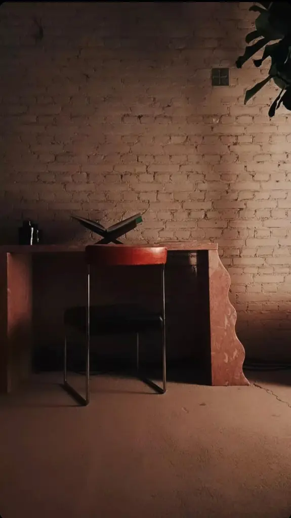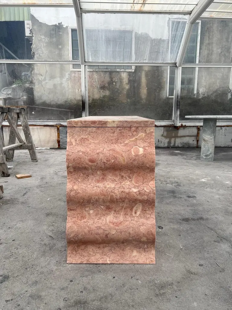 Two wave-shaped stone feet are the feature of this multipurpose console/desk. This sculptural piece has a perfect eye for proportion abed form and colour. The piece fits well in contemporary interiors inspired by art, and minimalism and even in an eclectic interior with a rustic mix of modern items. It is reminiscent of the work of Ettore Sottsass. Constructed entirely from solid stone in tones of pink and reddish-coral punctuated by veins of ocher and beige. Finished with a honed finish that enhances the richness of the beautiful natural limestone. The Dimensions: 120x50xH78cm - enable it to function as both a desk and console. Item can be made to order in your perfect custom dimensions and is also available in a range of stones and finishes. Please note that tones, patterns and veining can vary due to the nature of the material.
