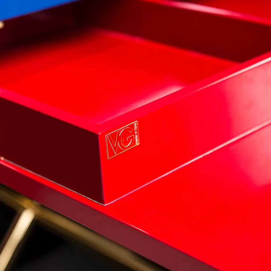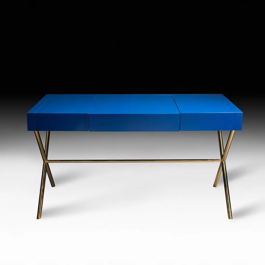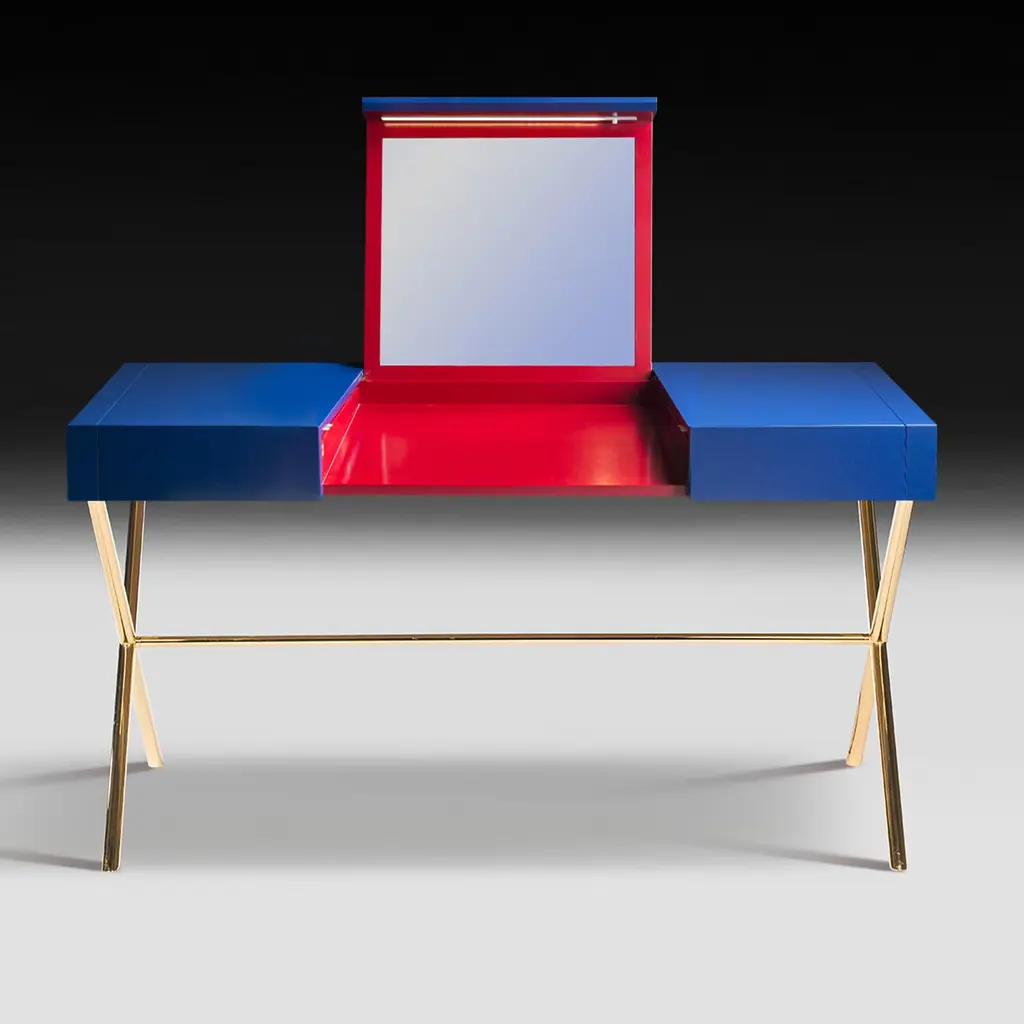 This exquisite vanity desk with its luxurious elegance will enhance any decor. This desk can be used in a study or can be part of an entryway and features an opening top. It has a central opening top with a fitted mirror inside and an LED light. It also features two lacquered red sliding internal drawers, while outside it is lacquered matte blue and the base is in galvanized metal with a 24k gold finishing coat.