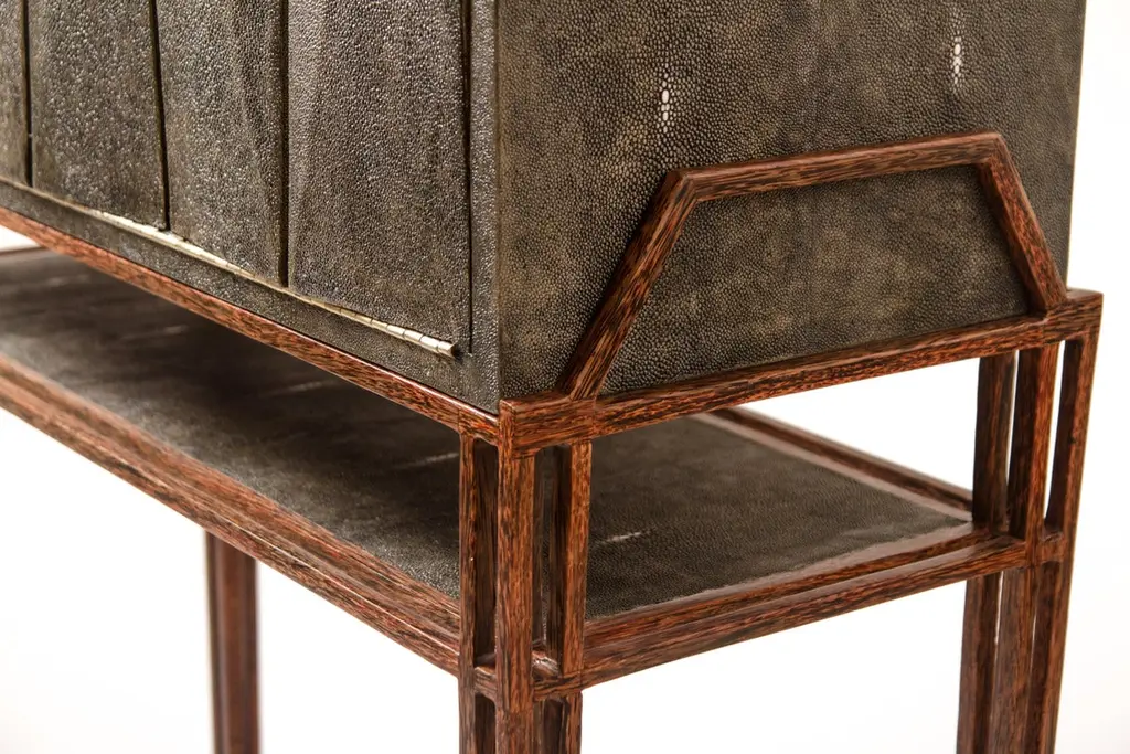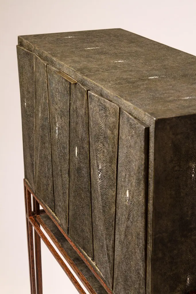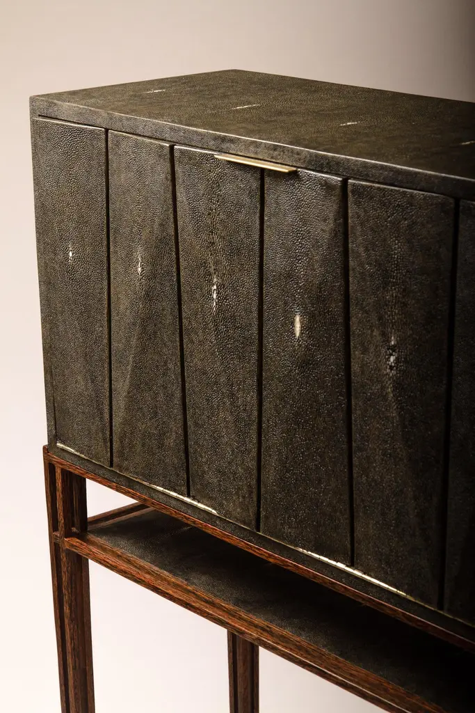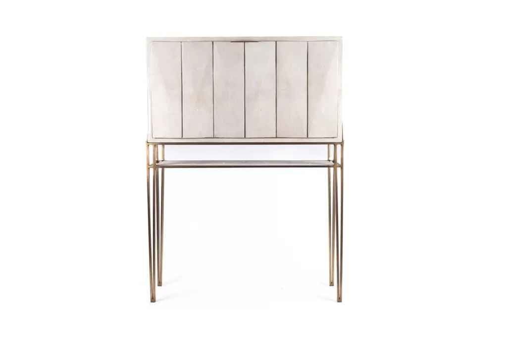 The Paris based label has distinguished themselves since their launch, with their iconic use of shagreen mixed with brass and other exotic materials. All furniture is handcrafted by skilled artisans, ultimately making each piece unique, designed in Paris and produced in the Philippines.The secrétaire desk is the perfect functional working unit. The flap top opens up into a desk with several compartments, inlaid in antique black shagreen and wood veneer, to store items and once closed offers a beautiful piece to look at. The geometric removable top, sits on a beautiful palm wood frame and sleek legs. The piece comes in a cream version with bronze-patina brass legs, image at end of slide.The finish of the shagreen is authentic as it is hand-dyed and the designer calls the finish look: "antique black shagreen."The dimensions of this piece are 86 x 32 x 118 cm / 34" x 13" x 46"All R&Y Augousti pieces are handmade by artisans, ultimately making each piece unique. Custom color/sizing available on request. Wipe clean with soft dry cloth.Acclaimed design duo Ria & Yiouri Augousti have established themselves since the 1990s as pioneers of modern-vintage style through their luxurious Art Deco inspired collections.The Paris based label has distinguished themselves since their launch, with their iconic use of shagreen mixed with brass and other exotic materials. All furniture is handcrafted by skilled artisans, ultimately making each piece unique. All shagreen-covered items should be kept out of direct sunlight, color variants may occur on the stingray and other exotic finishes, but this showcases the Parisian label's commitment to creating authentic luxurious products using natural components.