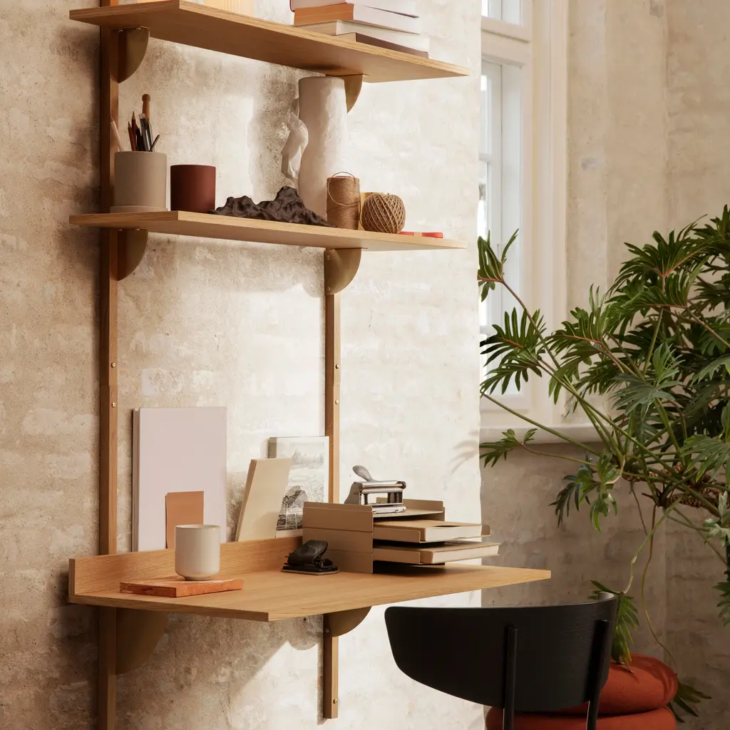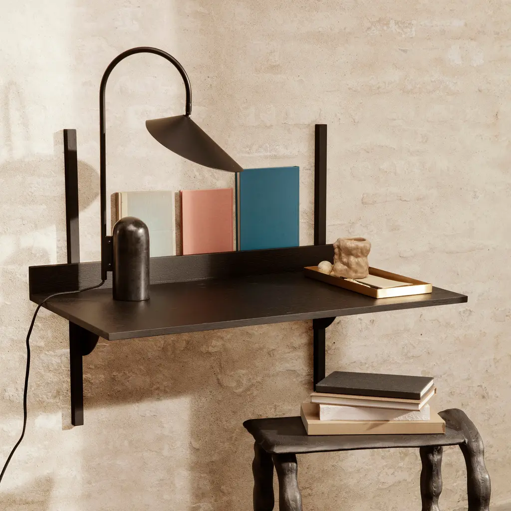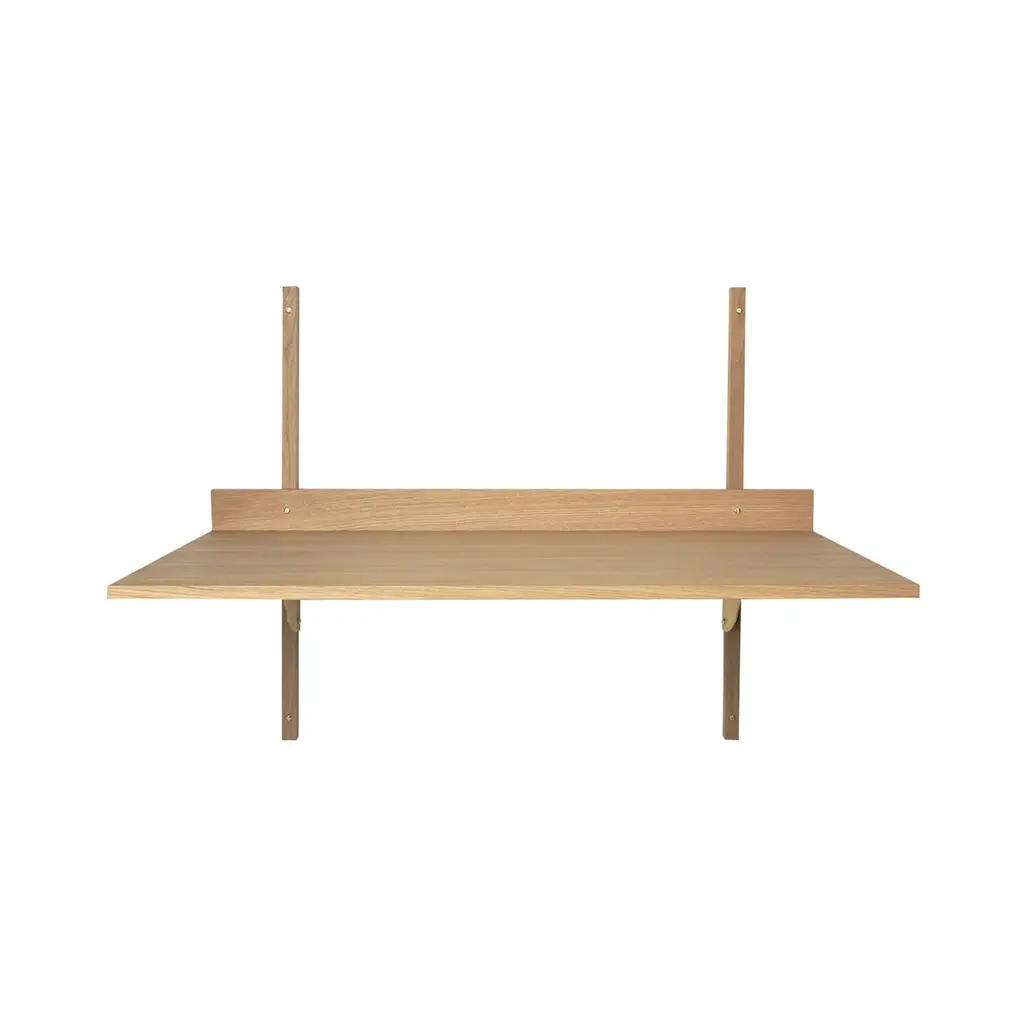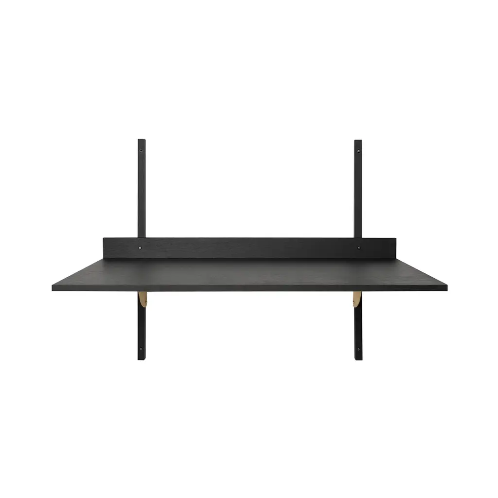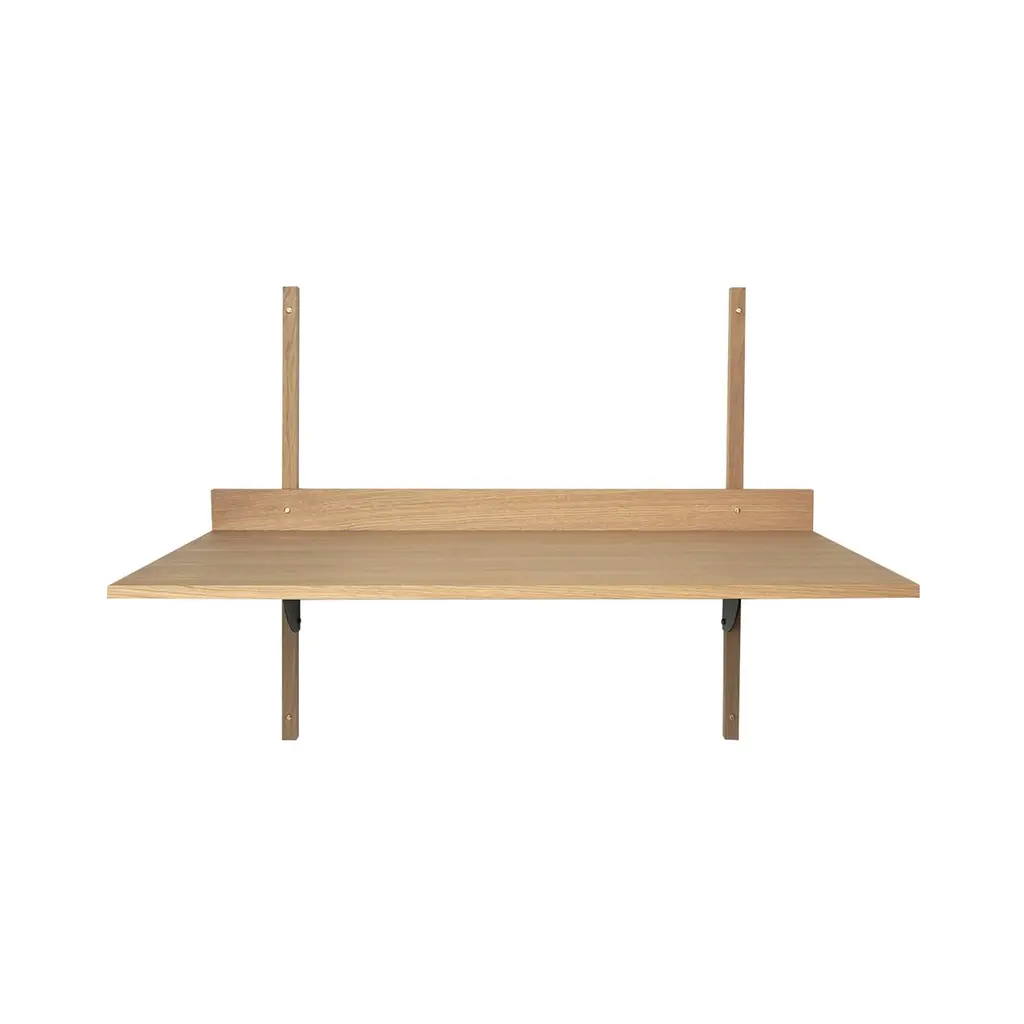 Copenhagen-based Ferm Living revives the midcentury wall-hung desk with a new verve. Sector is defined by its sturdy simplicity and classic functionality but adds the frisson of brass trim to the wooden surface. Use the desk by itself or combine it with Sector collection shelves to configure a cohesive workspace. The narrow inside ledge is ideal for propping up hand-written notes or a favorite photograph. Choose between natural oak veneer or black-stained ash veneer with brackets in either polished or blackened brass.