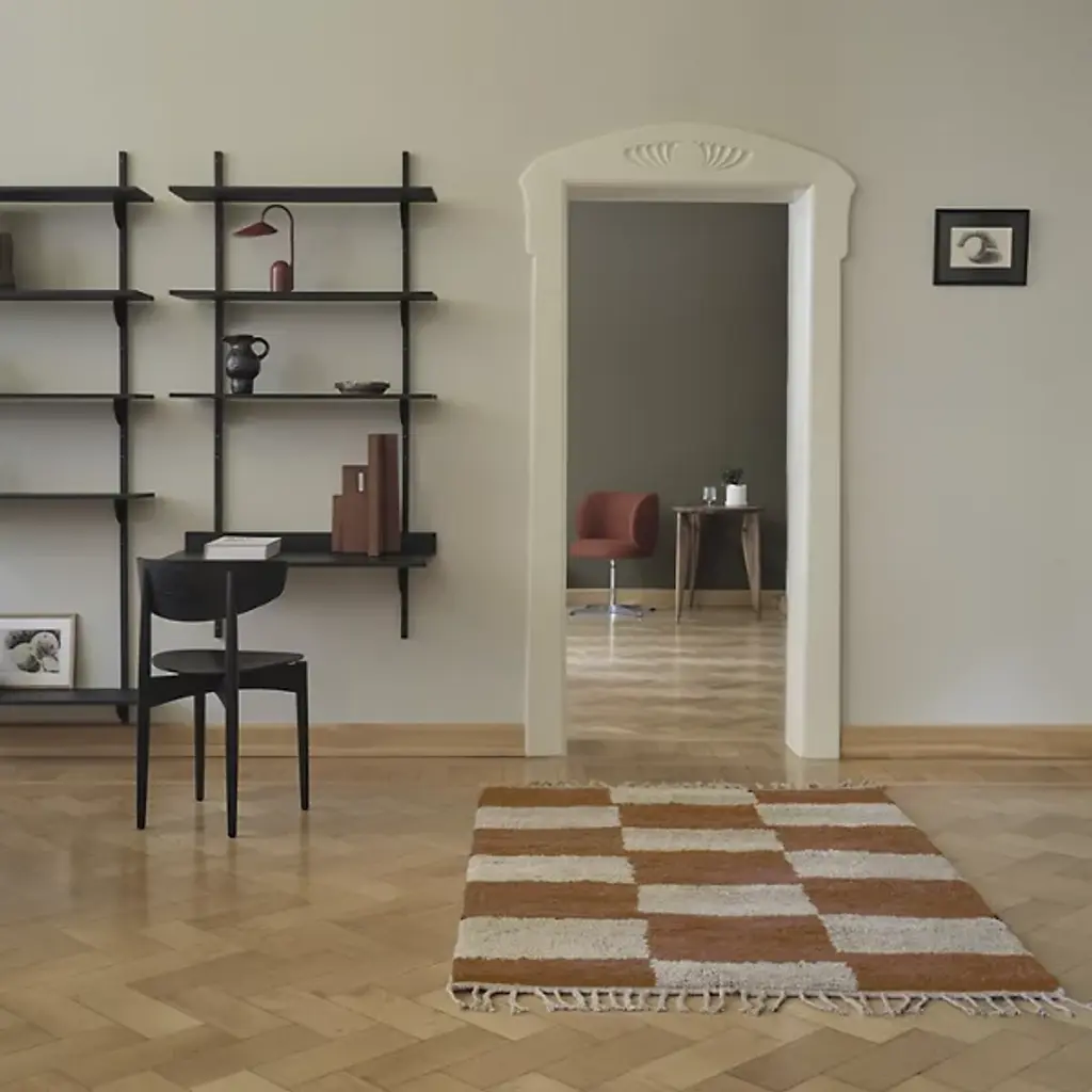 The Sector Desk from Ferm Living reinterprets midcentury shelving systems through wall-mounted construction, pairing wood planes with brass brackets. The desk can function independently or integrate with Sector shelving components to form a cohesive modular workspace along a wall. A raised lip at the back edge creates a narrow ledge for propping papers or photographs, turning a functional detail into an opportunity for display. Constructed from stained ash veneer over an MDF core with brass brackets, the piece achieves its visual impact through clean lines and material contrast.