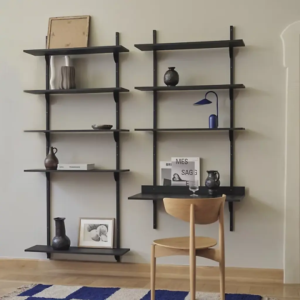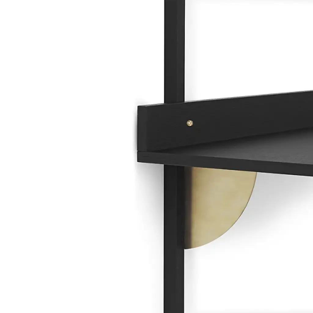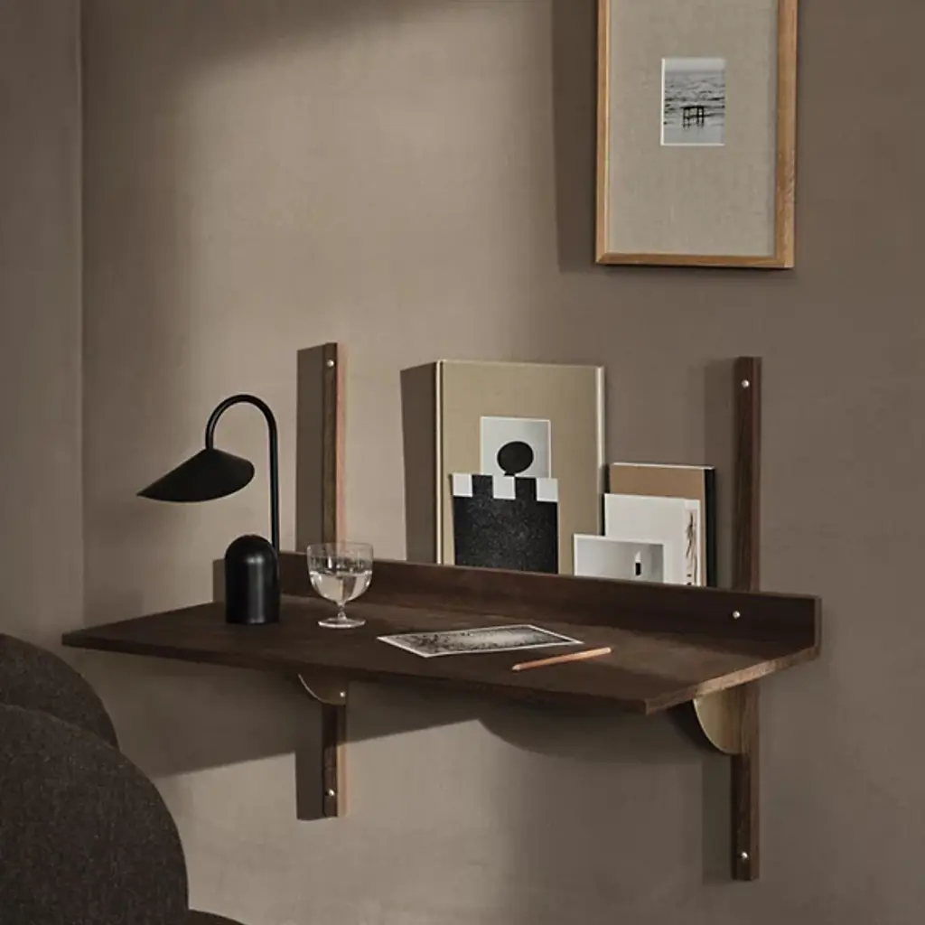 The Sector Desk from Ferm Living reinterprets midcentury shelving systems through wall-mounted construction, pairing wood planes with brass brackets. The desk can function independently or integrate with Sector shelving components to form a cohesive modular workspace along a wall. A raised lip at the back edge creates a narrow ledge for propping papers or photographs, turning a functional detail into an opportunity for display. Constructed from stained ash veneer over an MDF core with brass brackets, the piece achieves its visual impact through clean lines and material contrast.