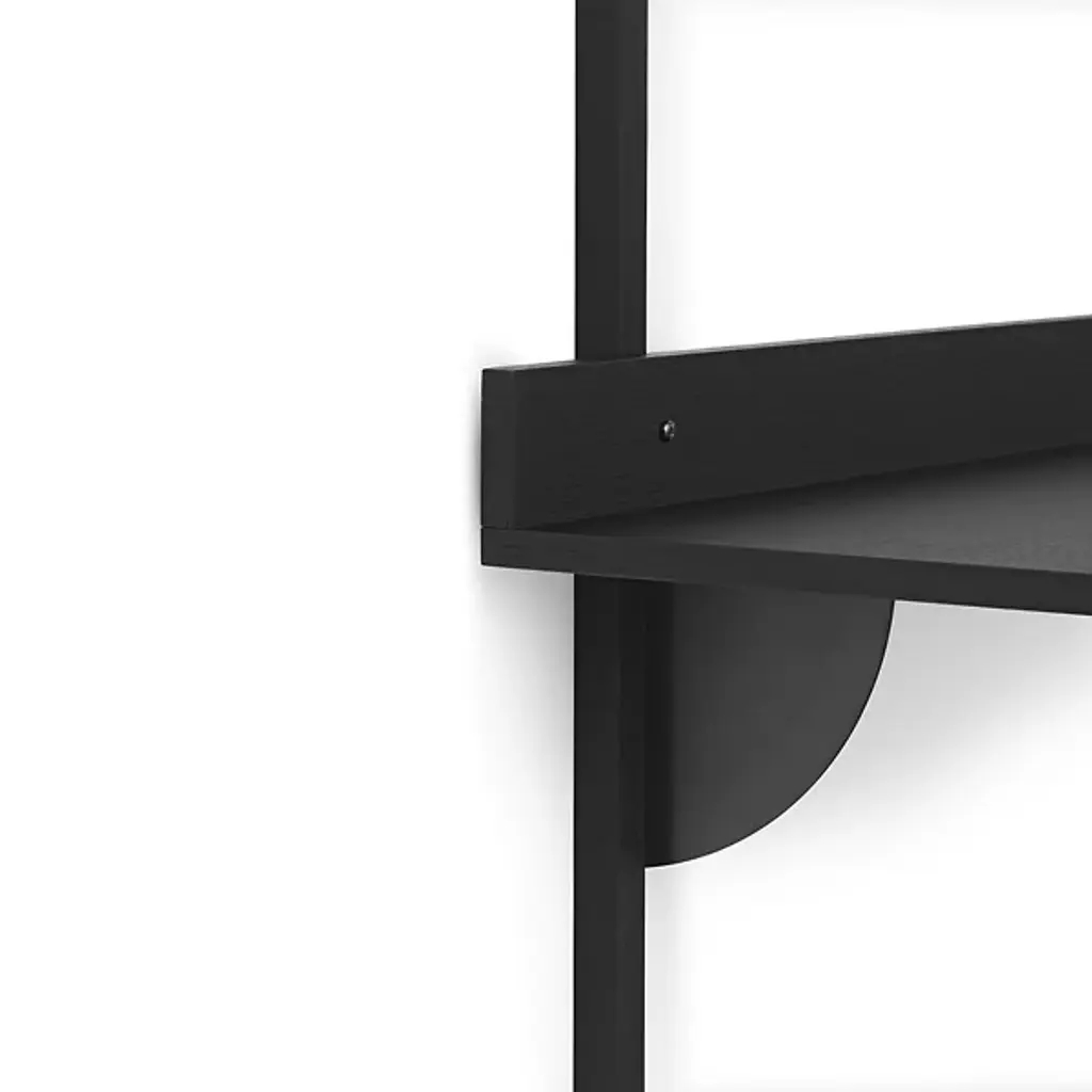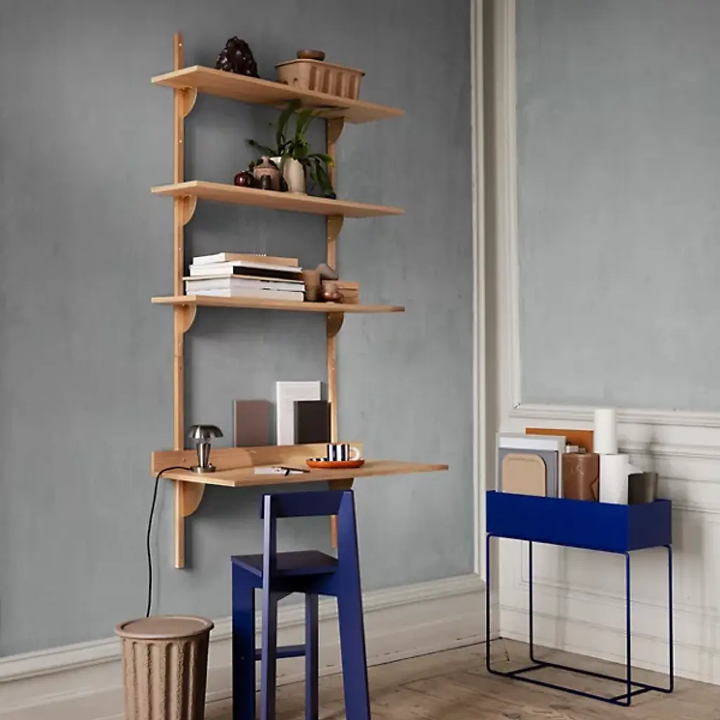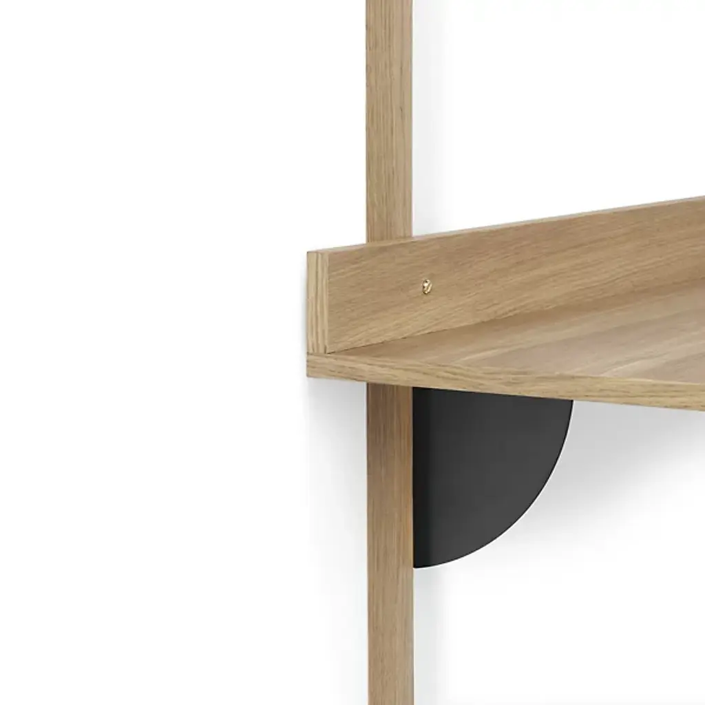 The Sector Desk from Ferm Living reinterprets midcentury shelving systems through wall-mounted construction, pairing wood planes with brass brackets. The desk can function independently or integrate with Sector shelving components to form a cohesive modular workspace along a wall. A raised lip at the back edge creates a narrow ledge for propping papers or photographs, turning a functional detail into an opportunity for display. Constructed from stained ash veneer over an MDF core with brass brackets, the piece achieves its visual impact through clean lines and material contrast.