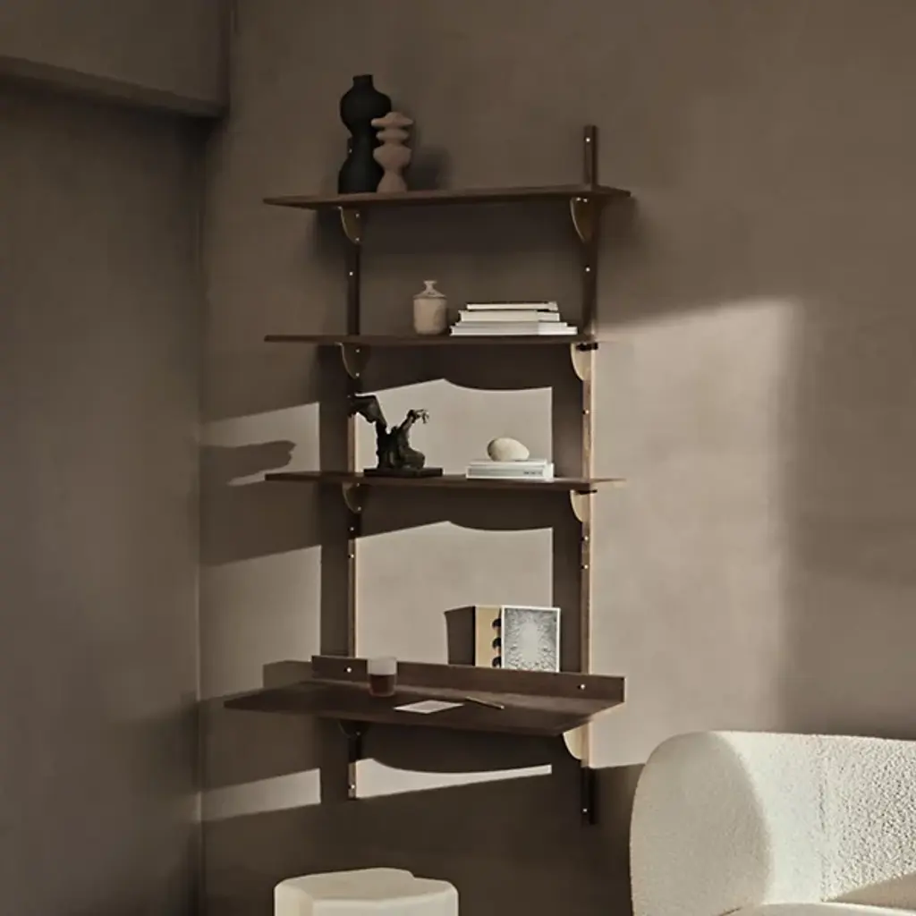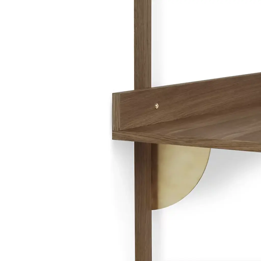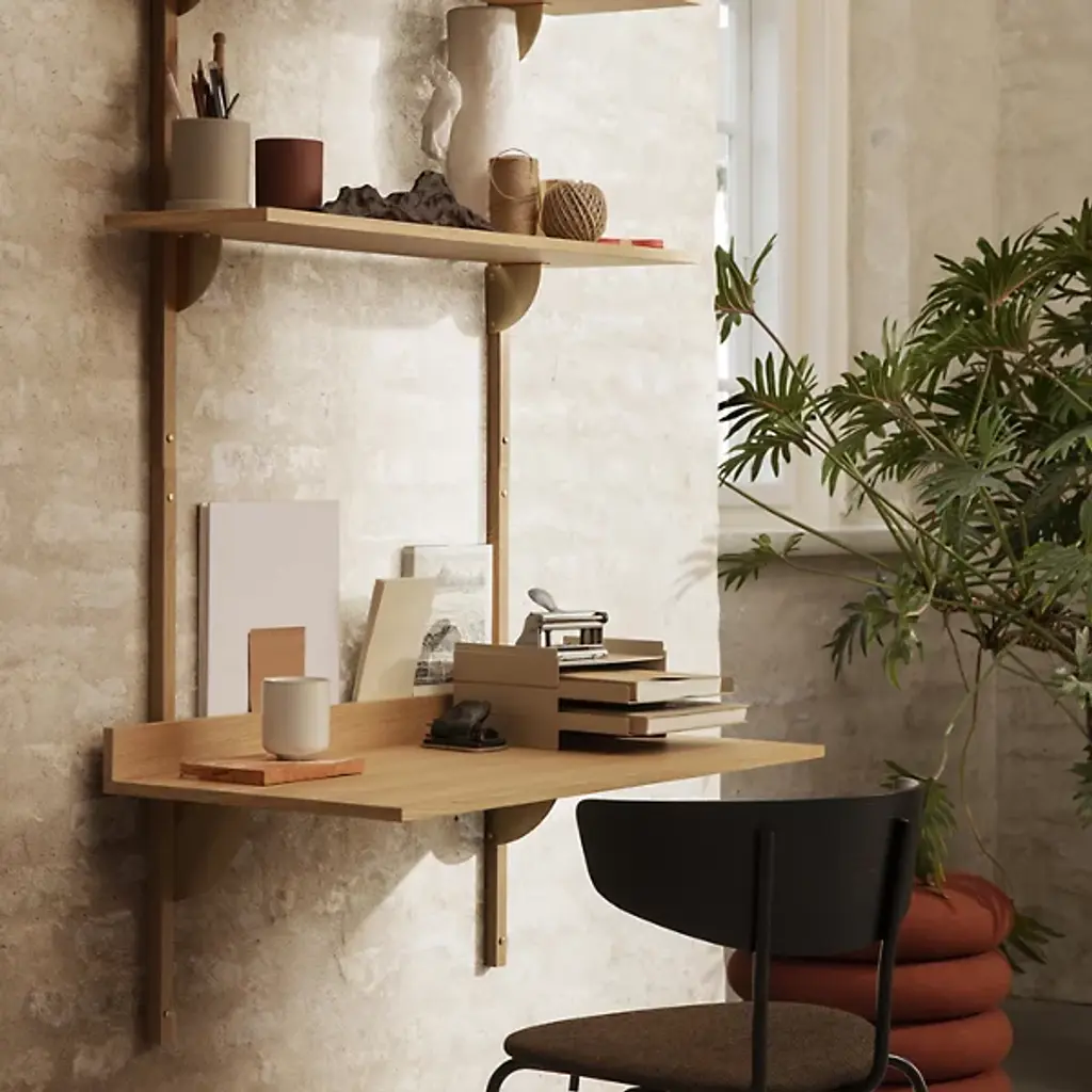 The Sector Desk from Ferm Living reinterprets midcentury shelving systems through wall-mounted construction, pairing wood planes with brass brackets. The desk can function independently or integrate with Sector shelving components to form a cohesive modular workspace along a wall. A raised lip at the back edge creates a narrow ledge for propping papers or photographs, turning a functional detail into an opportunity for display. Constructed from stained ash veneer over an MDF core with brass brackets, the piece achieves its visual impact through clean lines and material contrast.
