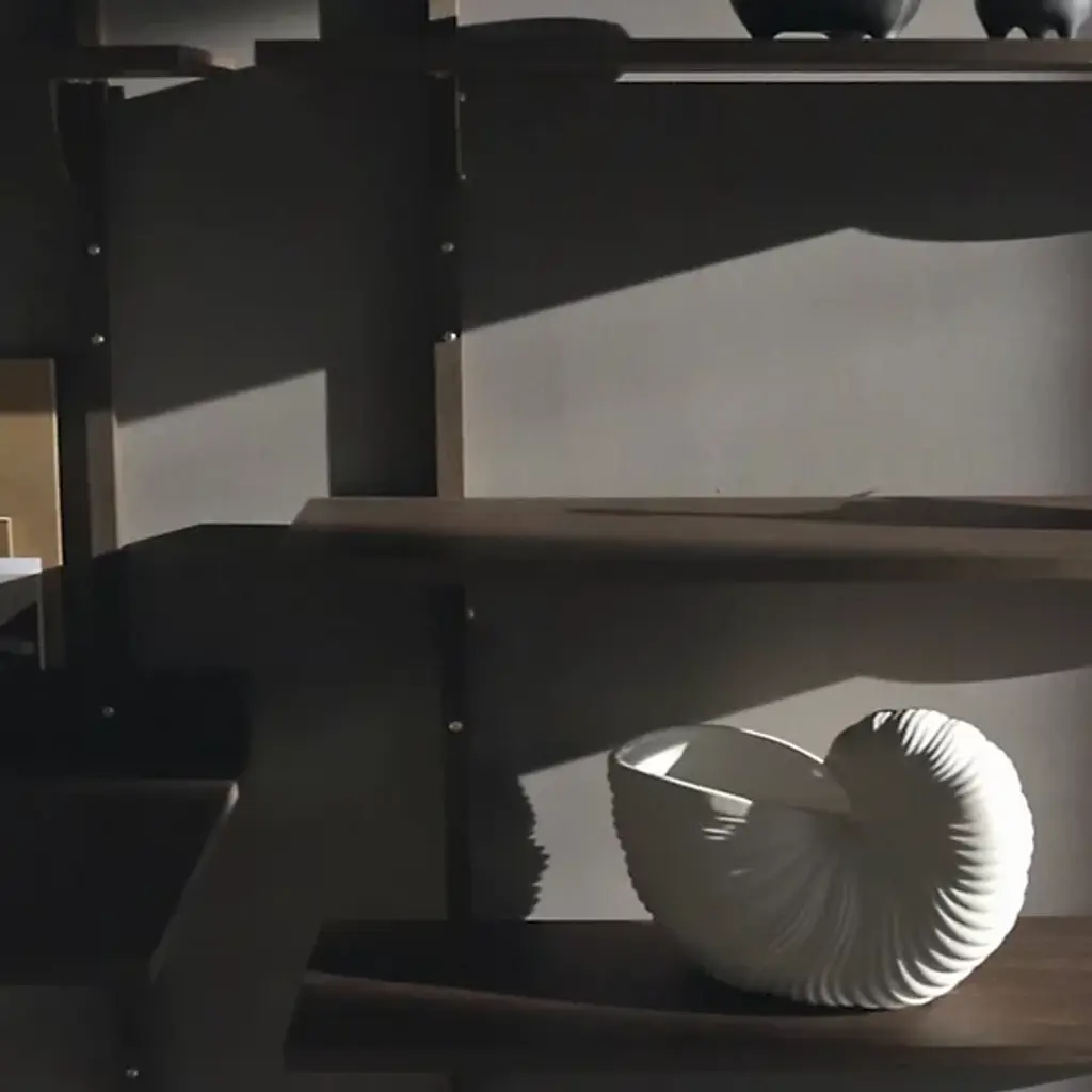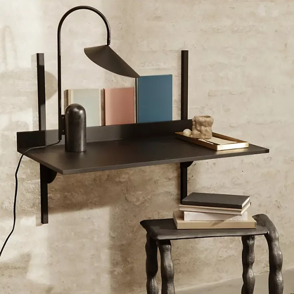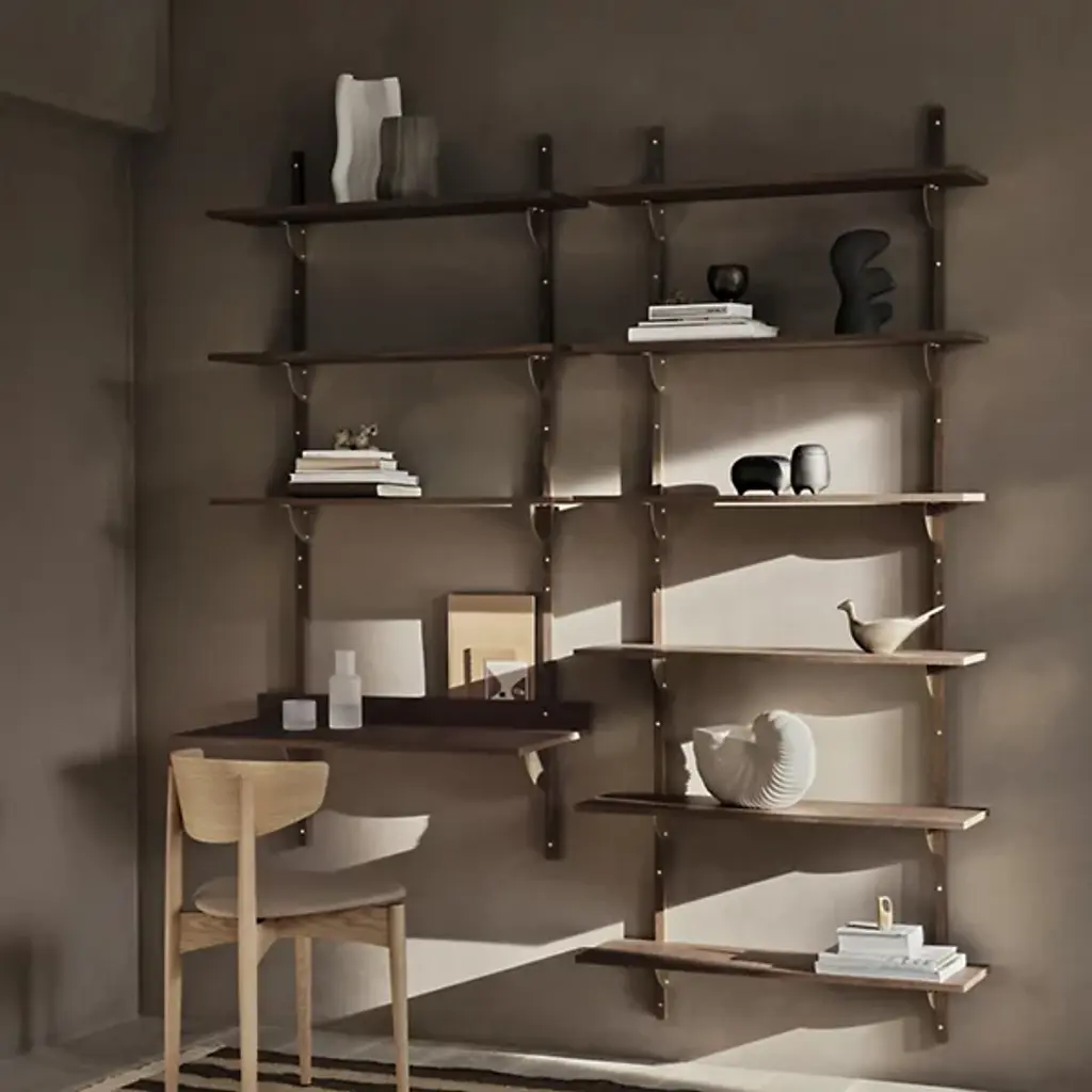 The Sector Desk from Ferm Living reinterprets midcentury shelving systems through wall-mounted construction, pairing wood planes with brass brackets. The desk can function independently or integrate with Sector shelving components to form a cohesive modular workspace along a wall. A raised lip at the back edge creates a narrow ledge for propping papers or photographs, turning a functional detail into an opportunity for display. Constructed from stained ash veneer over an MDF core with brass brackets, the piece achieves its visual impact through clean lines and material contrast.