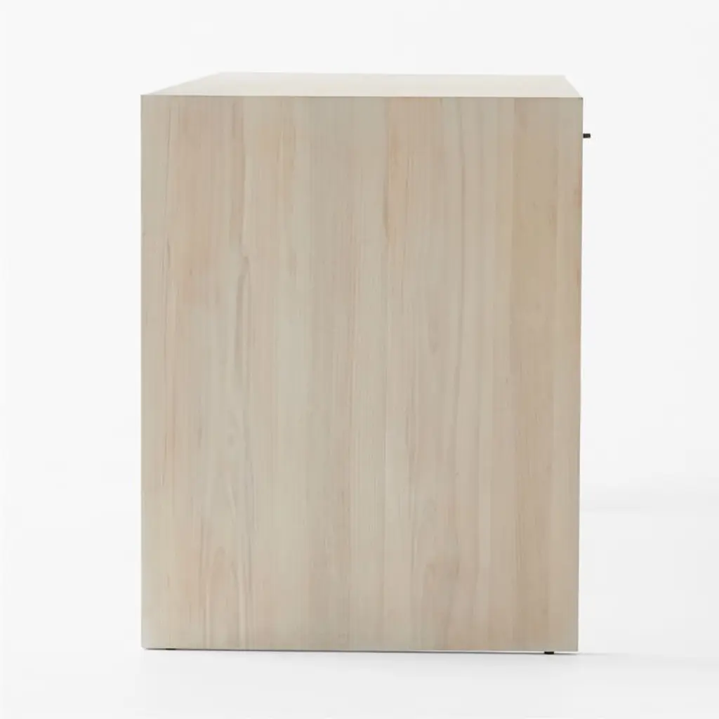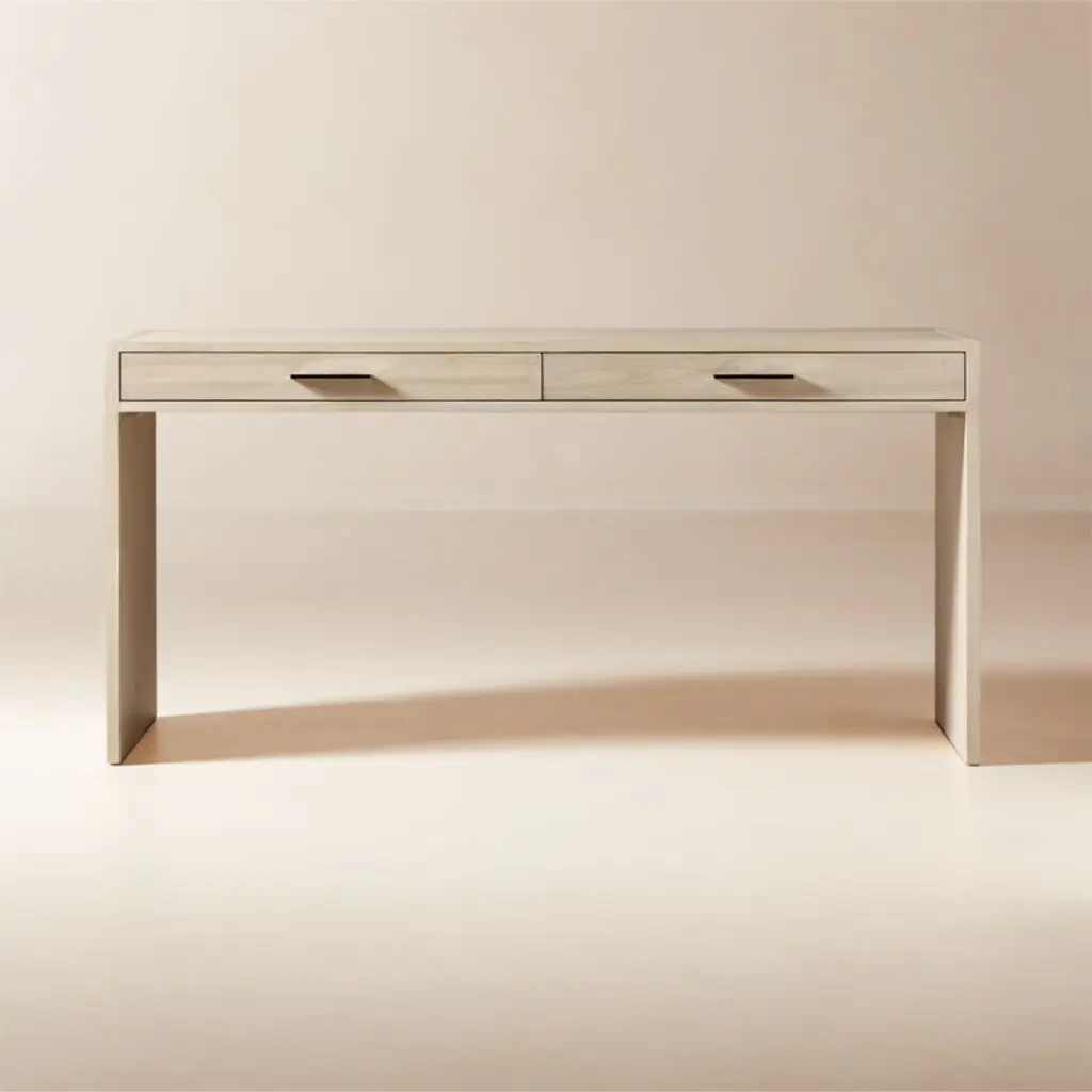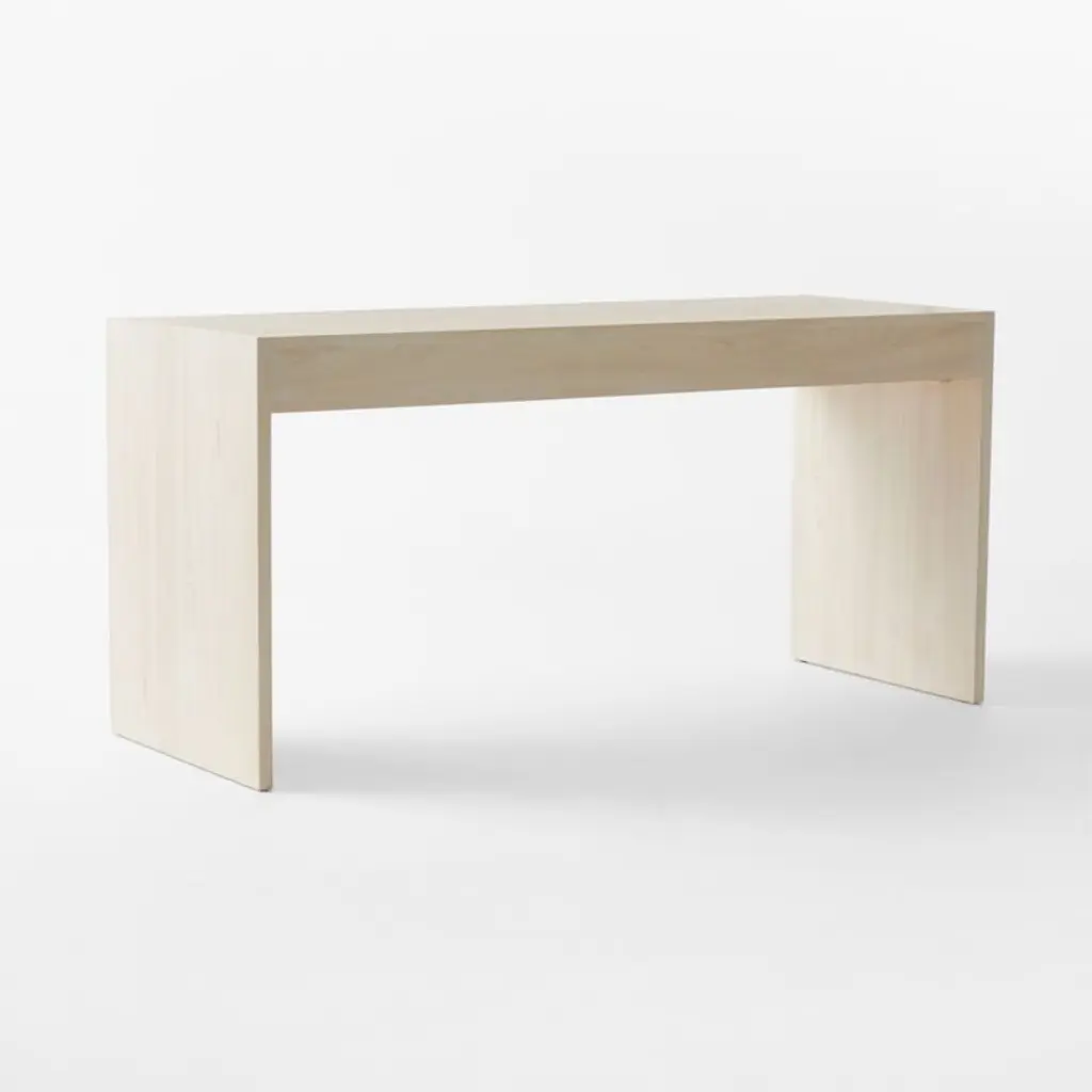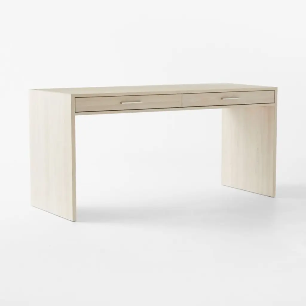 Minimalist two-drawer desk from Jannis Ellenberger is distinguished by its classic rectangular profile rendered in a bleached ash wood veneer. Complemented by slim stainless steel accents, the desk elegantly balances the coolness of polished metal with the warmth of bleached oak. Pair with the Segnato file cabinet for a coordinated look. CB2 exclusive.
