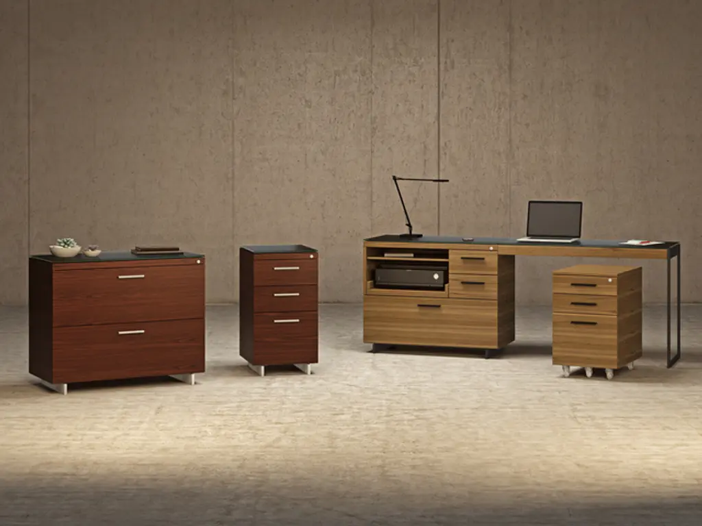 The cornerstone of the Sequel 20 office collection, the Sequel Desk is the foundation for an organized and inspiring workspace. Love where you work. Everyone needs a workspace that is comfortable and inviting, and if it can be beautifully designed and neatly organized all the better. Designed with an emphasis on ergonomics and organization, Sequel Office is full of unique features that integrate technology into the office space while creating a comfortable and organized place to work. Work smart. We believe an office should always be organized and efficient. But what if it could inspire productivity too? Innovative features are integrated into every BDI office collection, ensuring that they work every bit as hard as you do. Six Finish Combinations Select from two steel frames—Satin Nickel and Black powder coat—and three wood finishes to create the Sequel Office that is perfect for your style. Satin-Etched Glass This highly durable tempered glass has an unbelievably soft finish that provides protection from dings and scratches. Optional Return Extend your available workspace with the optional Sequel Return, which attaches securely to either side of the desk. Productivity at Your Fingertips A generously-sized keyboard drawer includes space for recharging small devices; a flip-down front blends into the desktop when not in use. Lined with nonslip material, contents stay secure while work stays comfortable. Fully Finished The Sequel Desk comes fully finished complete with a back panel for use when floating the desk in the middle of a room. Wire Management Easy-access front and rear panels conceal cords and cables and can be tilted down for convenient access to all of your connections. When positioned against a wall, leave off the back panel for direct access to wall outlets.