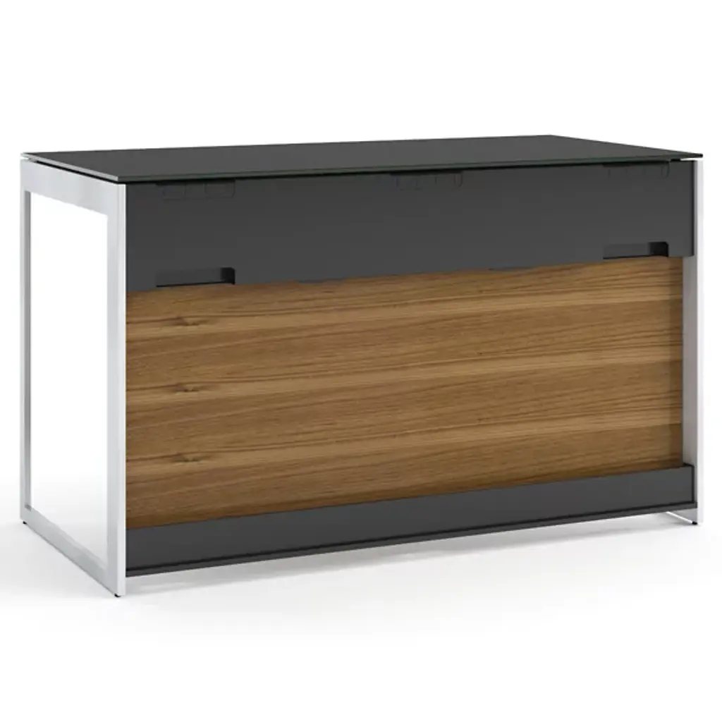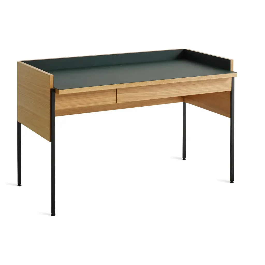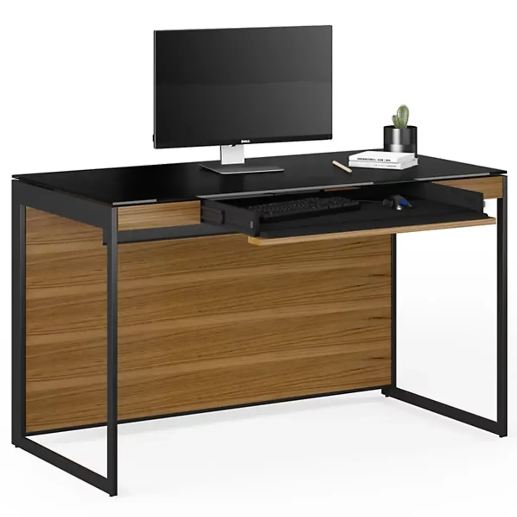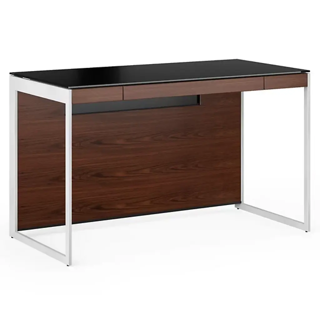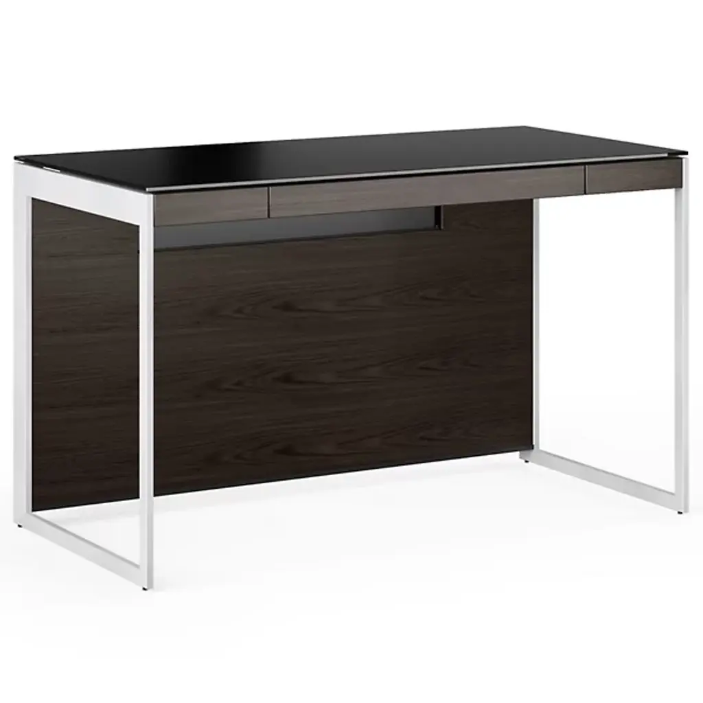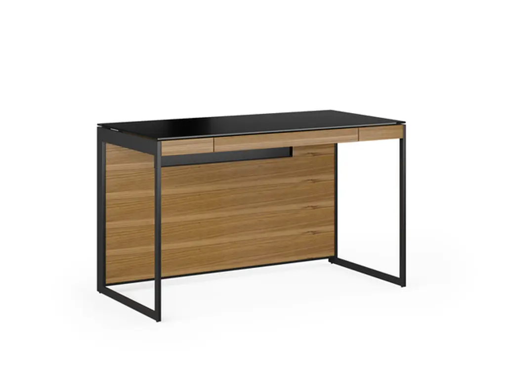 Satisfy your work style in a smaller space. The Sequel 20 Compact Desk by BDI is a design that proves that good things really do come in small packages. Designed for smaller offices, this desk has a compact profile with all the innovative features that make your workspace comfortable, organized and efficient. Made from solid Steel with open sides and base, the desk showcases a handsome Hardwood Veneer front. A multifunctional flip-down drawer lined with a unique non-slip material becomes home to a keyboard, mouse, phone and other rechargeable equipment. Under the desk, a wire management ledge houses a power bar and serves as the desk’s power hub. A front panel that tilts for easy access to connections completes this compact desk.