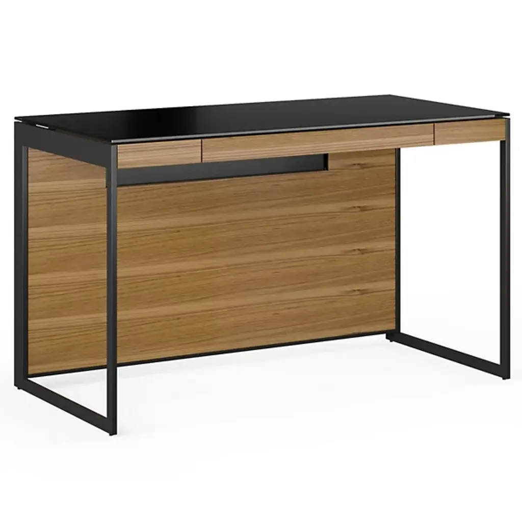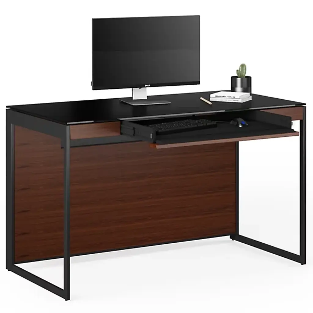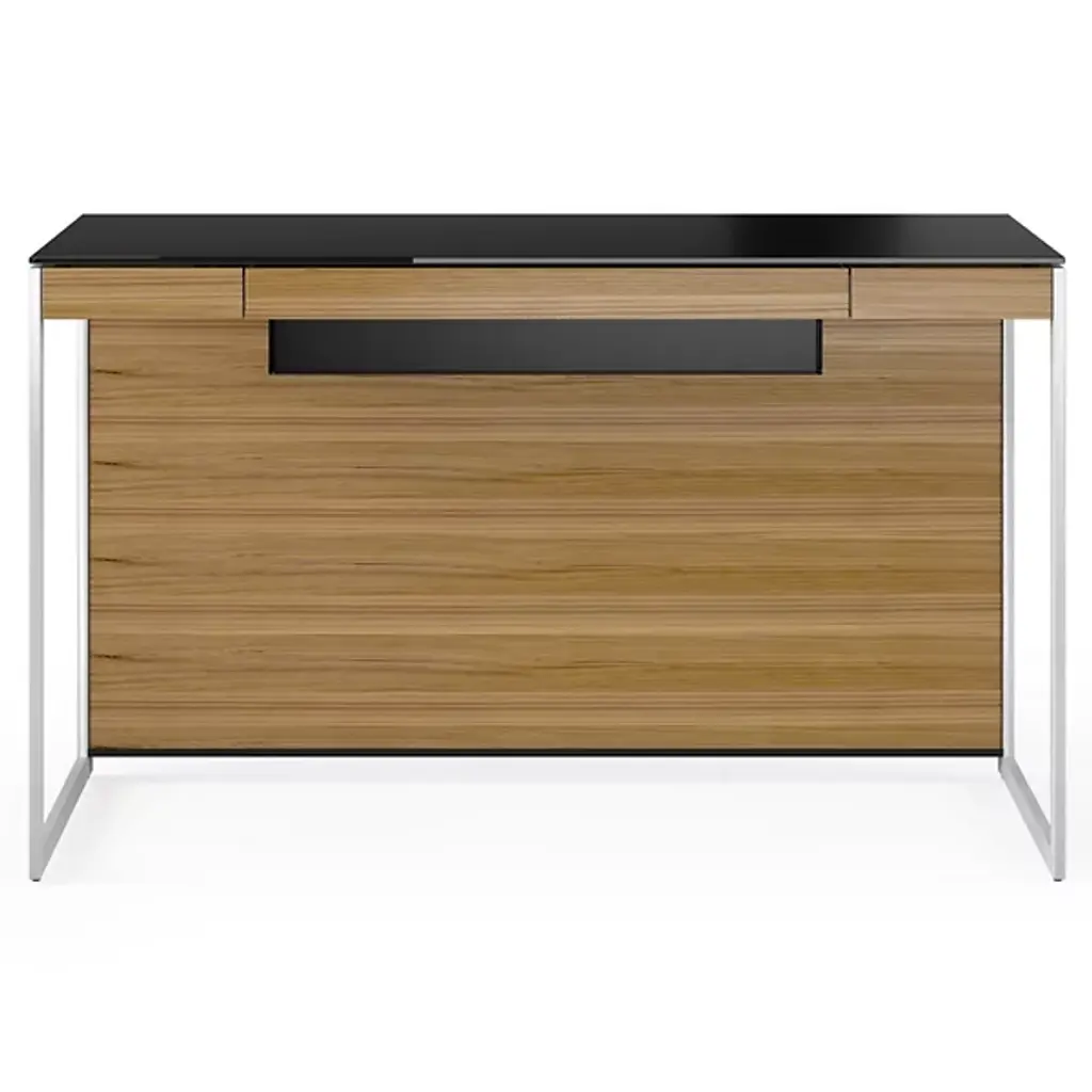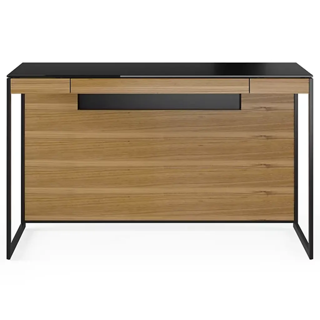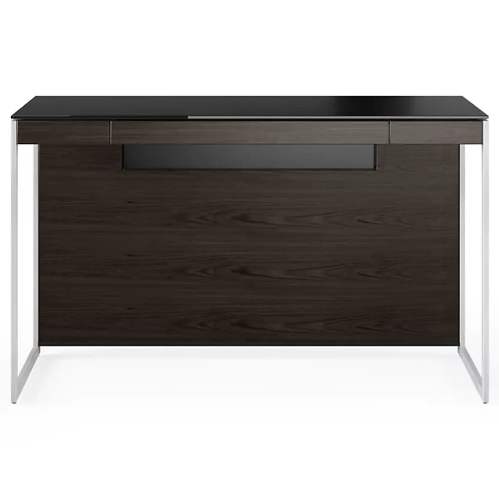 Satisfy your work style in a smaller space. The Sequel 20 Compact Desk by BDI is a design that proves that good things really do come in small packages. Designed for smaller offices, this desk has a compact profile with all the innovative features that make your workspace comfortable, organized and efficient. Made from solid Steel with open sides and base, the desk showcases a handsome Hardwood Veneer front. A multifunctional flip-down drawer lined with a unique non-slip material becomes home to a keyboard, mouse, phone and other rechargeable equipment. Under the desk, a wire management ledge houses a power bar and serves as the desk’s power hub. A front panel that tilts for easy access to connections completes this compact desk.