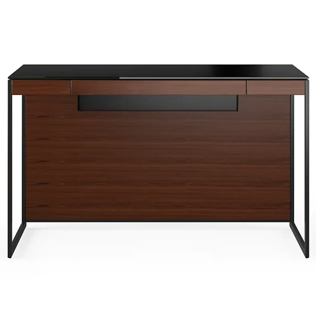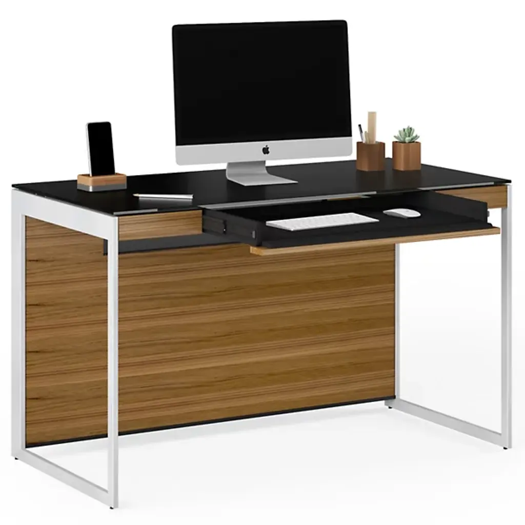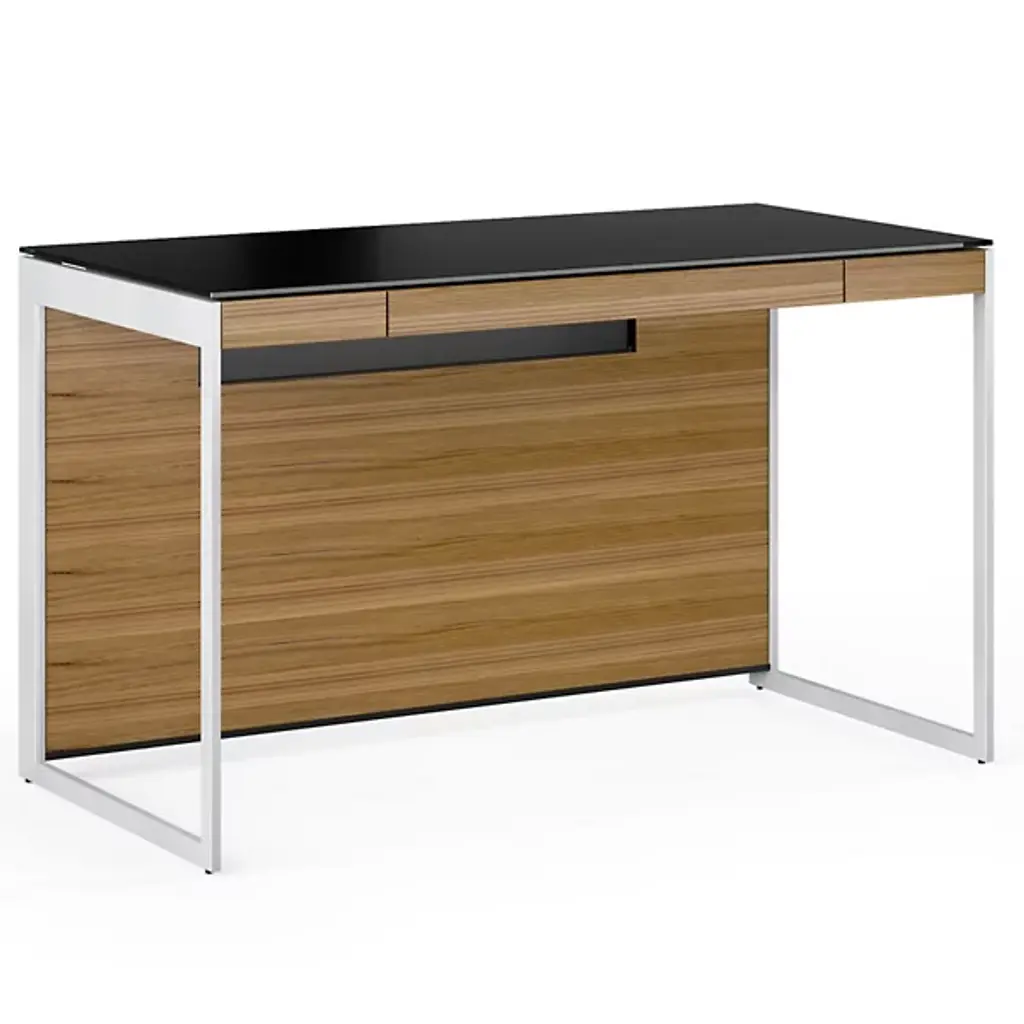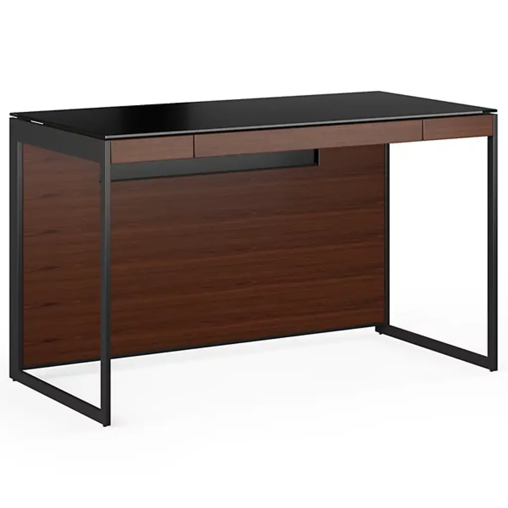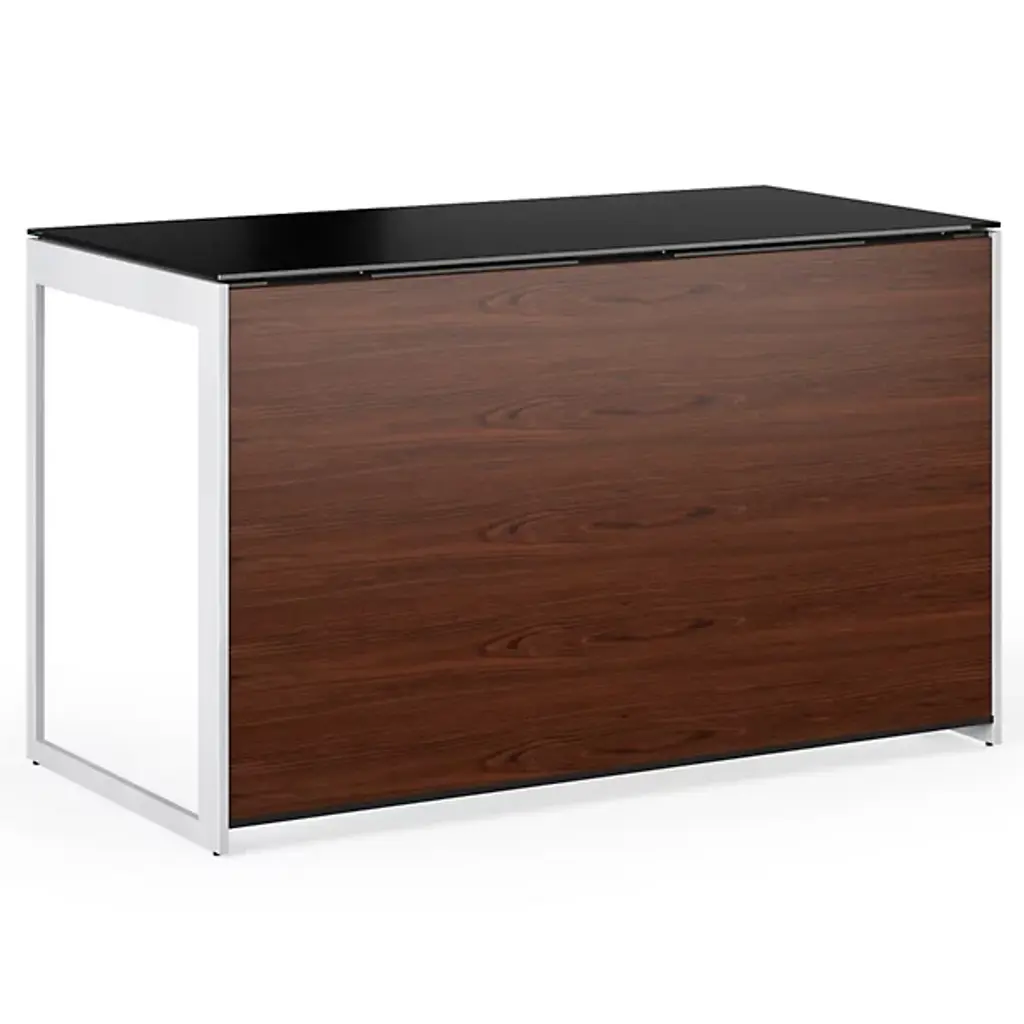 Satisfy your work style in a smaller space. The Sequel 20 Compact Desk by BDI is a design that proves that good things really do come in small packages. Designed for smaller offices, this desk has a compact profile with all the innovative features that make your workspace comfortable, organized and efficient. Made from solid Steel with open sides and base, the desk showcases a handsome Hardwood Veneer front. A multifunctional flip-down drawer lined with a unique non-slip material becomes home to a keyboard, mouse, phone and other rechargeable equipment. Under the desk, a wire management ledge houses a power bar and serves as the desk’s power hub. A front panel that tilts for easy access to connections completes this compact desk.