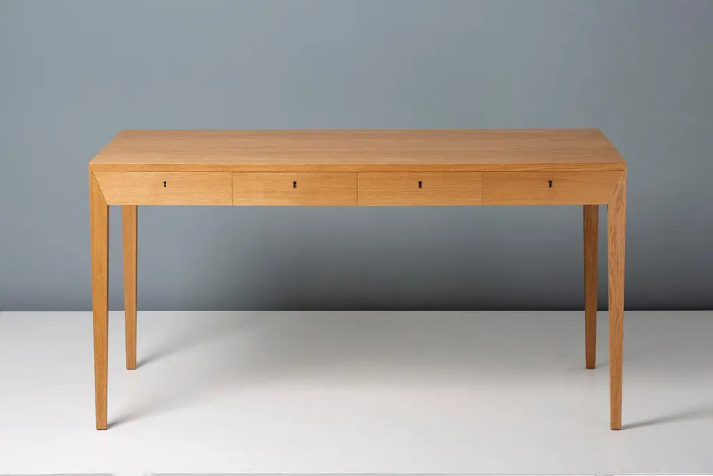 The iconic Model 36 desk from Danish designer Severin Hansen was designed in 1958 and exhibited at the annual Cabinetmaker’s Guild Exhibition in Copenhagen in the same year. It went on to become one of the most sought-after and recognised desks from the Danish Modern period.The Model 36 Desk has been relaunched in 2024 under exclusive license by Dagmar alongside other classic designs from the Severin Hansen archive. All pieces are made to order by hand in Denmark using traditional cabinetmaking techniques. The desk is available in oiled walnut and oiled oak (as shown).Dagmar are the exclusive manufacturers of the re-launched Severin Hansen collection.Measures: H: 73.5cm / D: 75cm / W: 143cm.