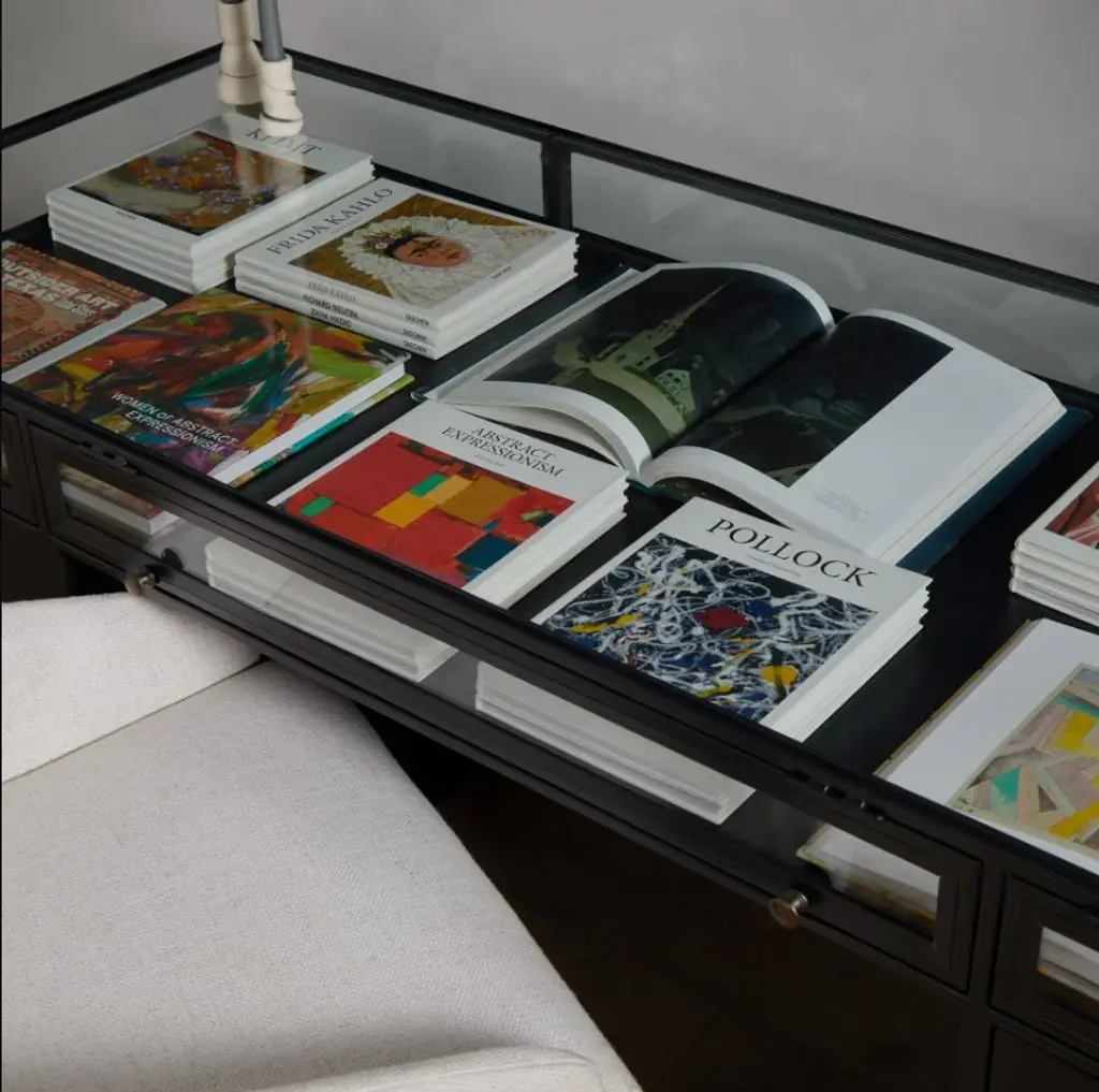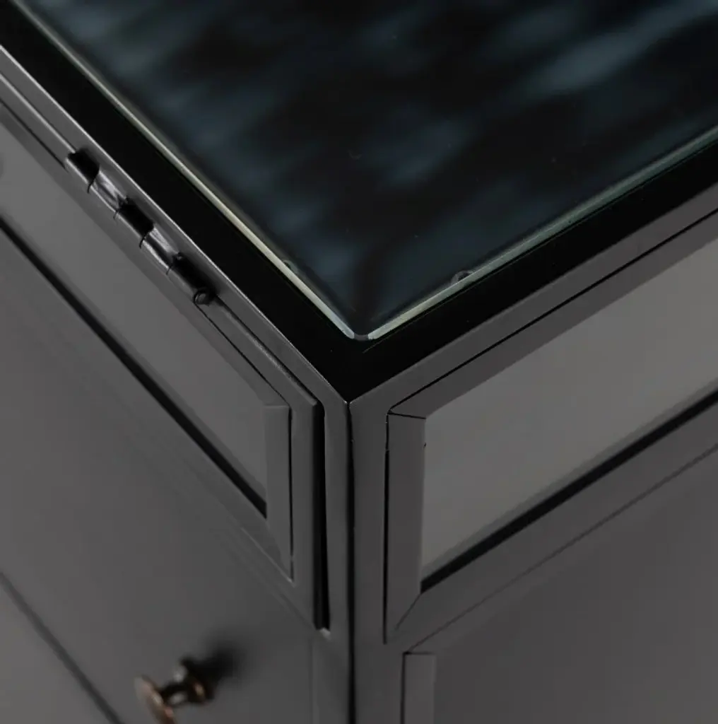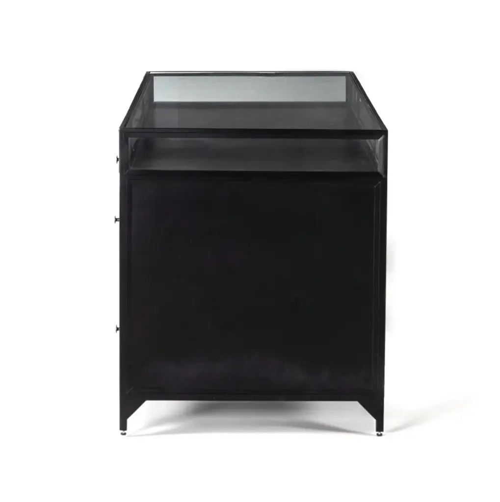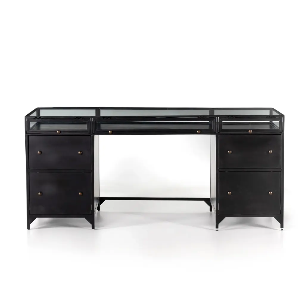 A shadowbox-style desk balances work with play. Display prized possessions in a glass enclosure with matte-black metal and brass knobs. Roomy file drawers for handy storage of legal and letter sized documents.