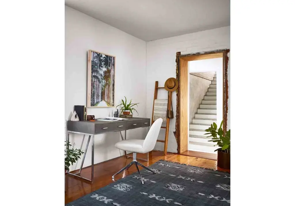 This desk lends a sophisticated look with its faux shagreen top with two pull drawers set on an angular iron base. Its straightforward design lends a fresh, clean look to the bedroom or office. Available in three distinct tops and frames. Each sold separately.