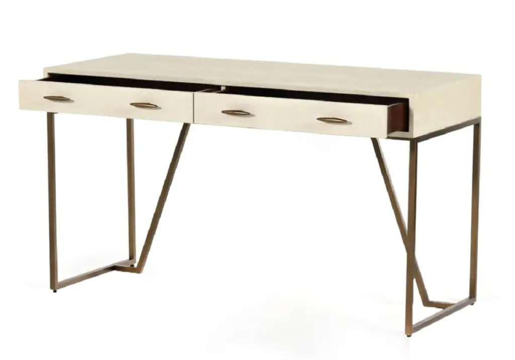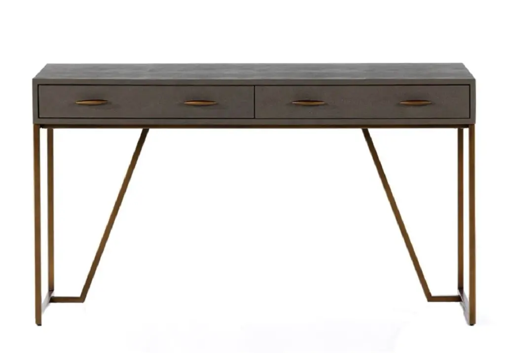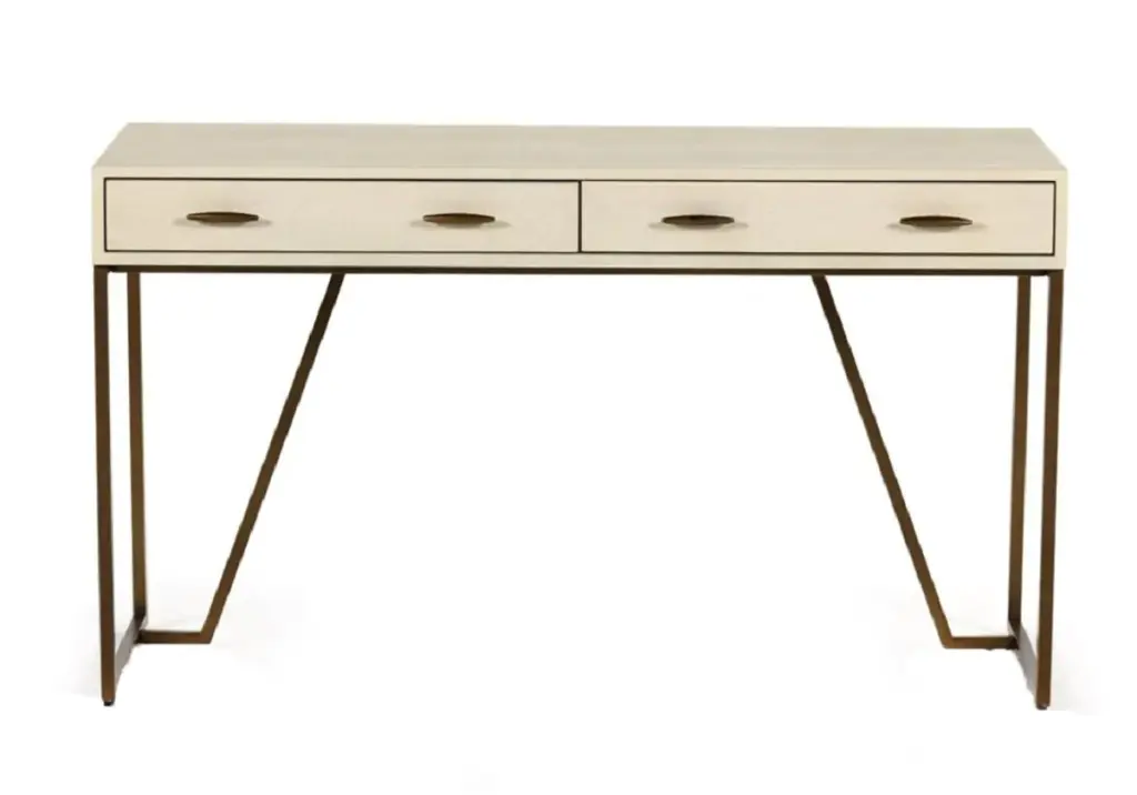 This desk lends a sophisticated look with its faux shagreen top with two pull drawers set on an angular iron base. Its straightforward design lends a fresh, clean look to the bedroom or office. Available in three distinct tops and frames. Each sold separately. Dimensions: 54" W | 22" D | 30.5" H