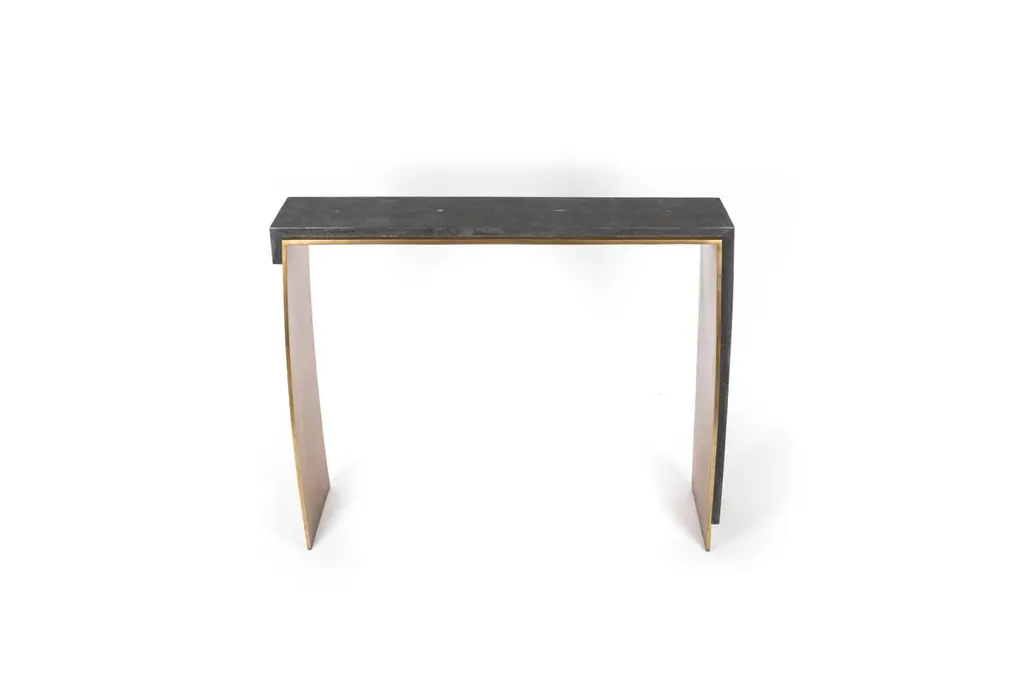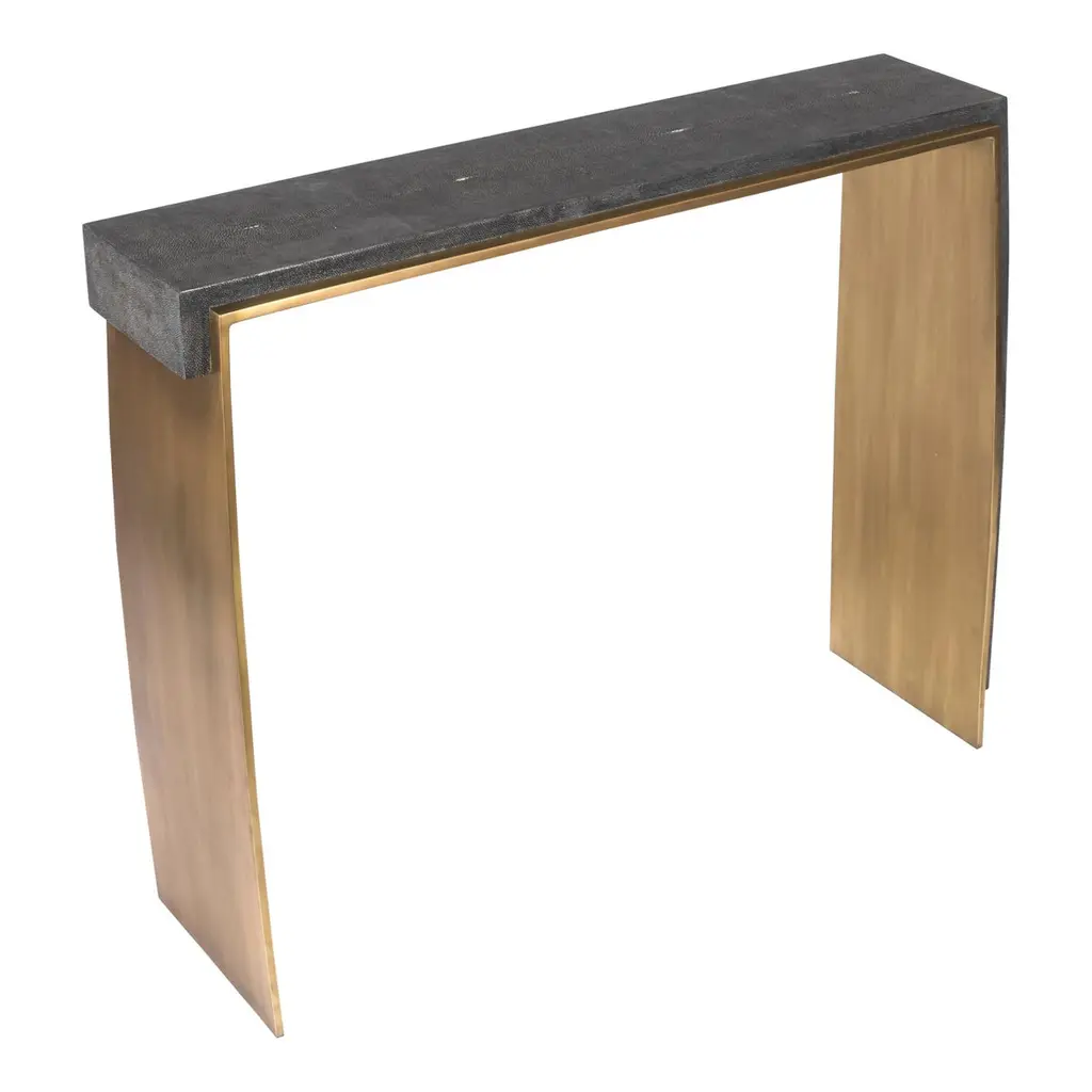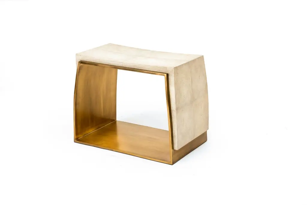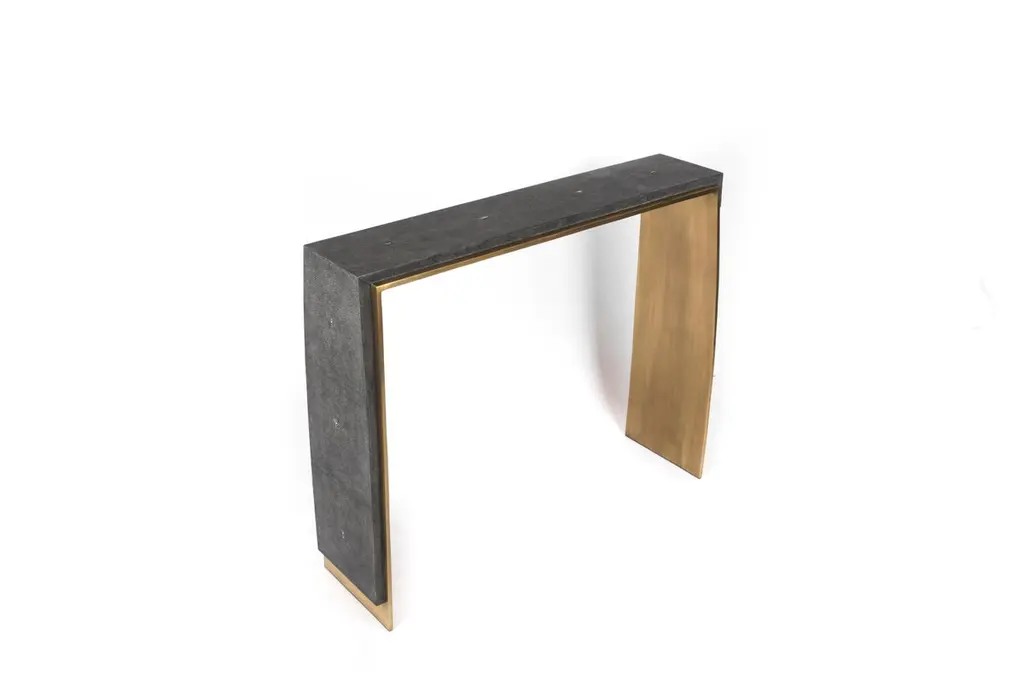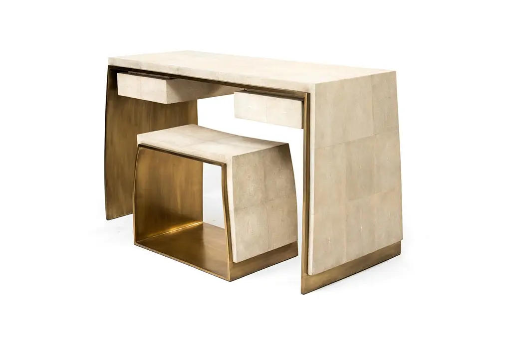 The Paris based label has distinguished themselves since their launch, with their iconic use of shagreen mixed with brass and other exotic materials. All furniture is handcrafted by skilled artisans, ultimately making each piece unique, designed in Paris and produced in the Philippines.The Laurens Writing Desk is both graphic and minimalist with it’s asymmetry overlay of cream shagreen sitting on top of a bronze-patina brass structure. This piece includes 2 drawers and a matching stool is available to purchase separately. A console version is also available, see images at end of slide. Custom color/sizing available on request.The finish of the shagreen is authentic as it is hand-dyed and the designer calls the finish look: "antique natural shagreen."The dimensions of this piece are 49.25" x 22.75" x 29.5"All R&Y Augousti pieces are handmade by artisans, ultimately making each piece unique. Wipe clean with soft dry cloth.Acclaimed design duo Ria & Yiouri Augousti have established themselves since the 1990s as pioneers of modern-vintage style through their luxurious Art Deco inspired collections.The Paris based label has distinguished themselves since their launch, with their iconic use of shagreen mixed with brass and other exotic materials. All furniture is handcrafted by skilled artisans, ultimately making each piece unique. All shagreen-covered items should be kept out of direct sunlight, color variants may occur on the stingray and other exotic finishes, but this showcases the Parisian label's commitment to creating authentic luxurious products using natural components.