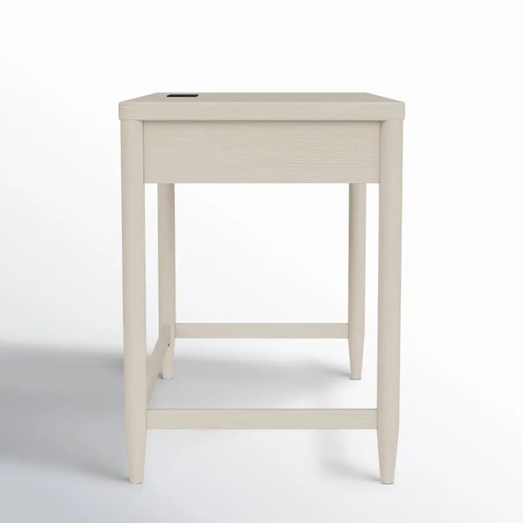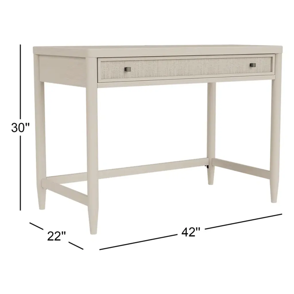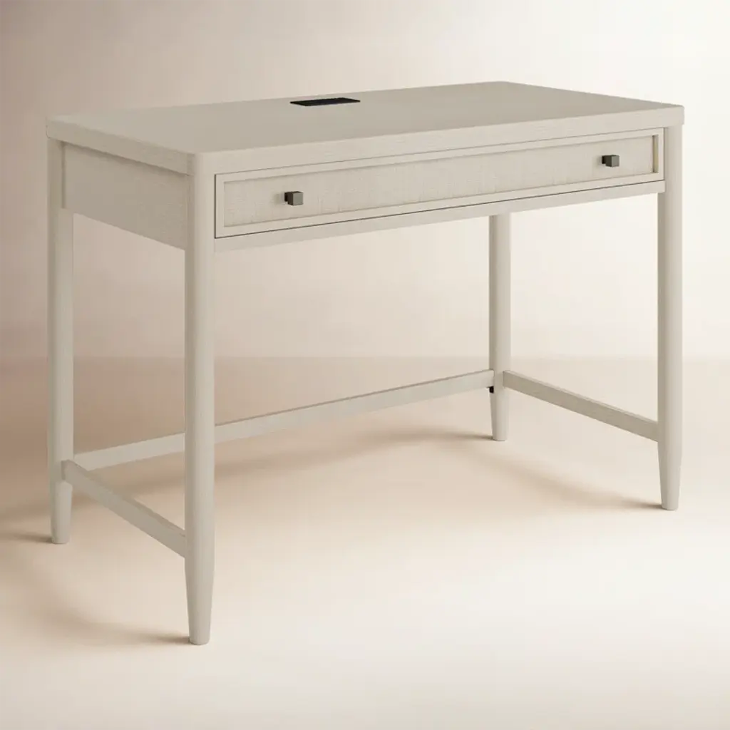 We love the clean lines and breezy grasscloth drawer front of this writing desk. It's made from wood with a white-sand finish that adds a certain brightness to your home office. The drawer runs the width of the piece, giving you room for supplies and making it easy to keep the surface clear for your laptop and coffee mug. Plus, outlets and USB ports keep your devices fully charged and at the ready.